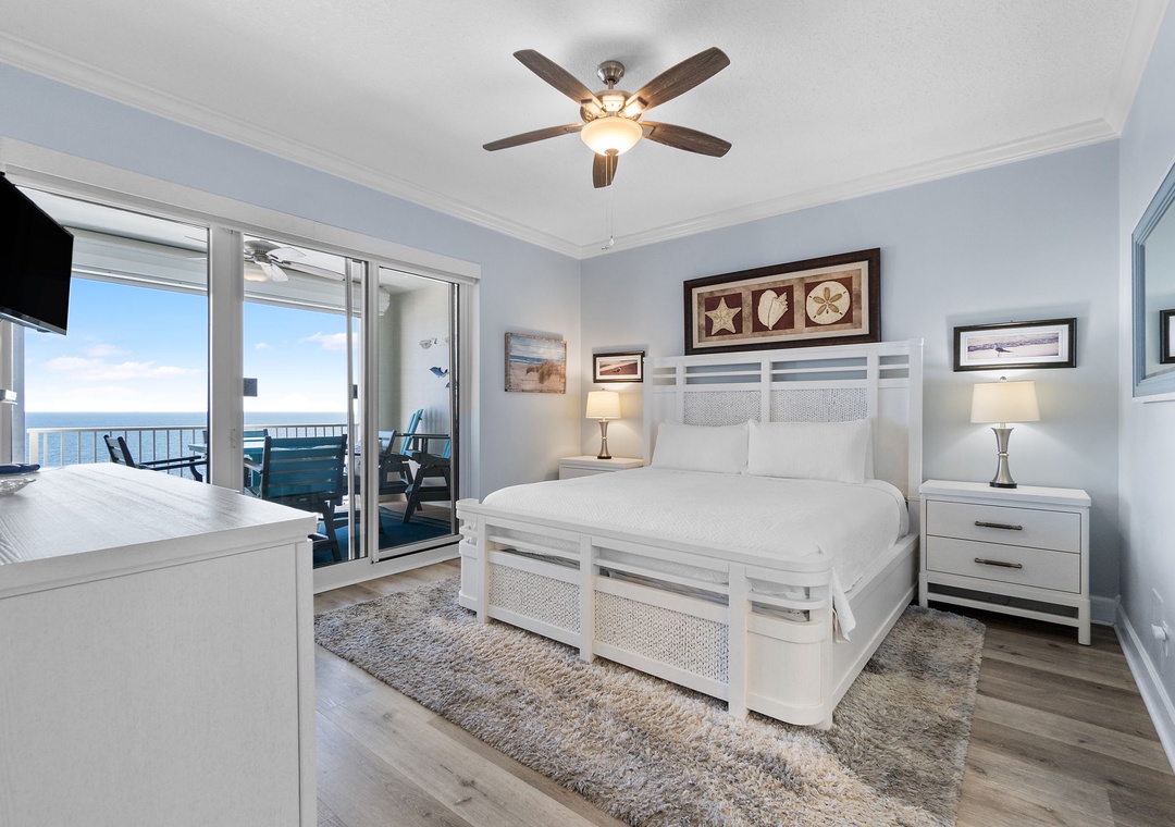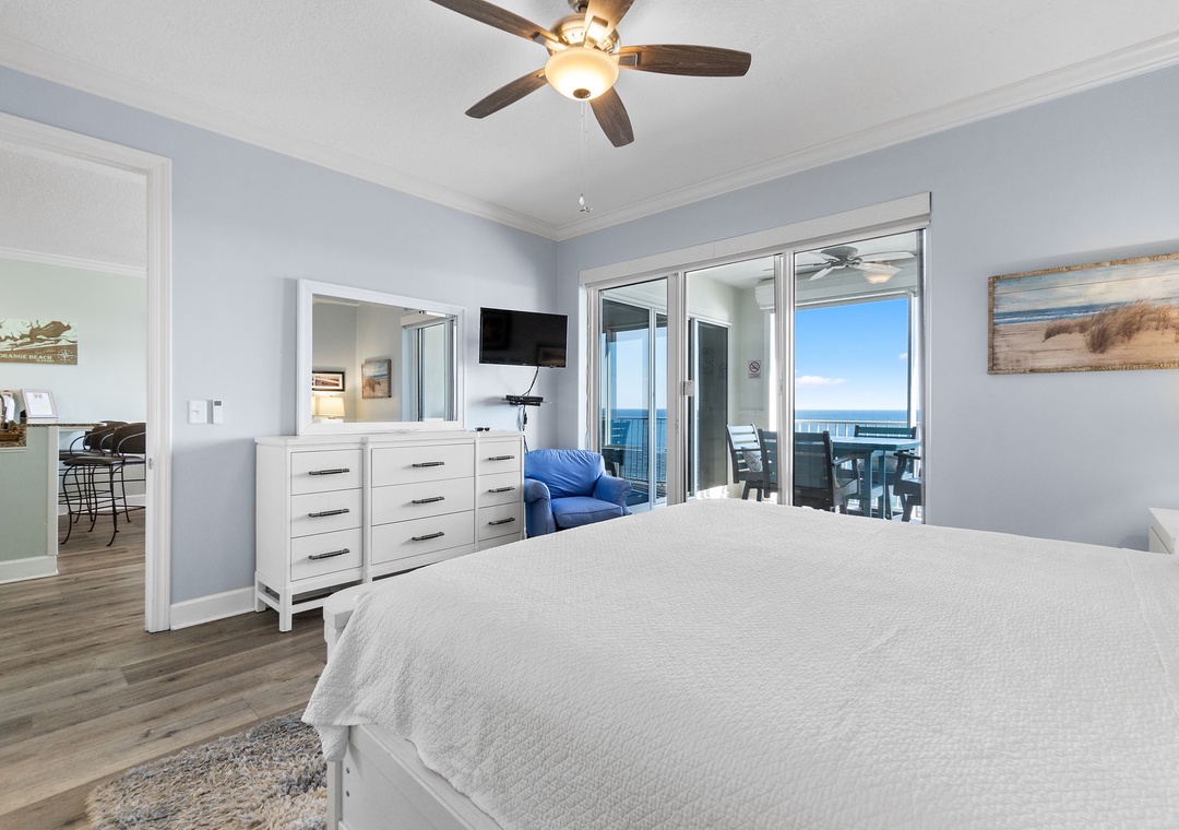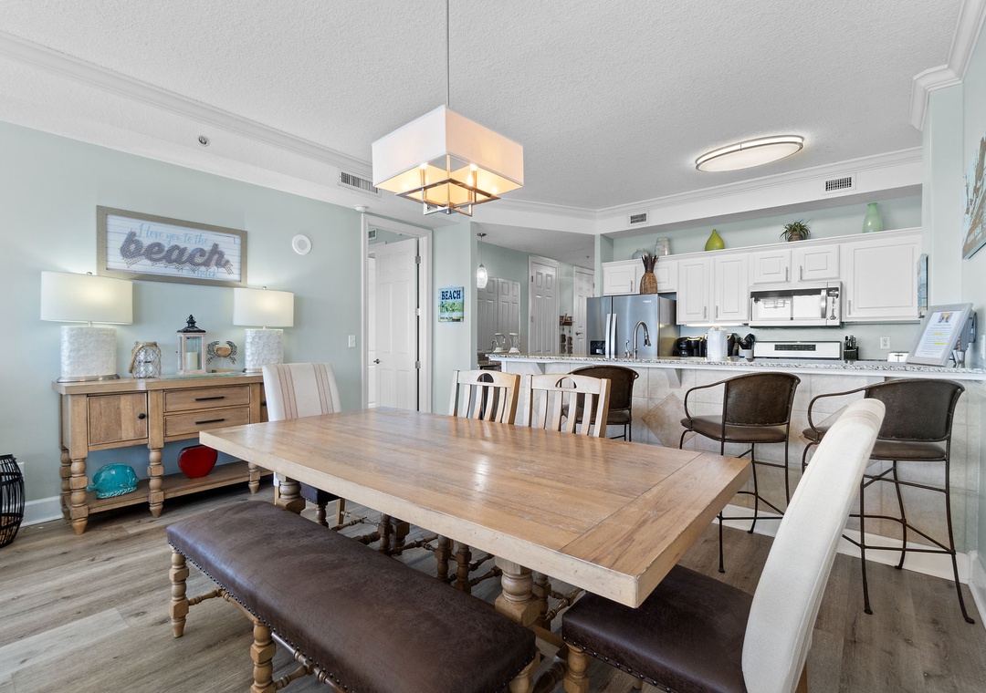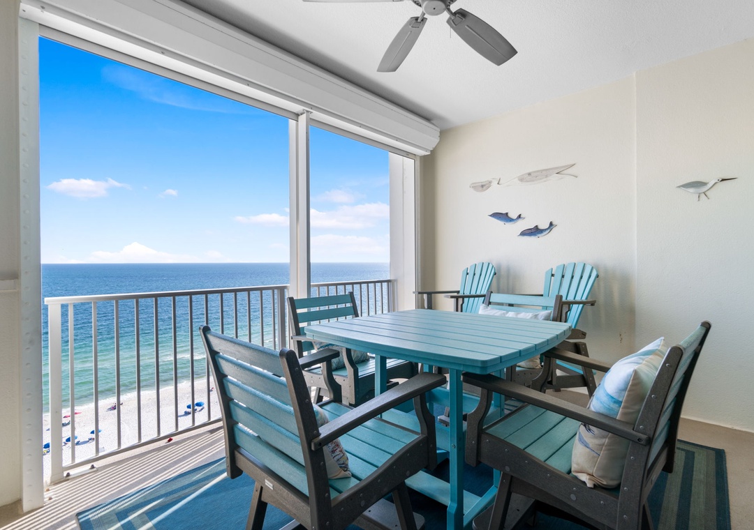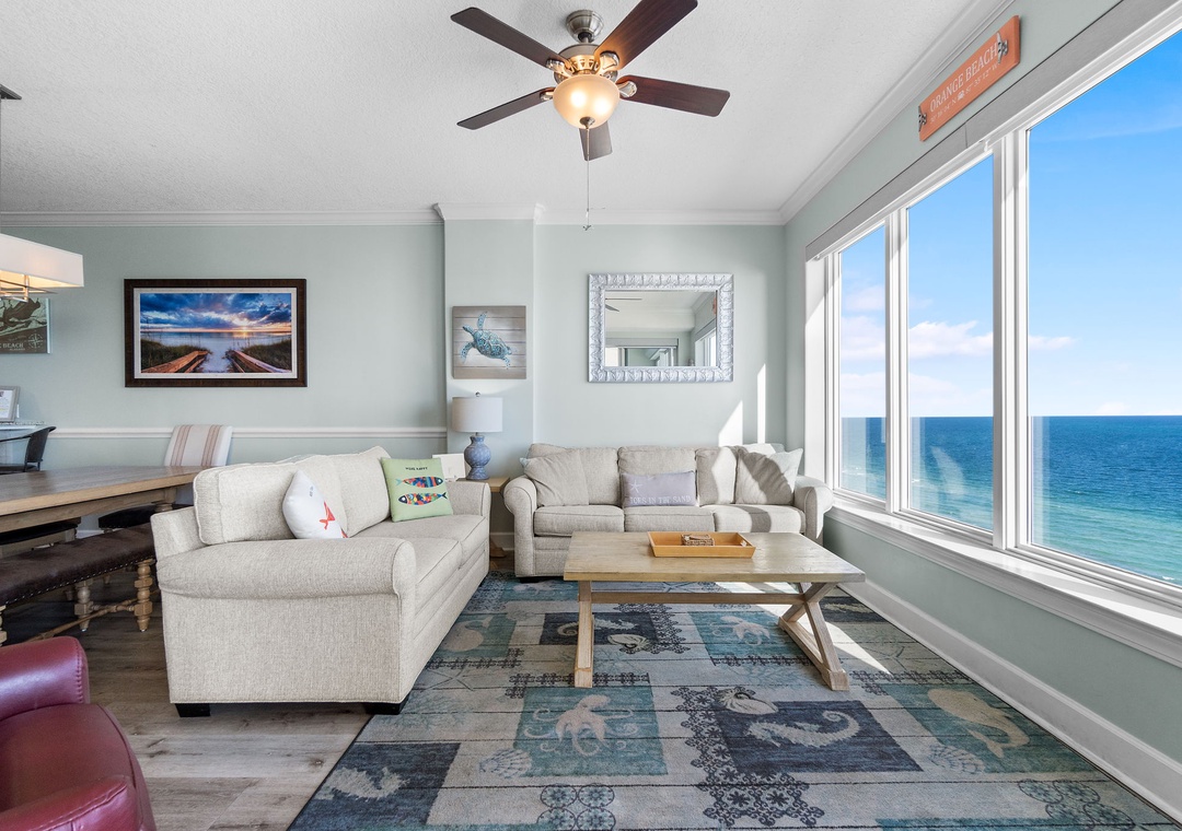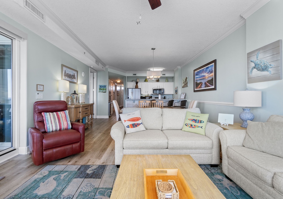 The spacious living area features plush furnishings, updated electronics, and a large flat-screen TV, perfect for movie nights or catching up on your favorite shows. Step through sliding glass doors onto the expansive beachfront balcony, where you can relax with a morning coffee or enjoy a dinner under the stars. With ample seating on the terrace, you’ll have the best spot in the house to take in the views of the Gulf of Mexico while the soothing sound of waves provides a serene soundtrack to your stay.