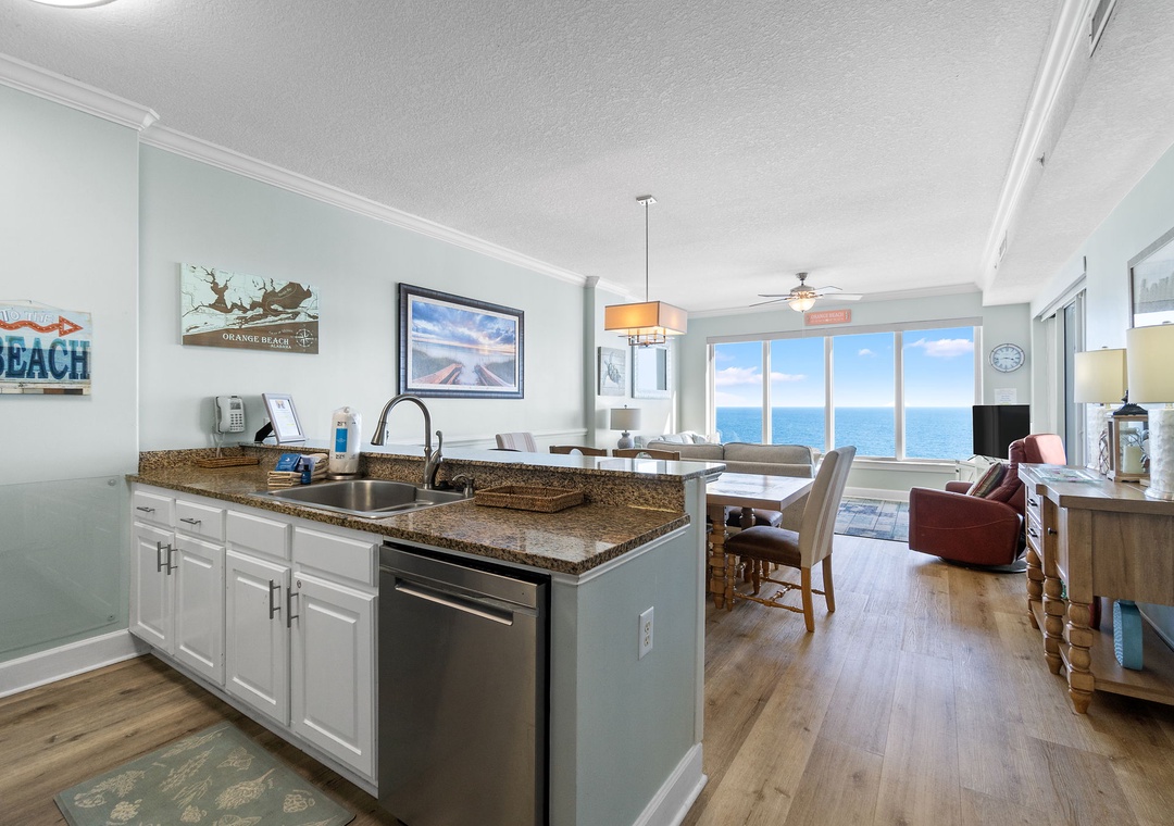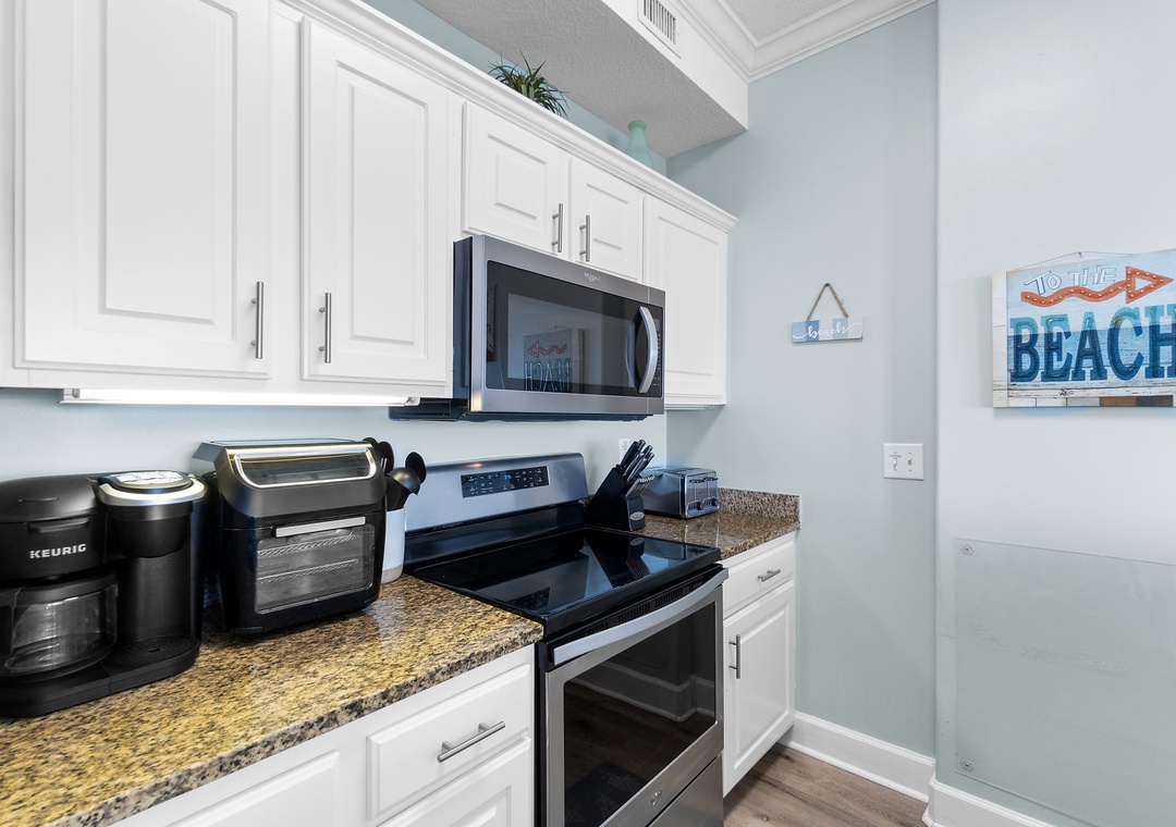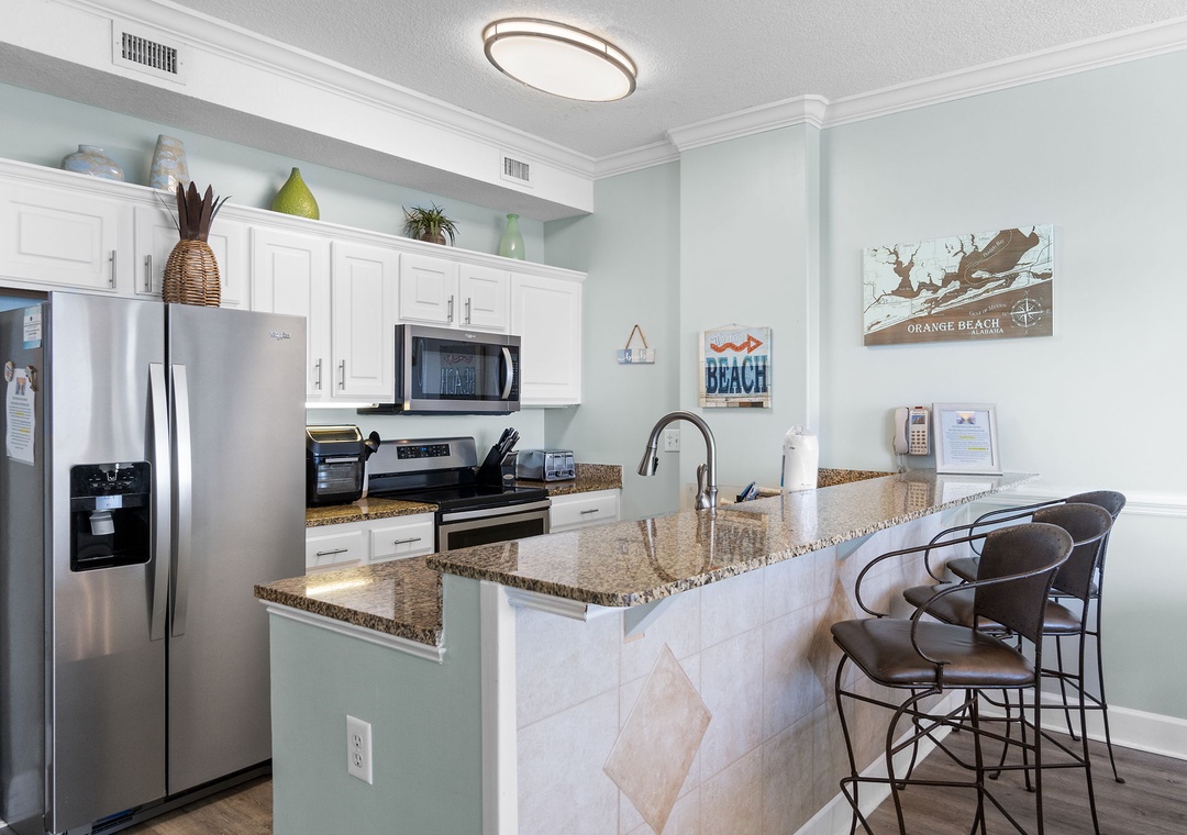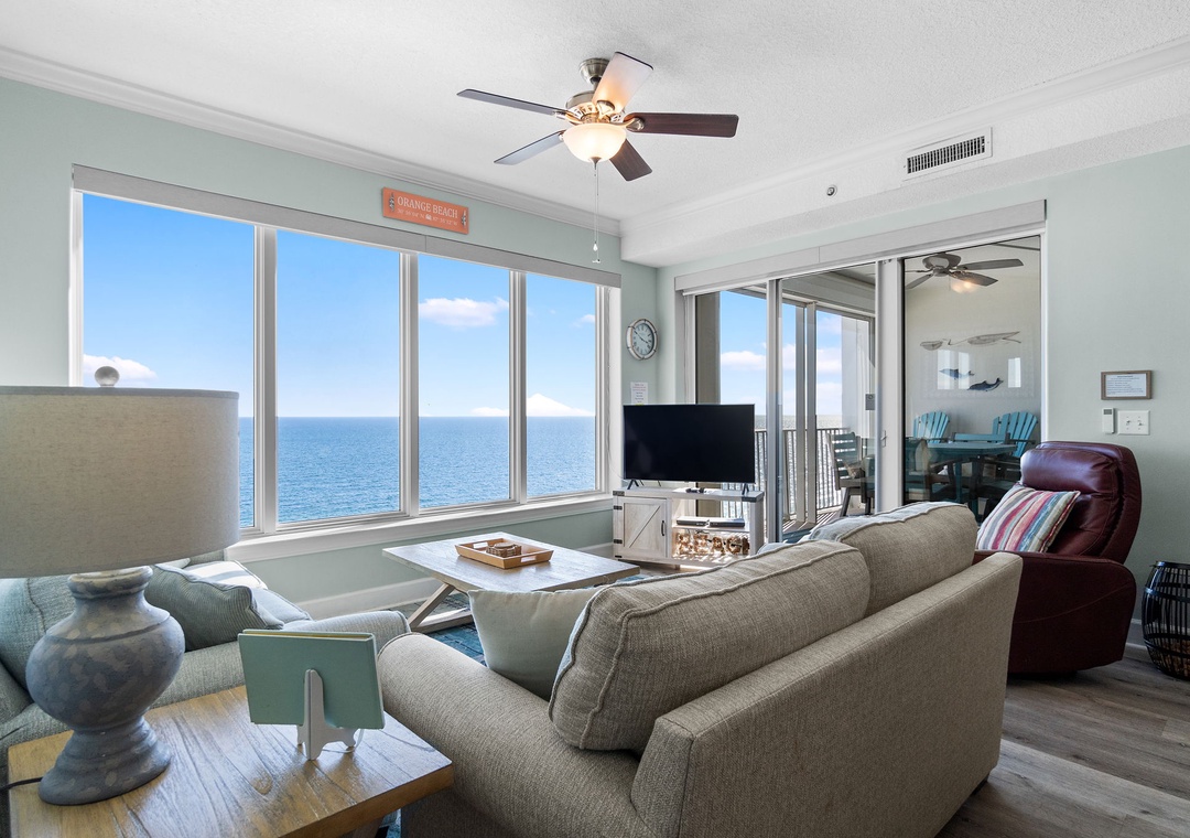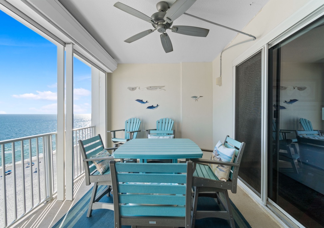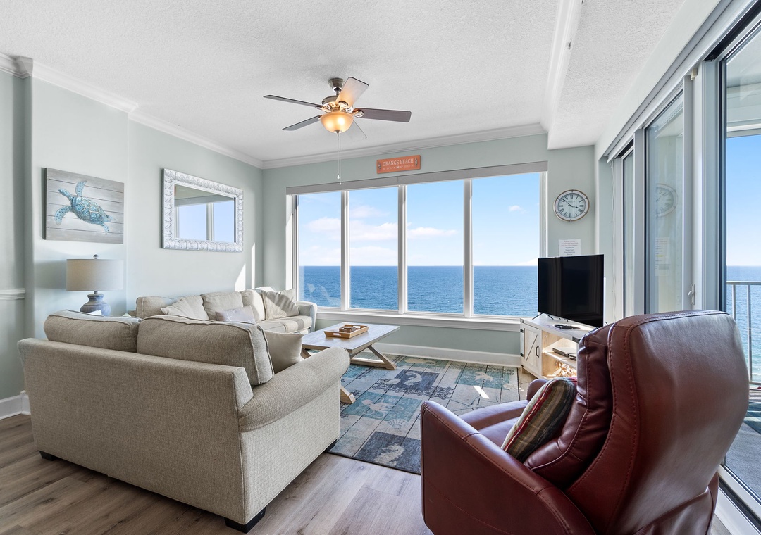 The spacious living area features plush furnishings, updated electronics, and a large flat-screen TV, perfect for movie nights or catching up on your favorite shows. Step through sliding glass doors onto the expansive beachfront balcony, where you can relax with a morning coffee or enjoy a dinner under the stars. With ample seating on the terrace, you’ll have the best spot in the house to take in the views of the Gulf of Mexico while the soothing sound of waves provides a serene soundtrack to your stay.