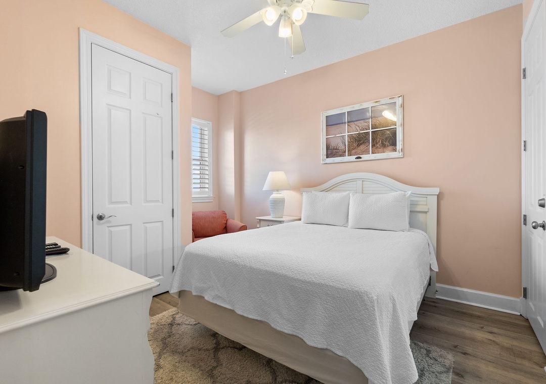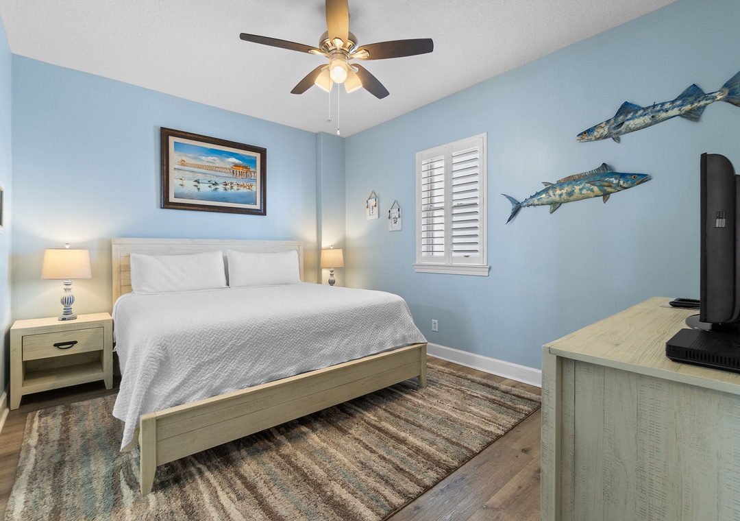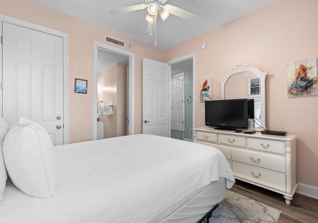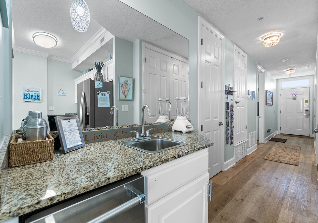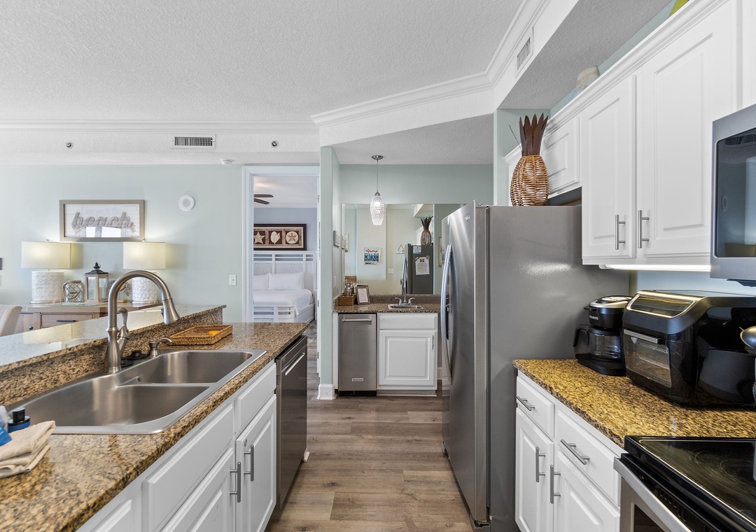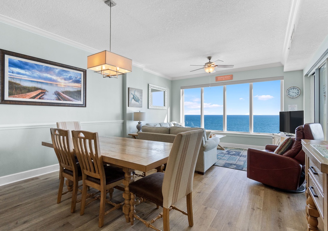 The spacious living area features plush furnishings, updated electronics, and a large flat-screen TV, perfect for movie nights or catching up on your favorite shows. Step through sliding glass doors onto the expansive beachfront balcony, where you can relax with a morning coffee or enjoy a dinner under the stars. With ample seating on the terrace, you’ll have the best spot in the house to take in the views of the Gulf of Mexico while the soothing sound of waves provides a serene soundtrack to your stay.
