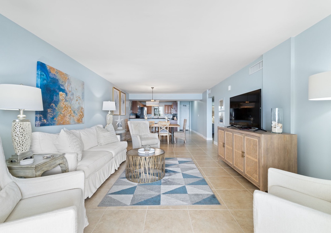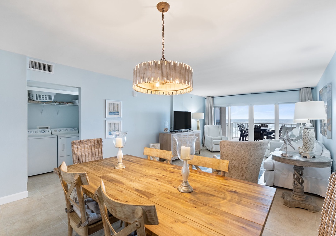 This spacious unit offers an open concept layout connecting the living area, dining area and kitchen into one comfortable space! The living room includes plush sofa seating, including an additional cushioned chair, and most importantly, a beachfront balcony overlooking the glistening Gulf! Enjoy your morning coffee or a glass of wine while lounging on your expansive balcony.