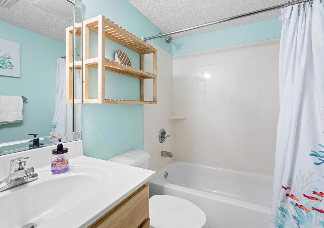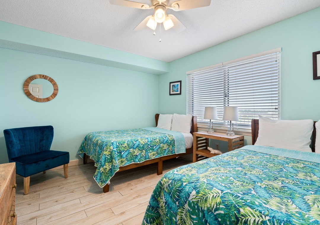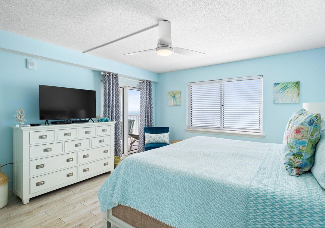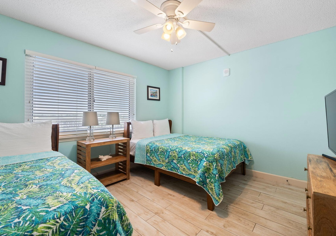 The spacious primary suite features a king-size bed, Smart TV, private balcony access, & an ensuite bath with a jetted tub/shower combo—perfect for unwinding after a day in the sun. A sliding pocket door creates a private guest suite with two full beds & its own spacious bathroom with a shower/tub combo, offering both comfort & privacy for guests. Onsite amenities include two beachfront pools (one heated seasonally), hot tub, fitness center, lighted tennis & pickleball courts, BBQ grills, lawn swings, & direct access to uncrowded, gated beaches