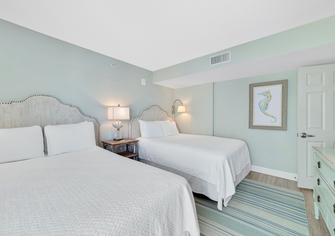 The master bedroom is a true oasis, with a comfortable king bed, balcony access and ensuite glamour bath. The second guest bedroom is equally impressive, with another king bed, and the third bedroom boasts 2 queen beds, affording sleeping space for 8 throughout. Additional unit features include a full size washer and dryer, plush 100% oversize bath towel sets.