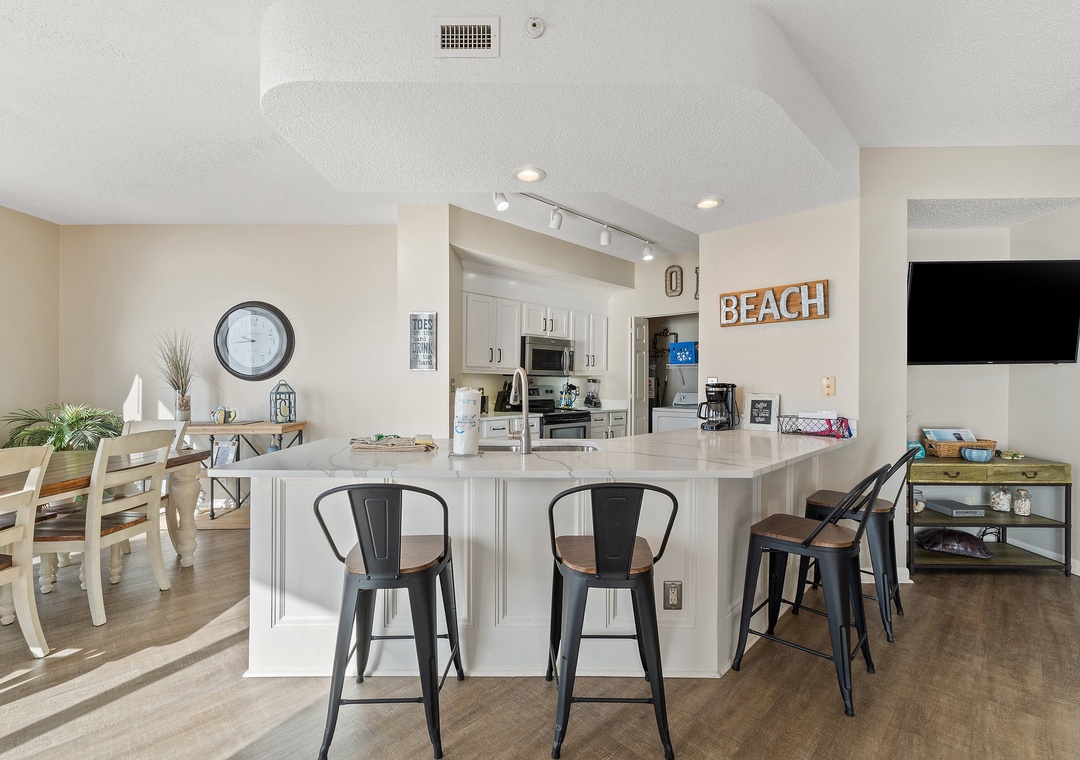 We loved Seachase 404E. The decor was very chic and comfortable. The layout of the condo was nice and the view of the ocean was breathtaking from the kitchen, living space and master. It was nice the whole time we were there, so we just turned the air off and kept all the sliding doors open because our 3-year-old wanted to "hear the sound of the tides!" The lobby and outdoor amenities were super clean and very convenient for the little ones and bathrooms were easily accessible from the pools which is a minor detail, but we have a little one a few months out of potty training! We have definitely saved this as a favorite!