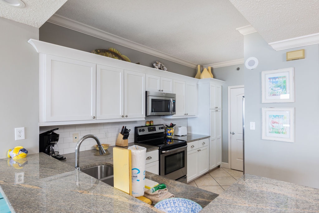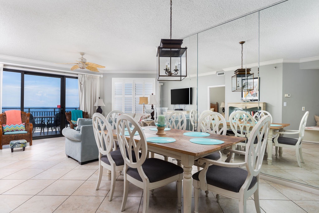 Embark on a dream vacation at SeaChase 404W, our exquisite 2-bedroom, 2-bath rental in sunny Orange Beach, Alabama. Nestled on the pristine Gulf Coast, this resort is a sought-after destination, offering an idyllic location and abundant amenities for an unforgettable experience. The gourmet kitchen, adorned with granite countertops and custom cabinetry, boasts stainless steel appliances and all the essentials for culinary excellence. Start your day at the breakfast bar and enjoy dinner at the wooden dining table, offering seating for six with a view of the changing sky.