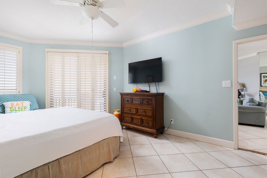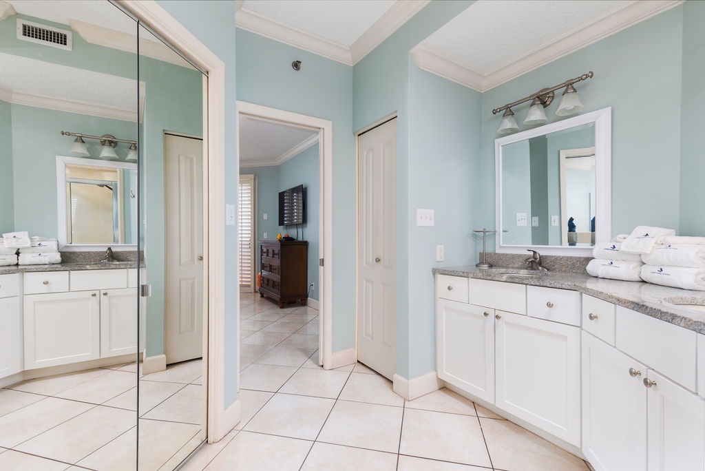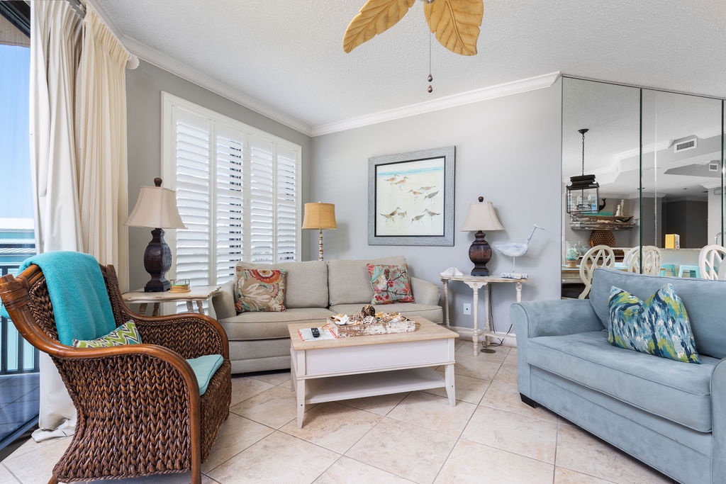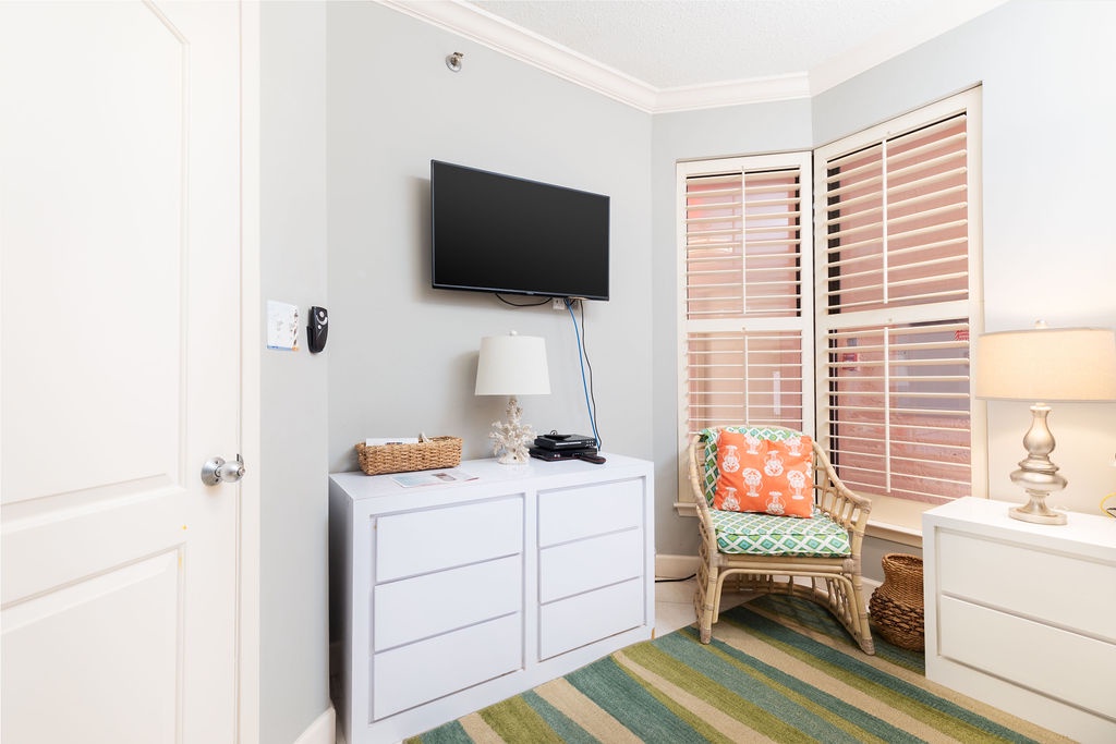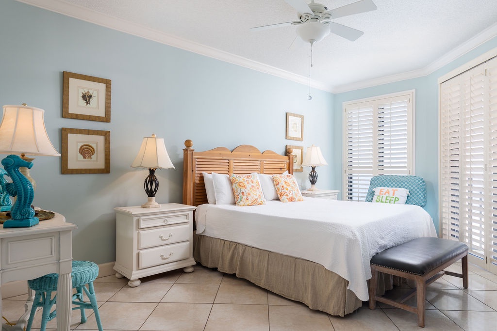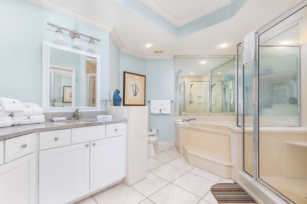 Designed for relaxation, the bedrooms provide a luxurious retreat. The master bedroom features a plush king bed, beachfront balcony access, and an ensuite glamour bath with an elevated jetted tub, walk-in shower, and his-and-her sinks. The guest bedroom offers full-size bunk beds, and the living room sofa converts into a queen sleeper, accommodating up to 10 guests. Immerse yourself in the beach-chic ambiance of this condo—book now for a blissful and memorable escape.