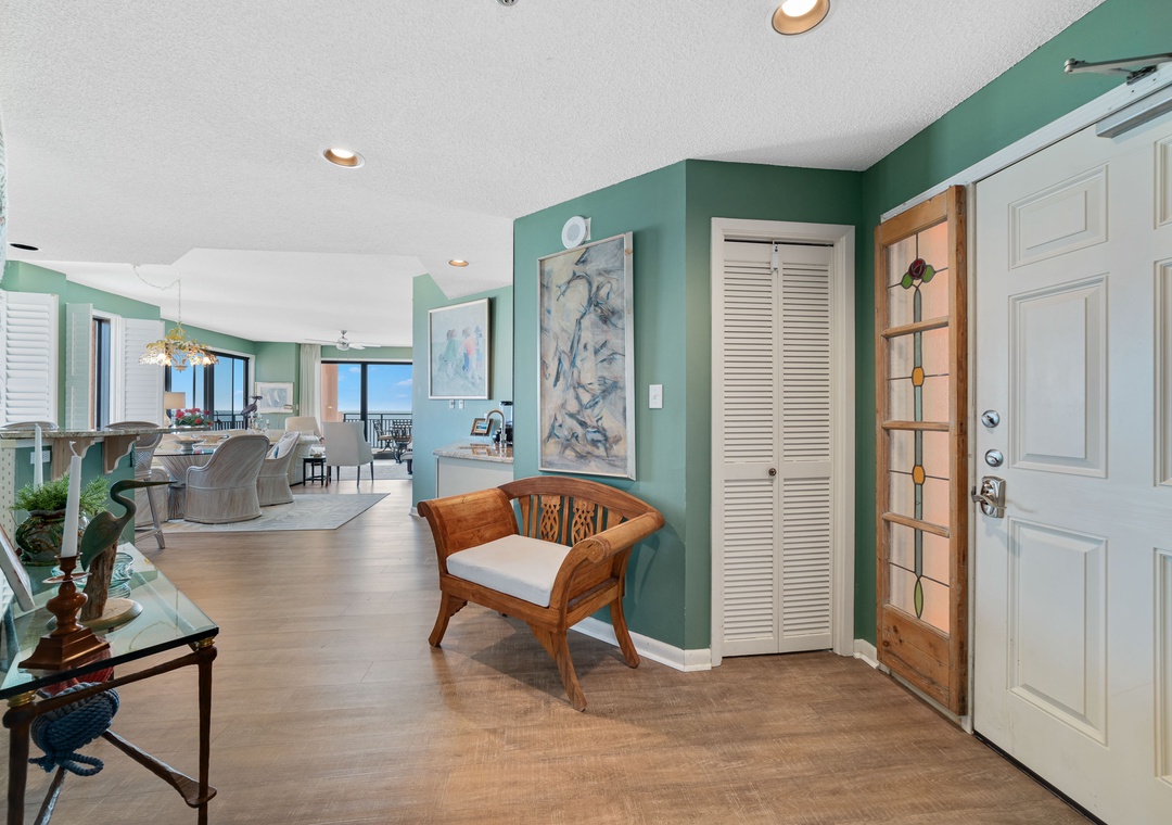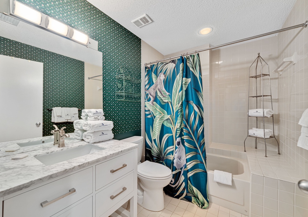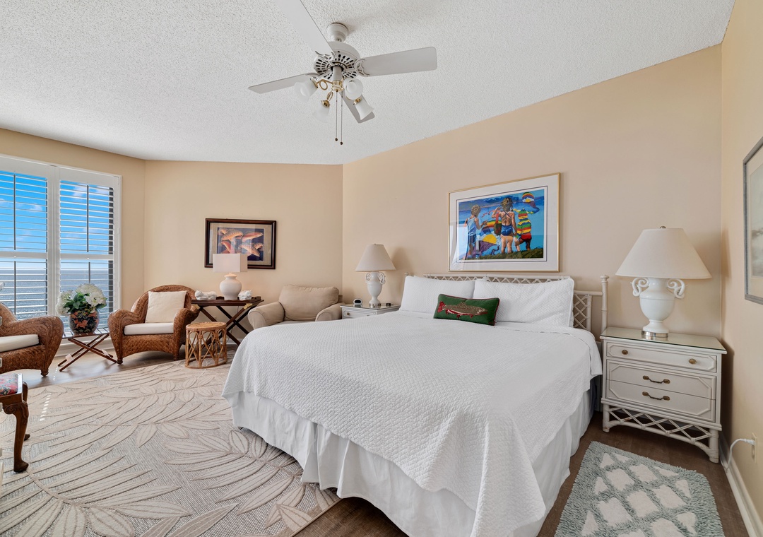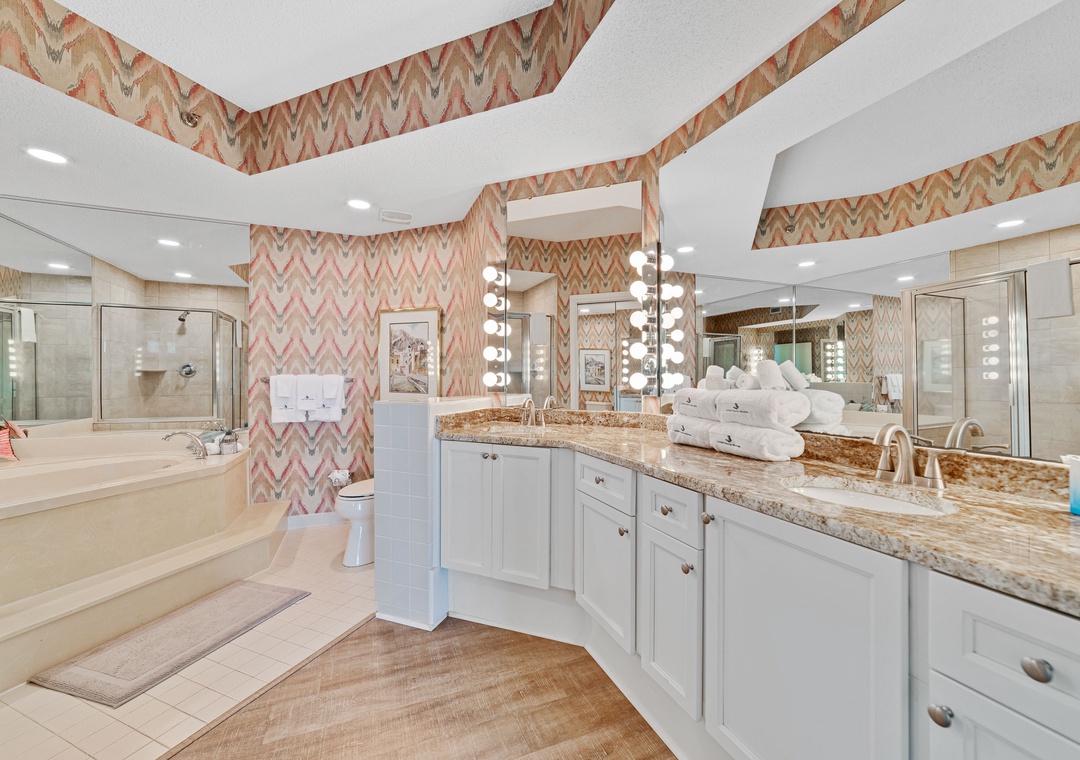 Retire to one of 3 spacious and luxuriously appointed bedrooms for some serious shuteye during your long-awaited vacation, each offering premium mattress sets, high thread-count linens and posh bedding. The master bedroom offers balcony access and a large glamour bath with a huge, jetted tub, separate walk-in shower, double vanity, and plush 100% cotton oversize monogrammed bath towel sets. The primary and second bedroom each offer a king bed while the third bedroom includes 2 twin beds, which comfortably accommodates 6 guests in total!