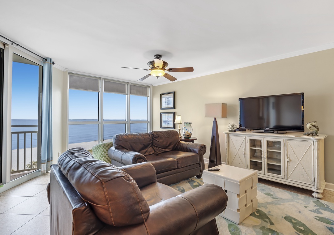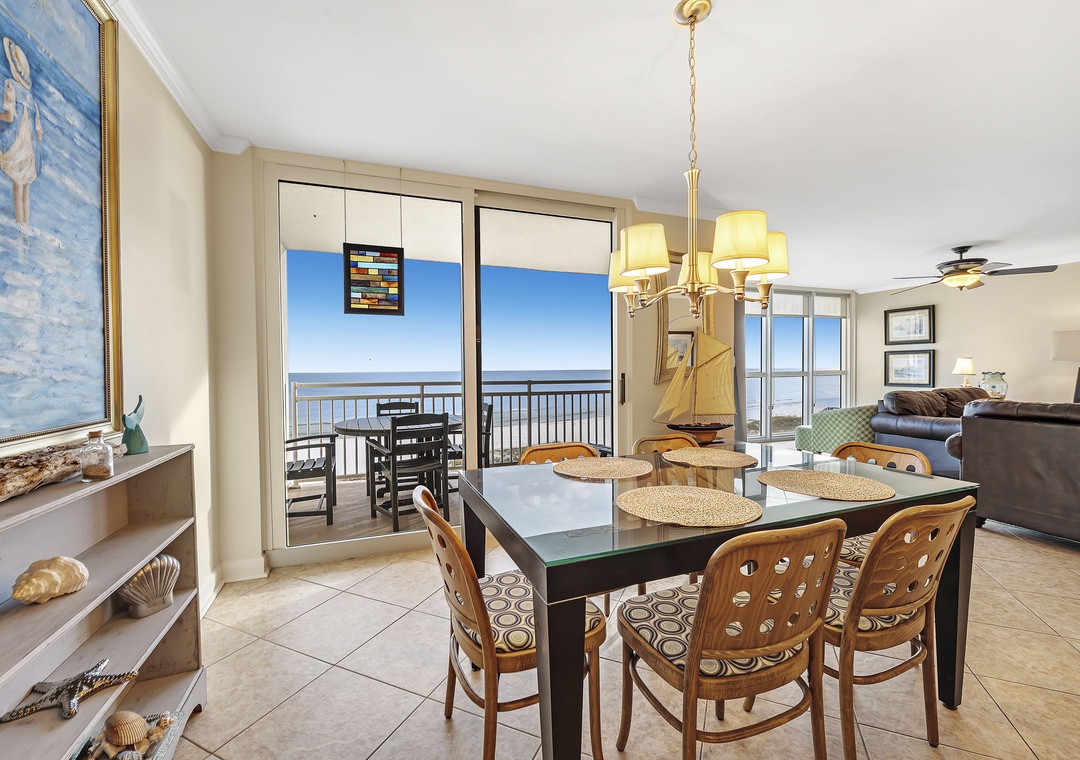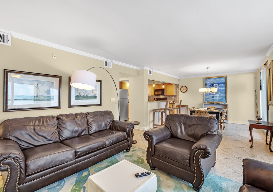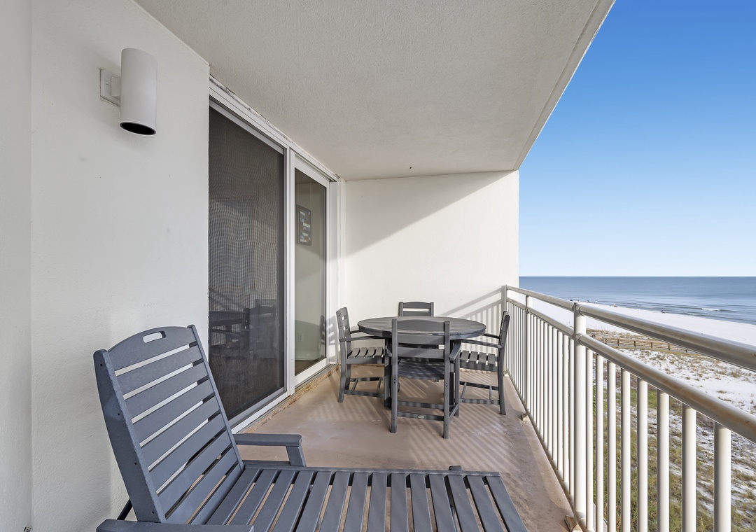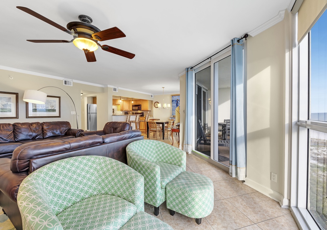 The living room offers plenty of seating where the whole family can lounge, not to mention the sliding glass doors that lead out to the expansive covered beachfront balcony! Wake up and sip your morning coffee while the sun rises over the Gulf, or even enjoy an alfresco dinner under the stars while the tranquil sound of the waves relaxes your senses and calms your mind!