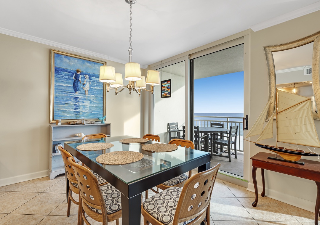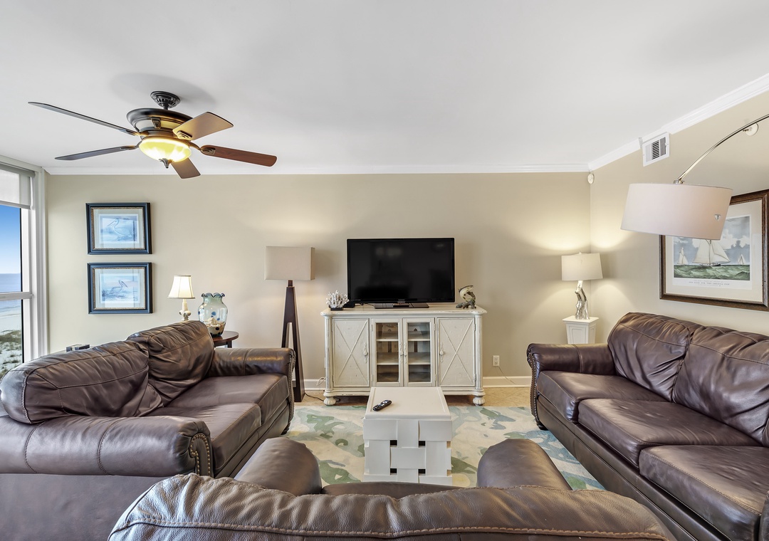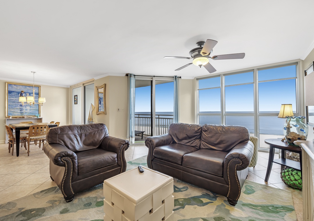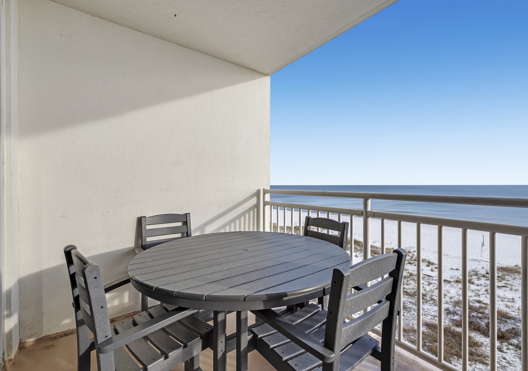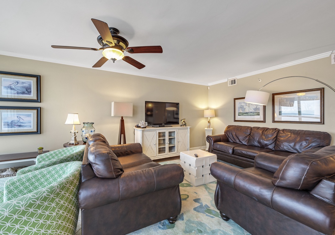 The living room offers plenty of seating where the whole family can lounge, not to mention the sliding glass doors that lead out to the expansive covered beachfront balcony! Wake up and sip your morning coffee while the sun rises over the Gulf, or even enjoy an alfresco dinner under the stars while the tranquil sound of the waves relaxes your senses and calms your mind!