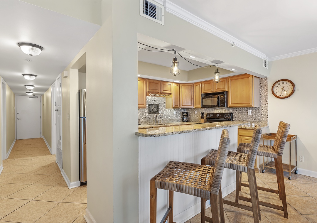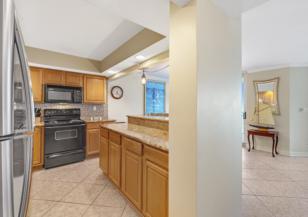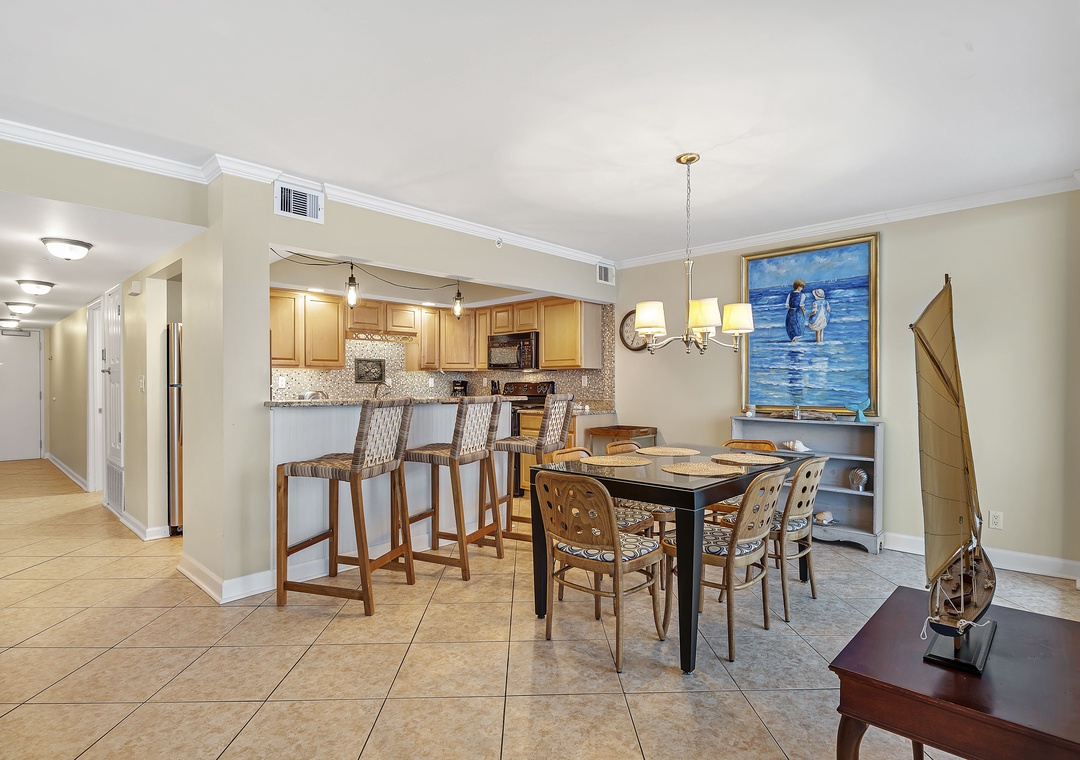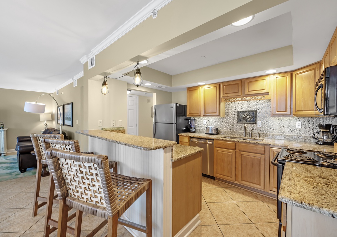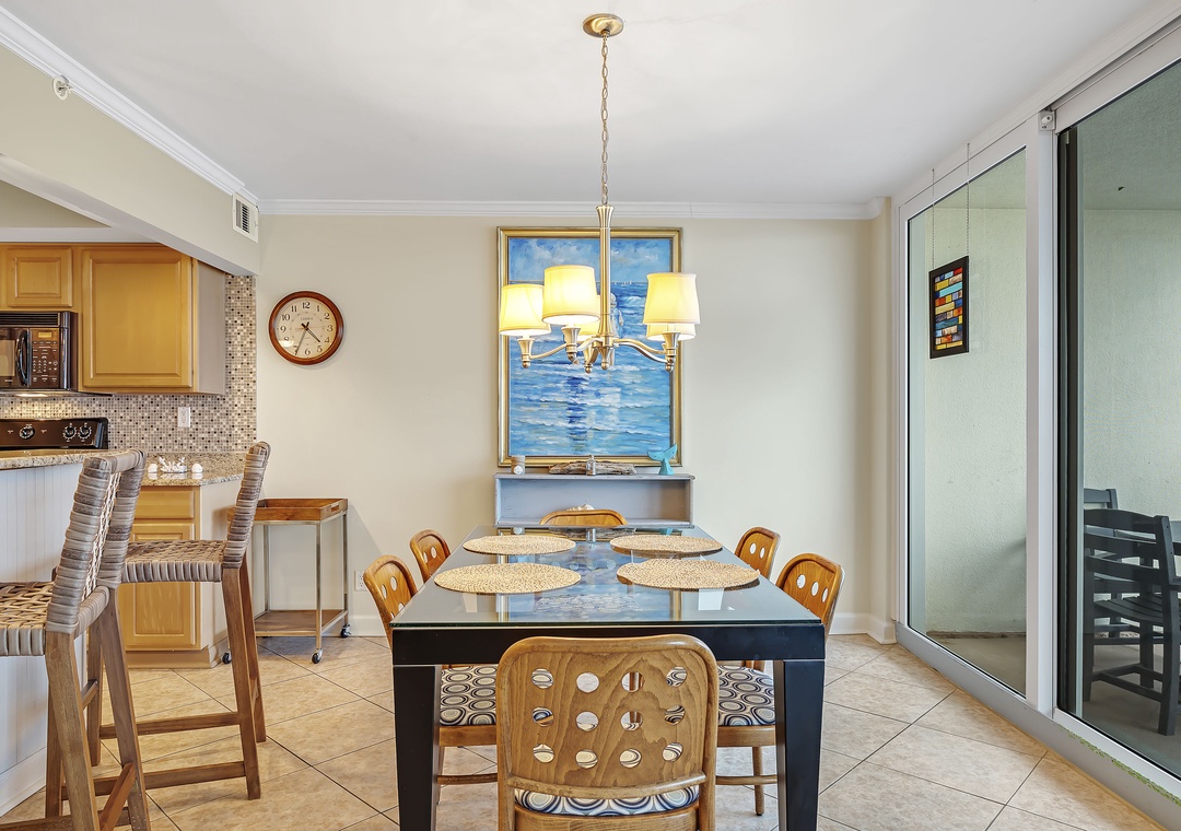 The living room offers plenty of seating where the whole family can lounge, not to mention the sliding glass doors that lead out to the expansive covered beachfront balcony! Wake up and sip your morning coffee while the sun rises over the Gulf, or even enjoy an alfresco dinner under the stars while the tranquil sound of the waves relaxes your senses and calms your mind!