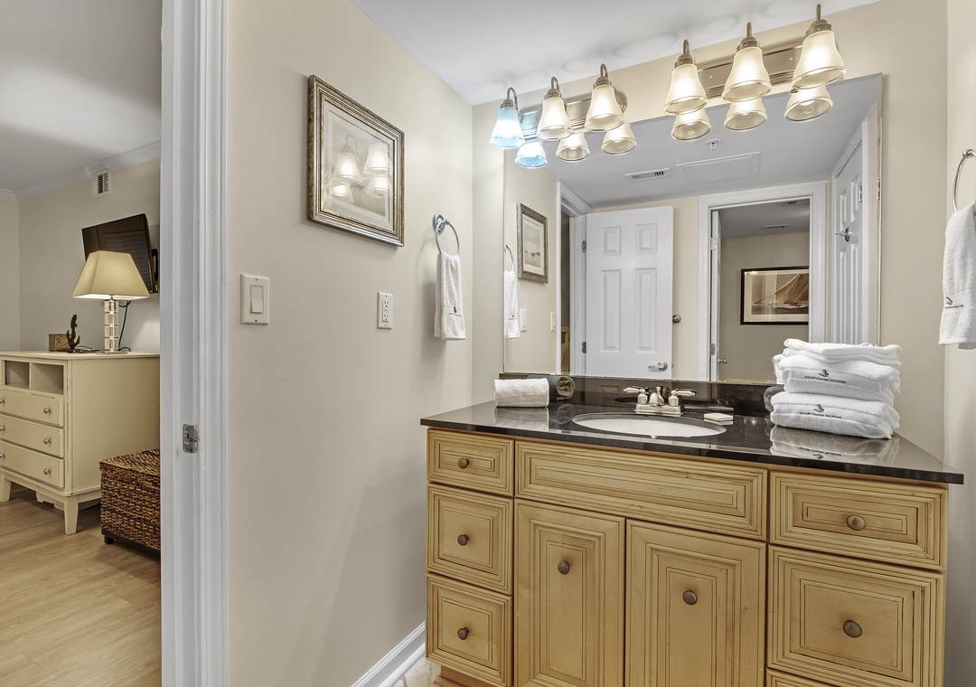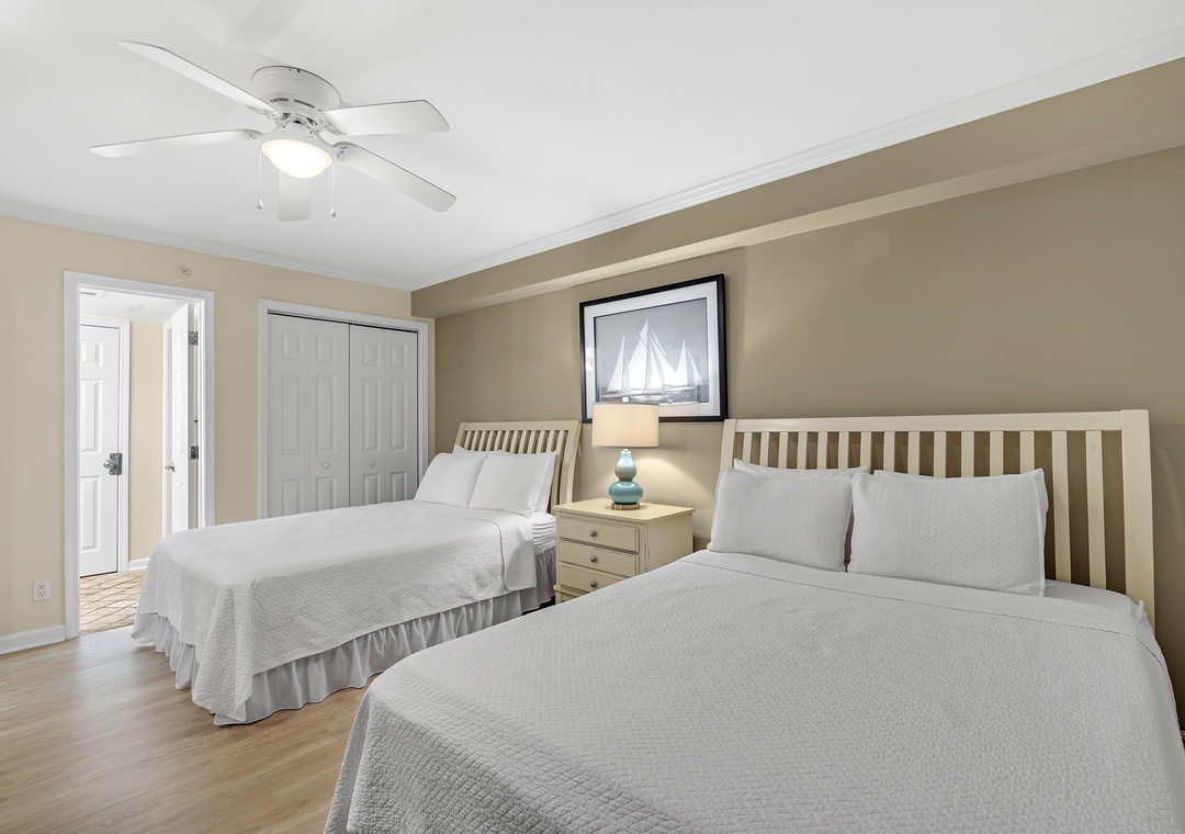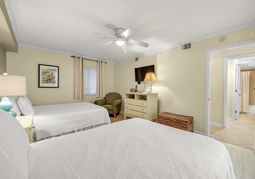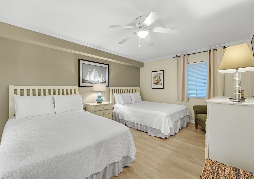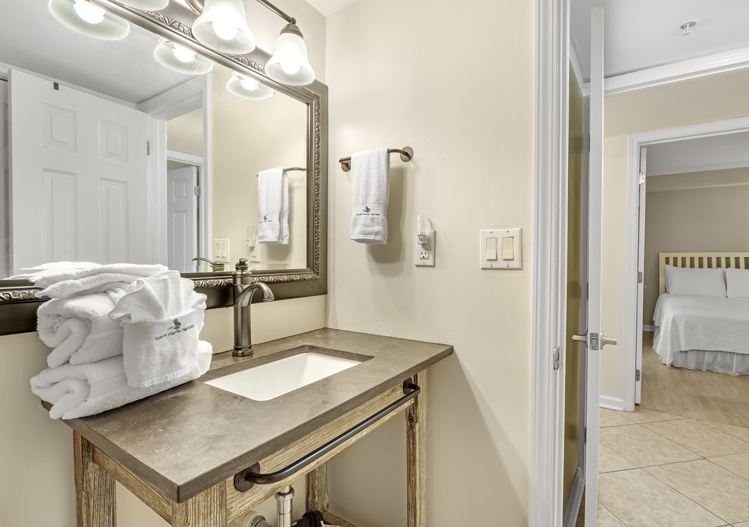 Retire after a long day of recreation to one of 2 luxuriously appointed bedrooms and catch some serious zzz's! Pamper yourself after a day on the beach in the master bedroom, complete with a king bed, an attached bath, and fluffy 100% cotton oversize bath towel sets. With premium queen and full mattress sets in the 2nd bedroom, high thread-count linens and posh bedding, you're sure to enjoy quality rest and relaxation during your much deserved beach getaway.