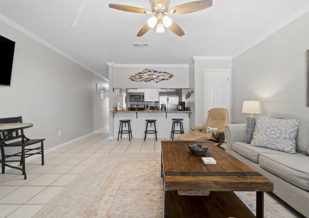 With 768 square feet of space, Shore Break is a cozy yet spacious oasis, ideal for a romantic getaway or a small family vacation. As you step inside, you'll be greeted by a welcoming living area adorned with tasteful decor and a relaxing ambiance. The living room features a comfortable sleeper sofa, allowing additional guests to enjoy a good night's rest while staying here.