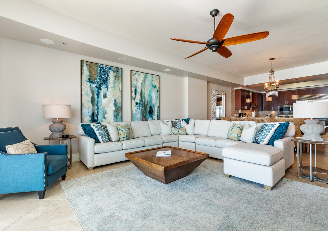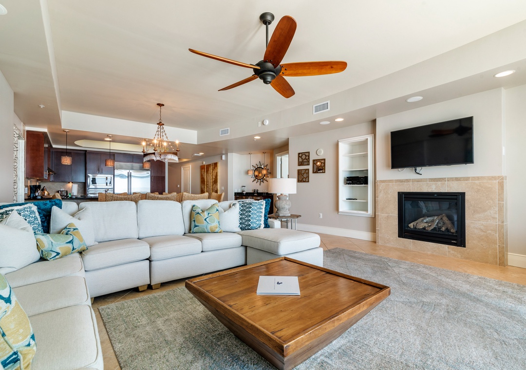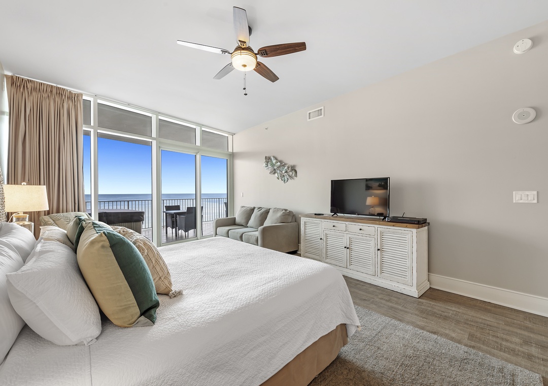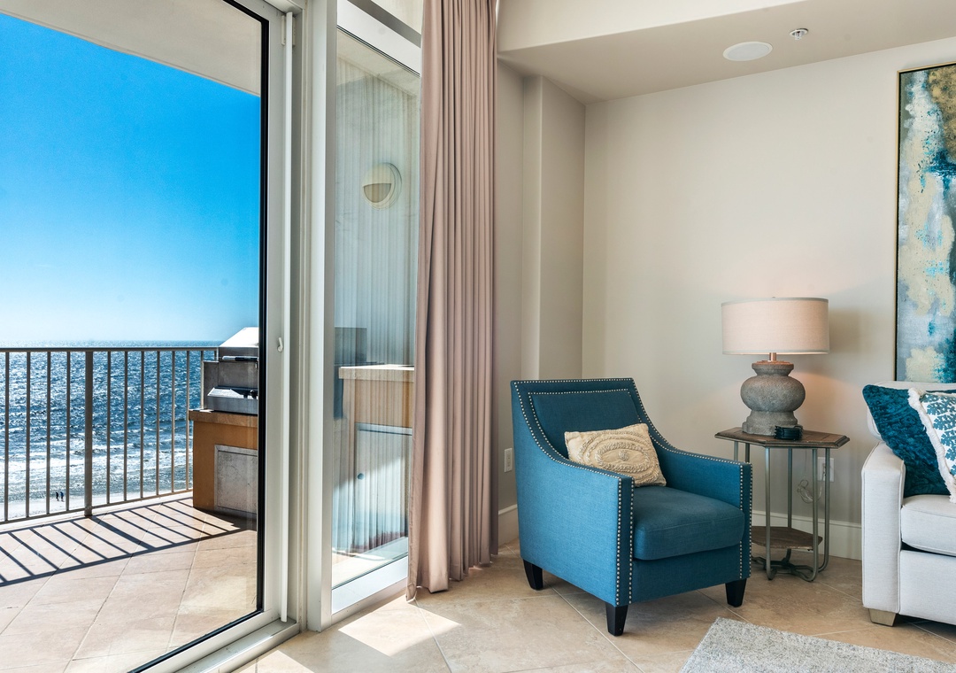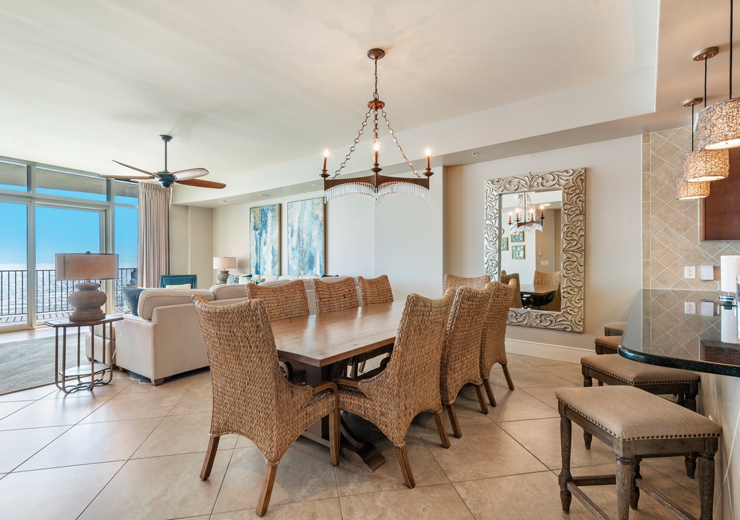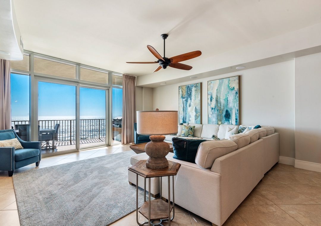This stunning unit offers over 2400 square feet of living space, featuring an open floor plan and beautiful glass windows spanning from the floor all the way up to the sprawling 10 foot ceilings. The living area is teeming with natural light and feels as though the beach is cascading right into the unit! Adorned with a soft and soothing color palette and contemporary décor, this professionally decorated unit features an oversized L-shaped sectional sofa, 4 plush chairs and an enormous wall-mounted HD television!