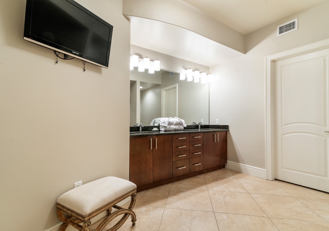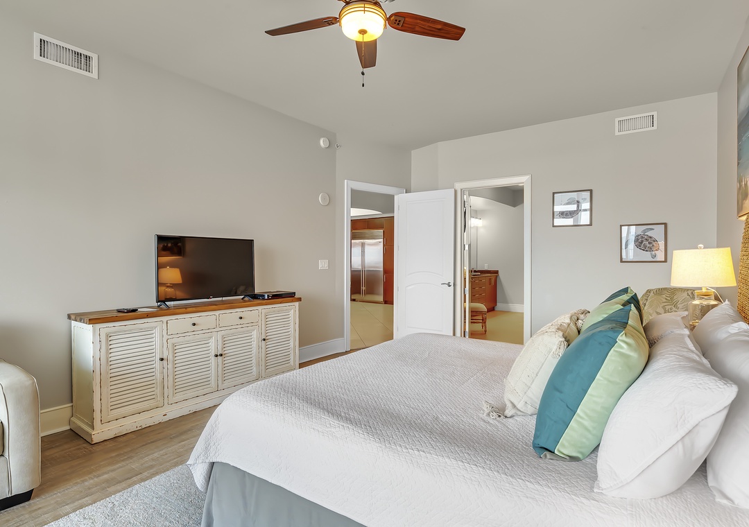 You’ll feel like royalty when you step into the master suite, which hosts a king bed with luxurious bedding and linens, a seating area with a table and two chairs, and an LCD television and beachfront balcony access. The attached glamour bath features a massive jetted tub, separate glass and tiled shower, his-and-her vanities and even a wall-mounted flat screen! The second and third bedrooms also offer a king bed and LCD television, and every bedroom hosts premium mattresses. The sectional sofa in the living area can be converted into a queen sleeper sofa, and there are sleeper sofas in the master and 2nd bedroom as well, affording sleeping accommodations for up to 12 throughout! There are two full private baths attached to the additional bedrooms, plus a half-bath for guests.