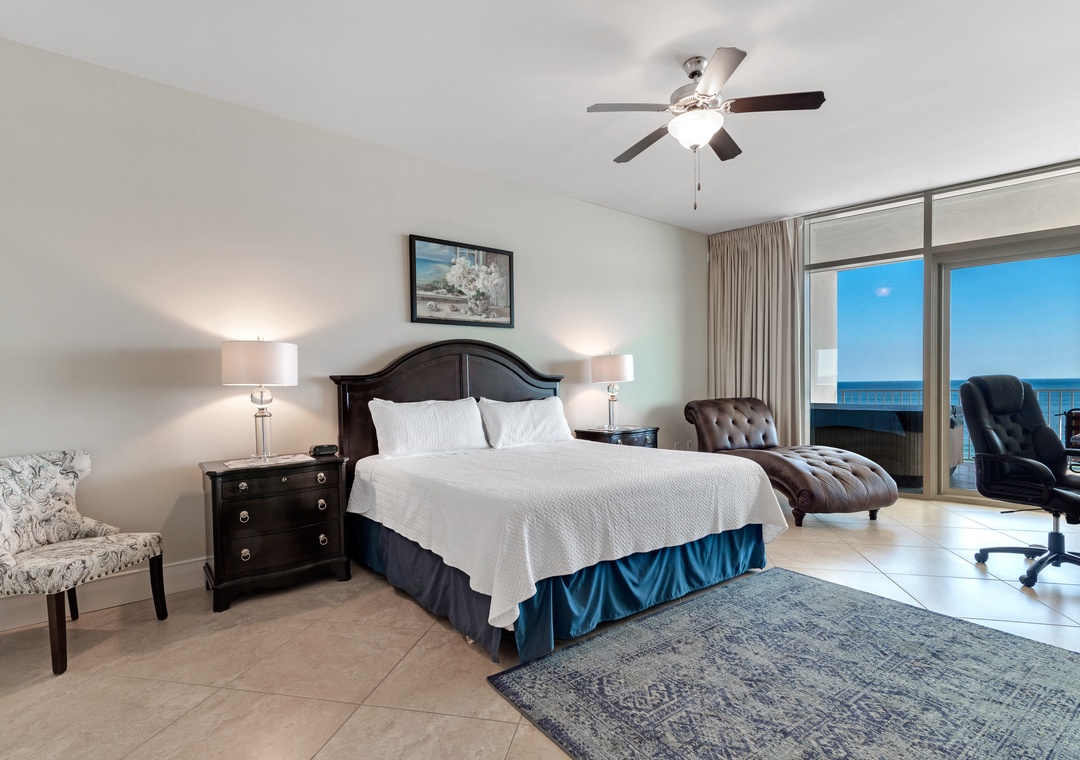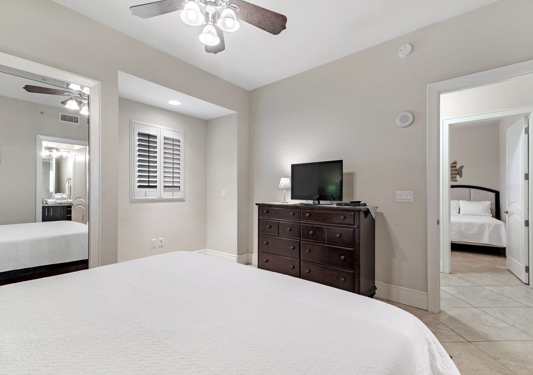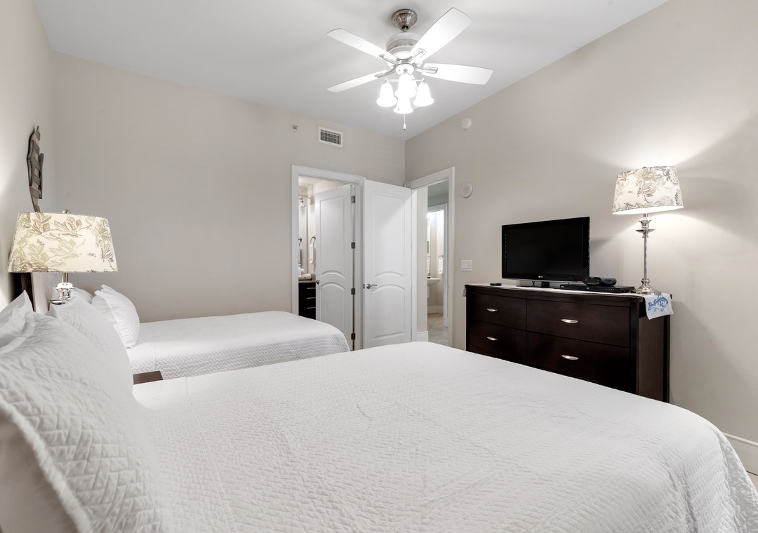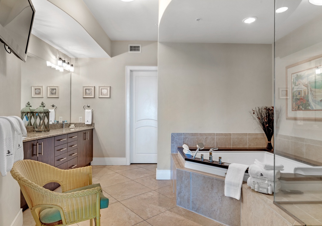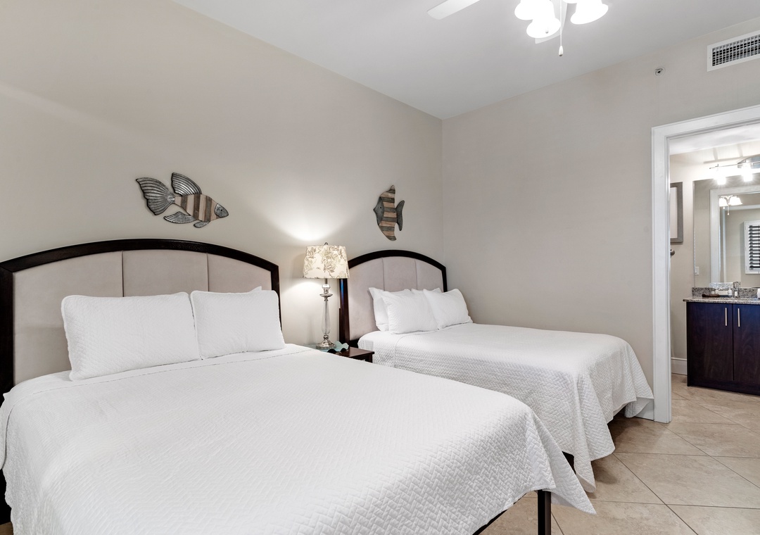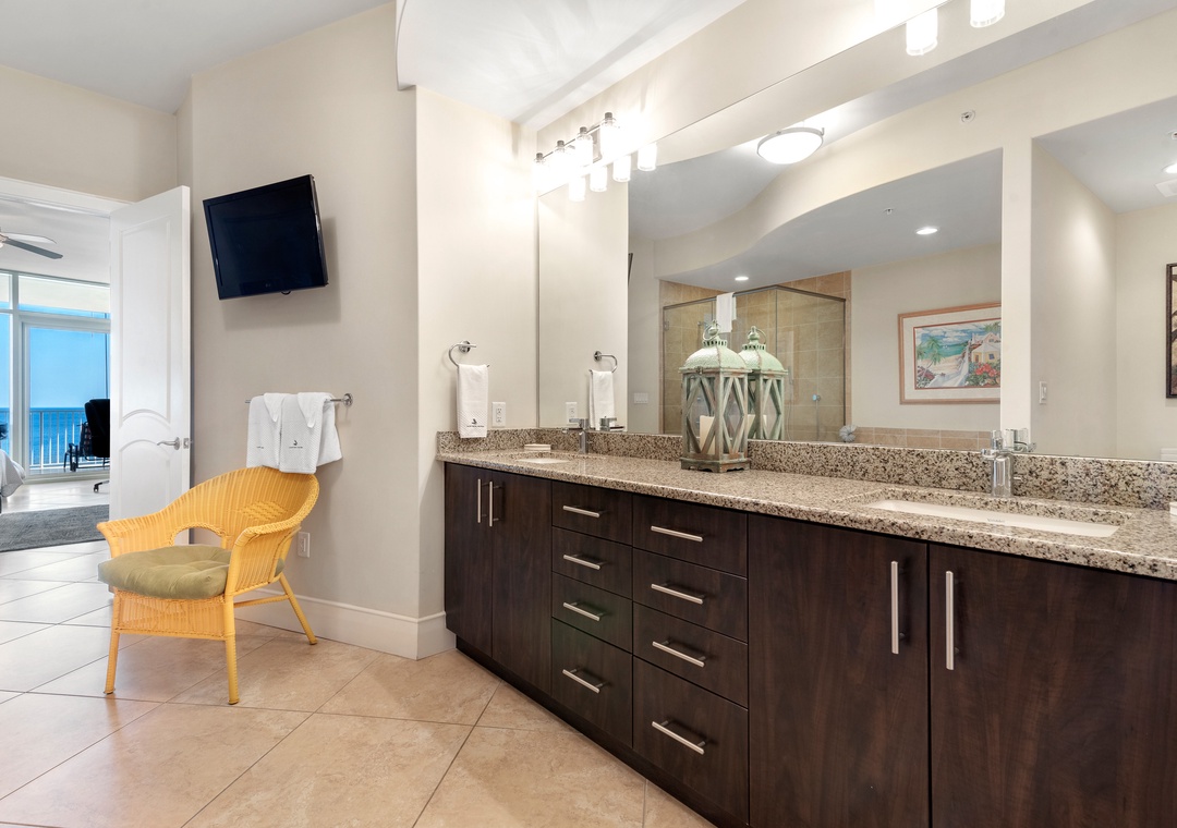 You’ll feel like royalty when you step into the master suite, which hosts a king bed with luxurious bedding and linens, a chaise lounge and a desk set-up, and an LCD television and beachfront balcony access. The attached glamour bath features a massive jetted tub, separate glass and tiled shower, his-and-her vanities and even a wall-mounted flat screen! The second bedroom also offers a king bed while the third bedroom includes a queen bed and full bed affording sleeping accommodations for up to 8 throughout!