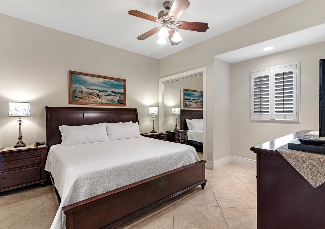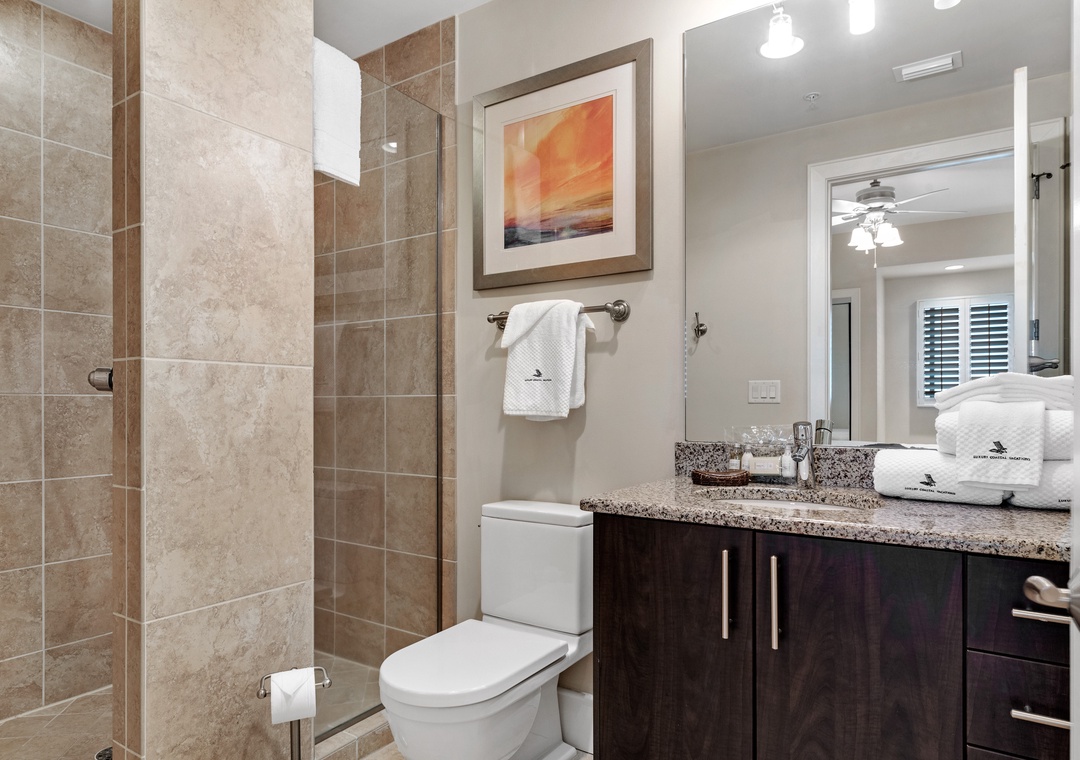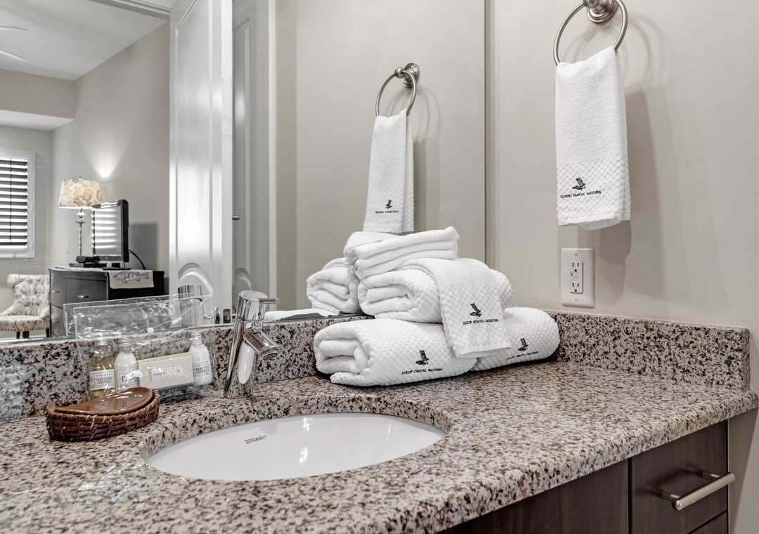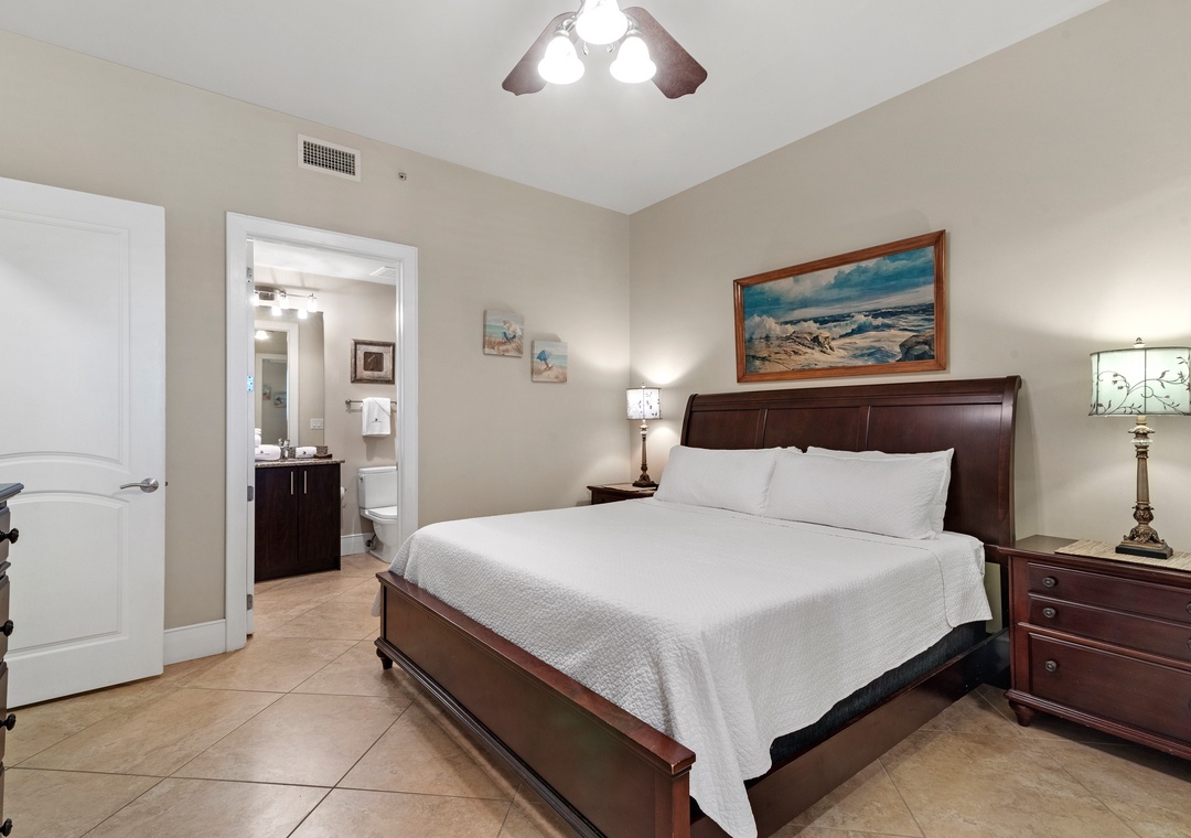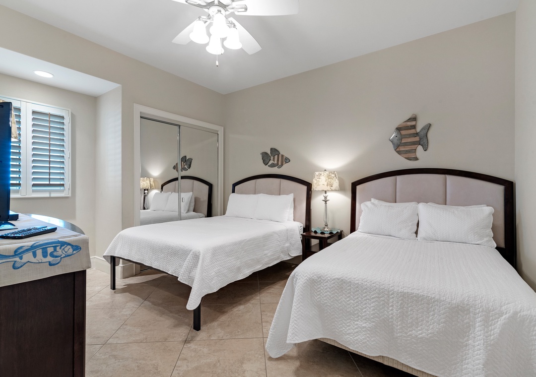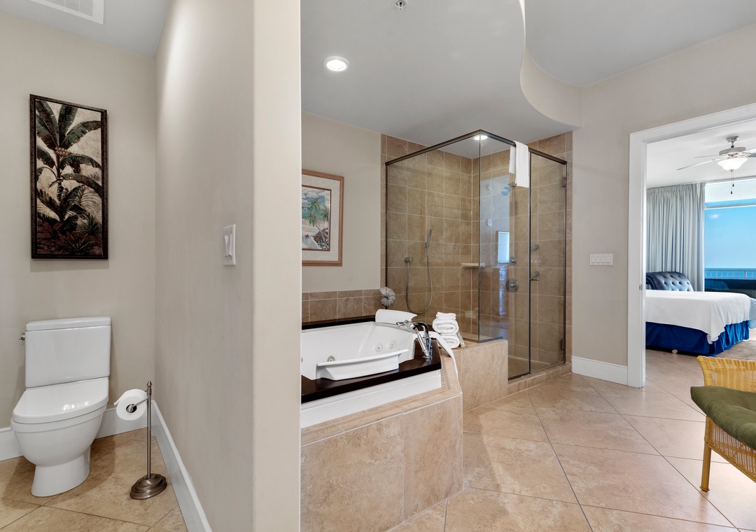 You’ll feel like royalty when you step into the master suite, which hosts a king bed with luxurious bedding and linens, a chaise lounge and a desk set-up, and an LCD television and beachfront balcony access. The attached glamour bath features a massive jetted tub, separate glass and tiled shower, his-and-her vanities and even a wall-mounted flat screen! The second bedroom also offers a king bed while the third bedroom includes a queen bed and full bed affording sleeping accommodations for up to 8 throughout!