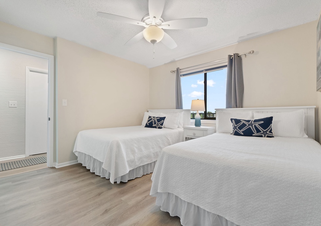 This spacious and charming condo comfortably accommodates up to six guests, making it perfect for a family getaway. Recently renovated with stylish vinyl plank flooring throughout, the unit features a fully equipped kitchen with all the essentials to prepare your favorite meals. The master bedroom boasts a king-sized bed, a large walk-in closet, and an ensuite bathroom with a single vanity and tub/shower combo. The guest bedroom includes two full-sized beds, a closet, and an attached bath with its own tub/shower combo. Enjoy meals together at the dining table, which seats six, or step onto the large balcony for al fresco dining with outdoor furniture and stunning views. For added convenience, the unit is equipped with a full washer and dryer.