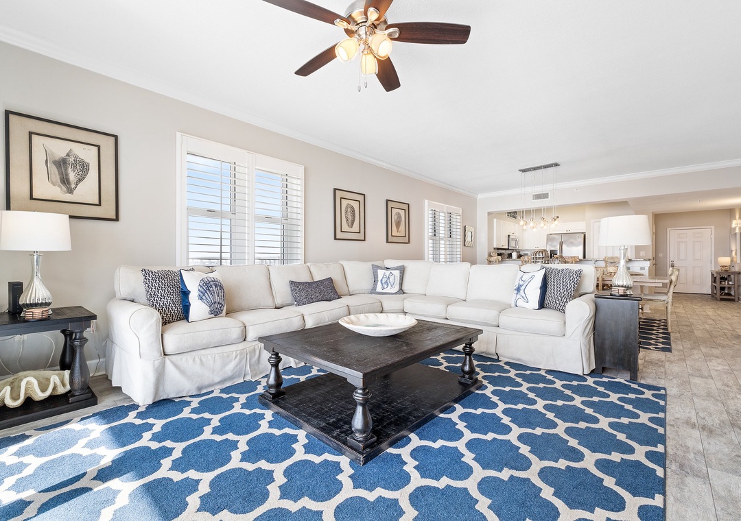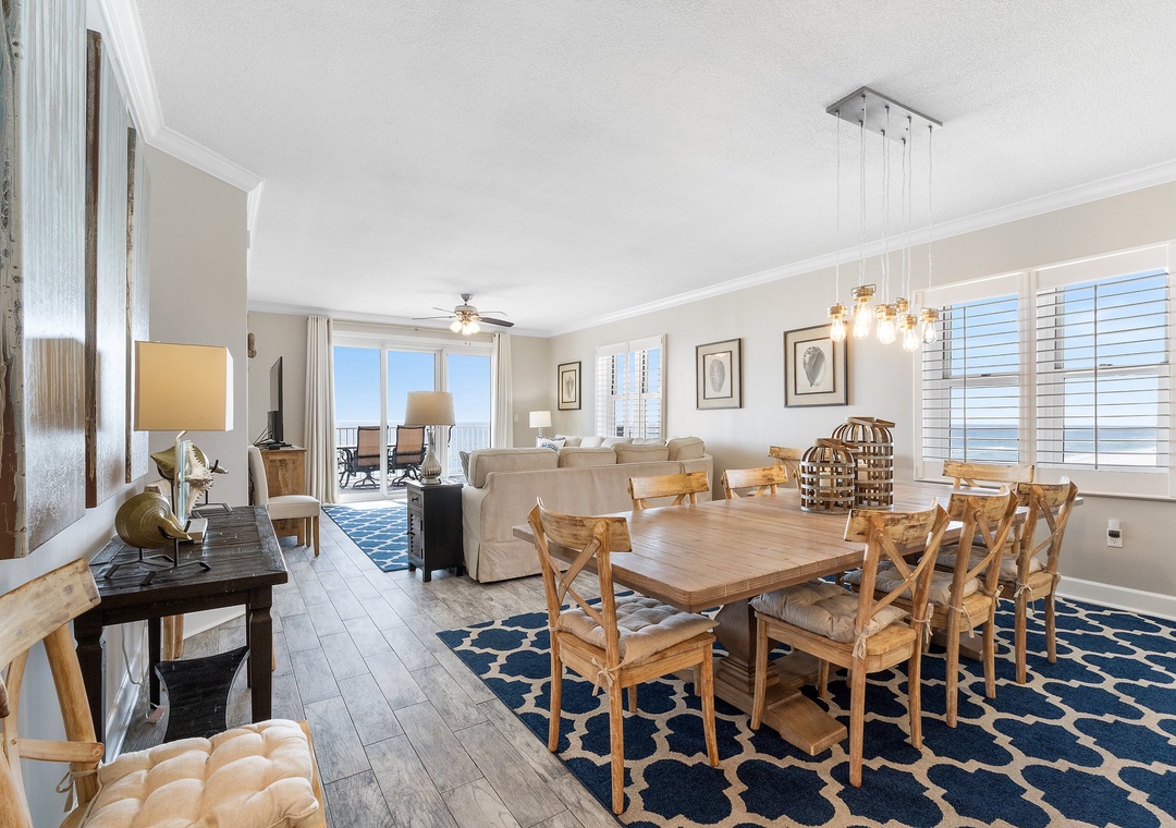 This newly updated corner unit blends sophistication and fun, boasting designer furnishings, custom finishes, and upscale touches. The open layout allows natural light to flood the space, enhancing the bright and airy ambiance. Step onto the expansive covered balcony, where breathtaking panoramic views of the Gulf await. With ample seating for eight, it’s the perfect spot to enjoy morning coffee, evening cocktails, or even a sunset dinner while being serenaded by the soothing waves.
