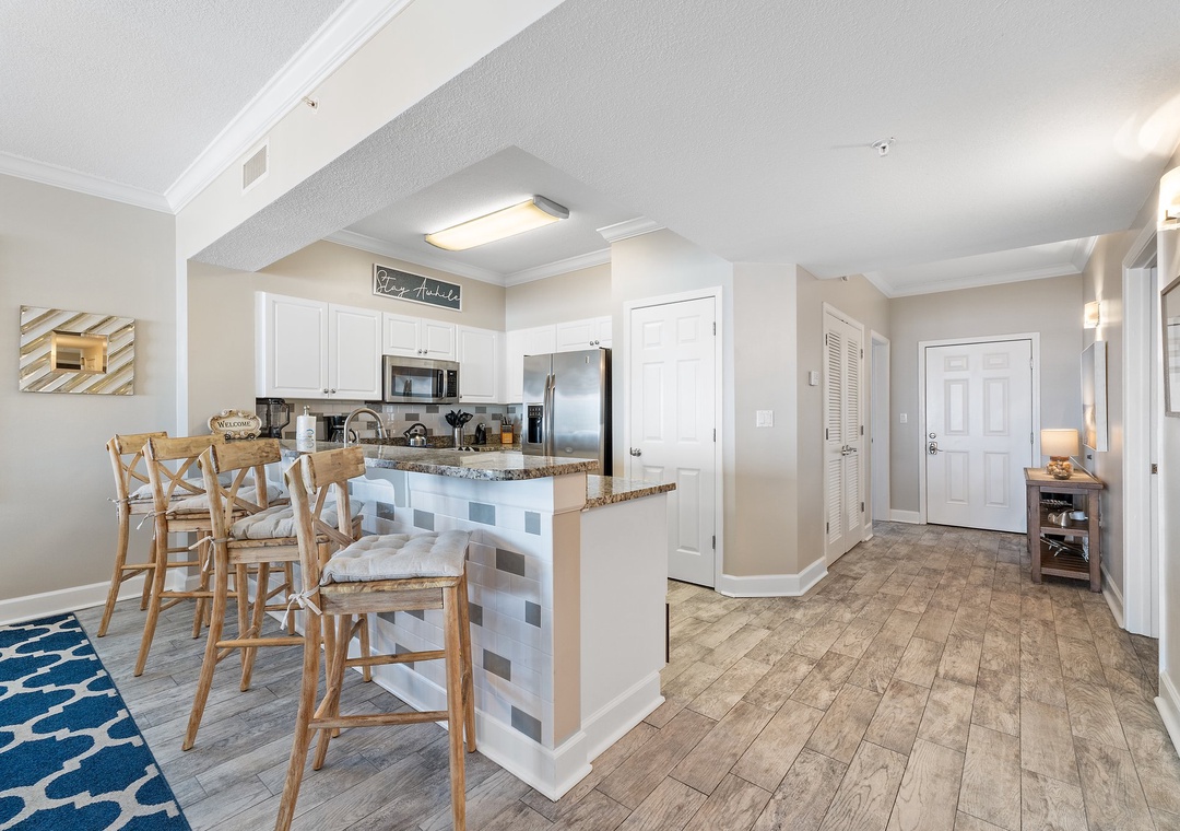 This was a beautiful condo, plenty of room, kitchen was well stocked with dishes, glasses, pots & pans, etc. The balcony had a great layout with plenty of chairs. There were 7 adults and a 5 & 3 year old and we never felt crowded! We had two maintenance issues, which were taken care of as soon as we called them in and both the service and office staff were very friendly and helpful. They even helped our grandson who had a paper to turn in for a college summer class by printing a form out for him! Highly recommend!