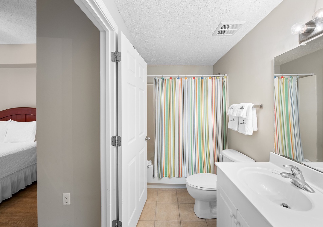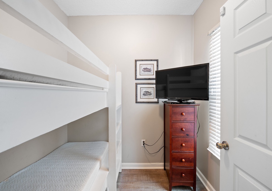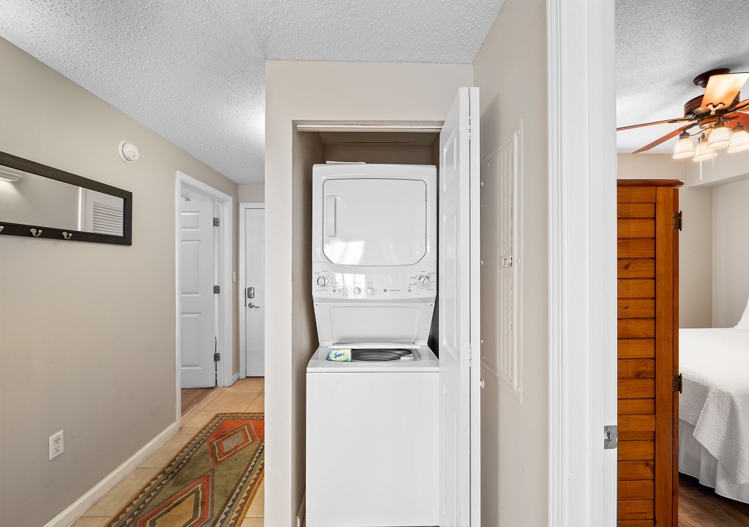 The impressive master suite boasts a new king Serta Perfect Mattress with luxurious linens, blackout drapes, a large television with DVD player, and beachfront balcony access! You can enjoy stunning views without leaving your cozy bed! The attached master bath offers a large two person tub, a separate glass walk-in shower, and his and her vanities. You’ll definitely indulge in some much needed relaxation in this master retreat! The second bedroom is elegantly appointed with a queen bed and luxury bedding, a large television and DVD player and attached bathroom. With the small bunk room with a twin bunk bed and the queen sleeper sofa in the living room, this unit allows comfortable accommodations for up to 8! This luxury unit also features a full size washer and dryer. You get all of the conveniences of a larger condo without the large price tag!