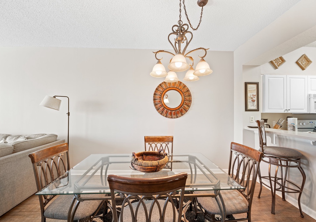 The kitchen is equipped with everything you’ll need to create the perfect meal, including a breakfast bar with seating for 2 and all the small appliances and utensils necessary to get cooking! The dining area features a beautiful glass-top table with seating for six.