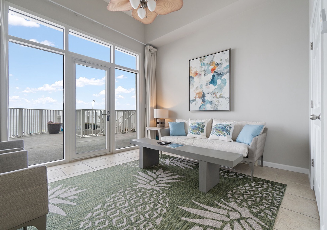 When everyone returns to home base, the fresh air will beckon them out to the private, furnished balcony as the sun sets. There is nothing better than the contrast of pink and purple skies against the emerald waters of the Gulf.
