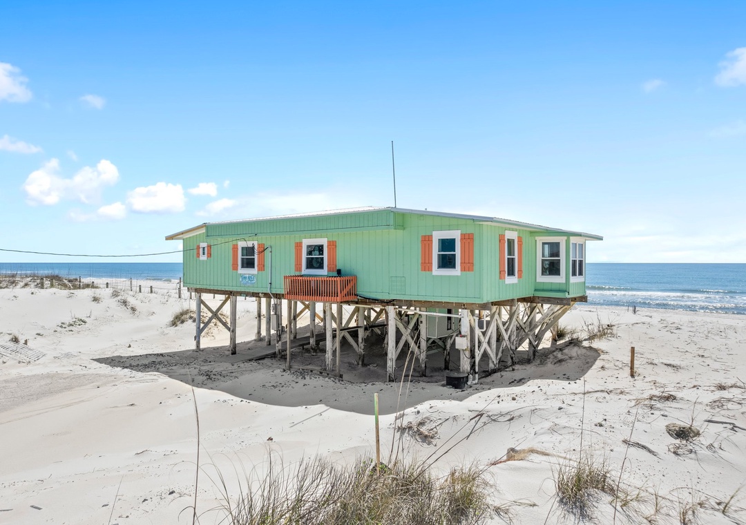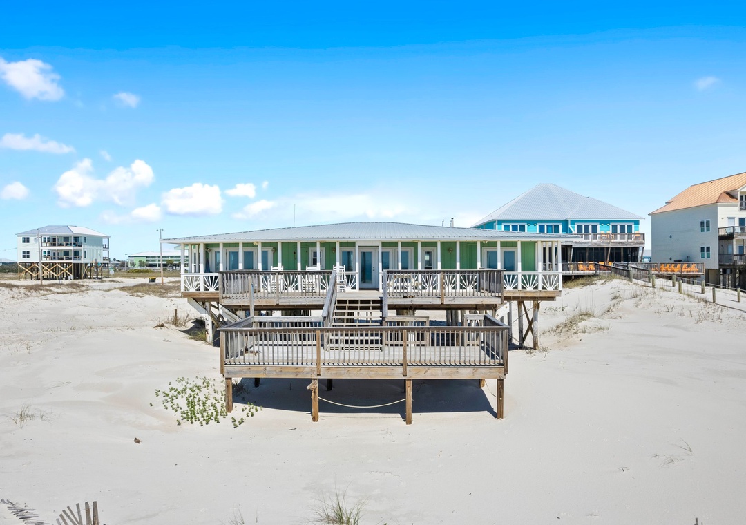 Nestled directly on the sandy shores of Fort Morgan, AL, this charming beachfront retreat accommodates up to 10 guests comfortably, featuring a gorgeous primary suite with a king bed, and three additional bedrooms boasting one queen bed, two twins, and a twin over twin bunk. The living room also features a queen sleeper sofa. Ideal for your next beach getaway with loved ones, this cozy abode invites you to unwind in front of the flatscreen TV with cable in the living room or embark on a leisurely stroll along the shoreline for a refreshing evening. After soaking up the sun, return home to whip up a delectable, home-cooked meal in the well-appointed kitchen, boasting top-notch appliances and cookware for the designated chef to showcase their culinary prowess.