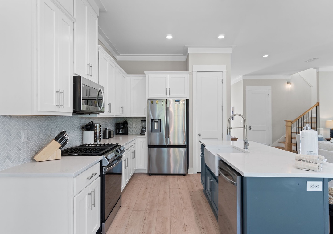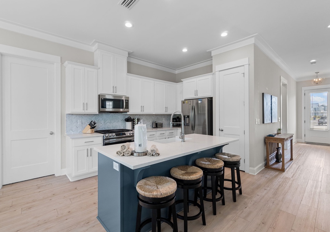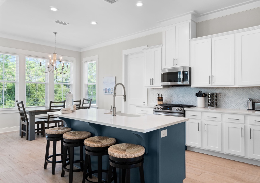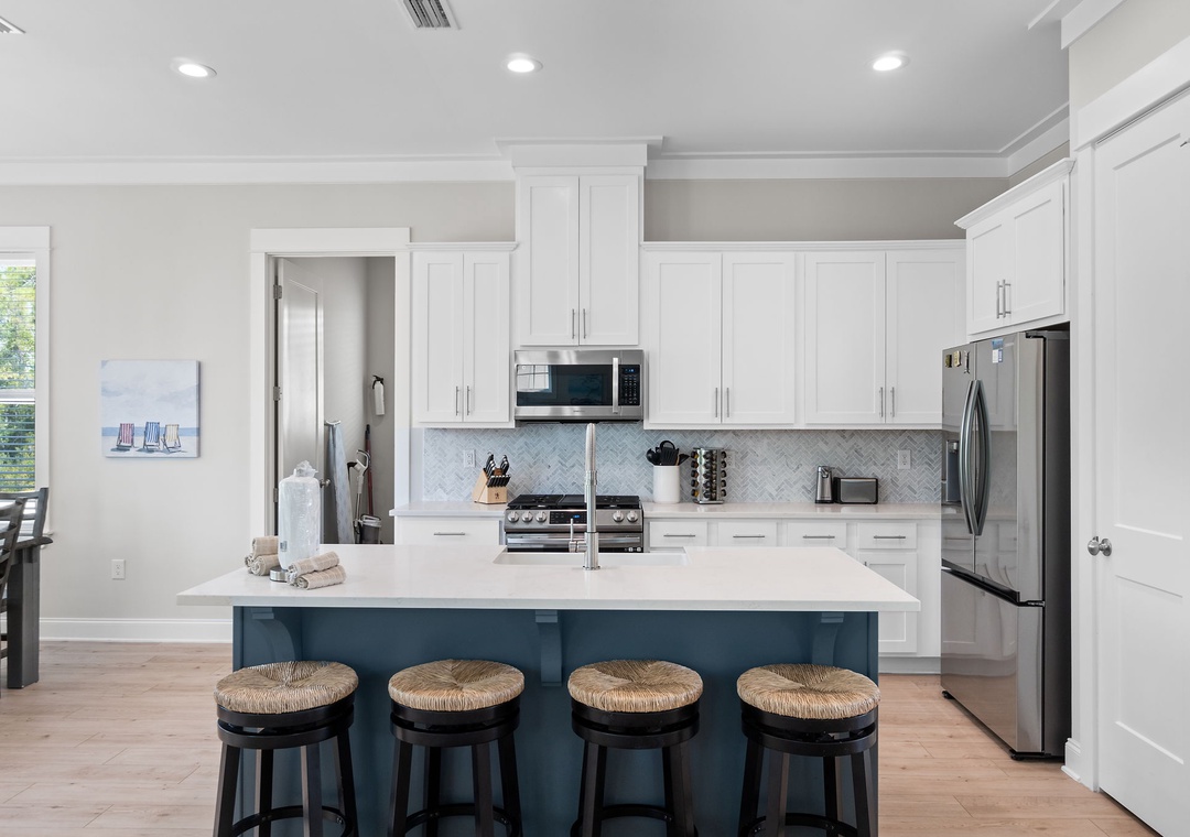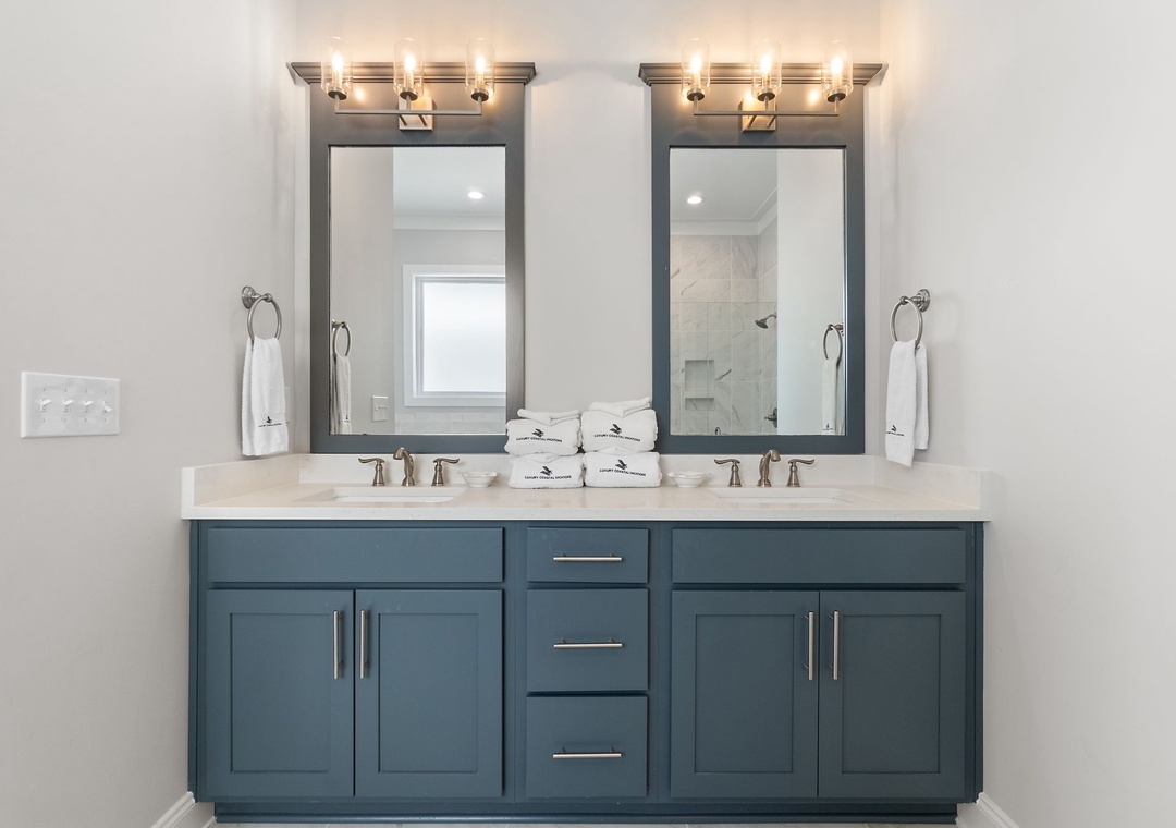 The four fabulously appointed bedrooms are designed with your comfort in mind. The expansive upstairs master retreat features a king-size bed with luxurious linens and a premium mattress, and an attached bathroom. The ensuite bath is a sanctuary with a gorgeous walk-in tiled shower and a soaking tub, perfect for unwinding after a day at the beach. The second and third bedroom each have a queen sized bed and both full bathroom. The fourth bedroom features a twin over full bunk bed, twin over twin bunk bed and full ensuite bathroom.