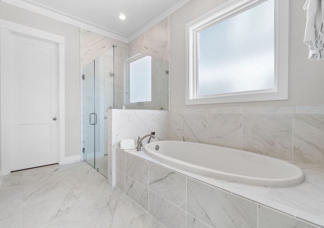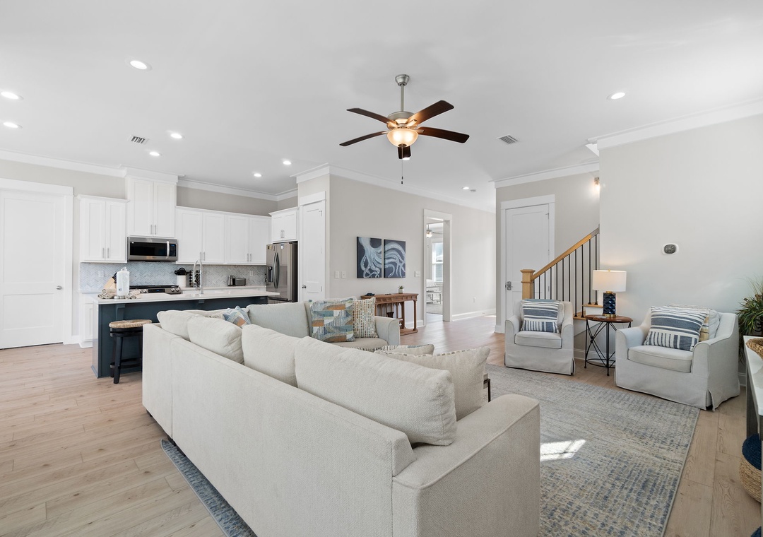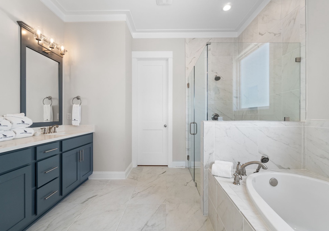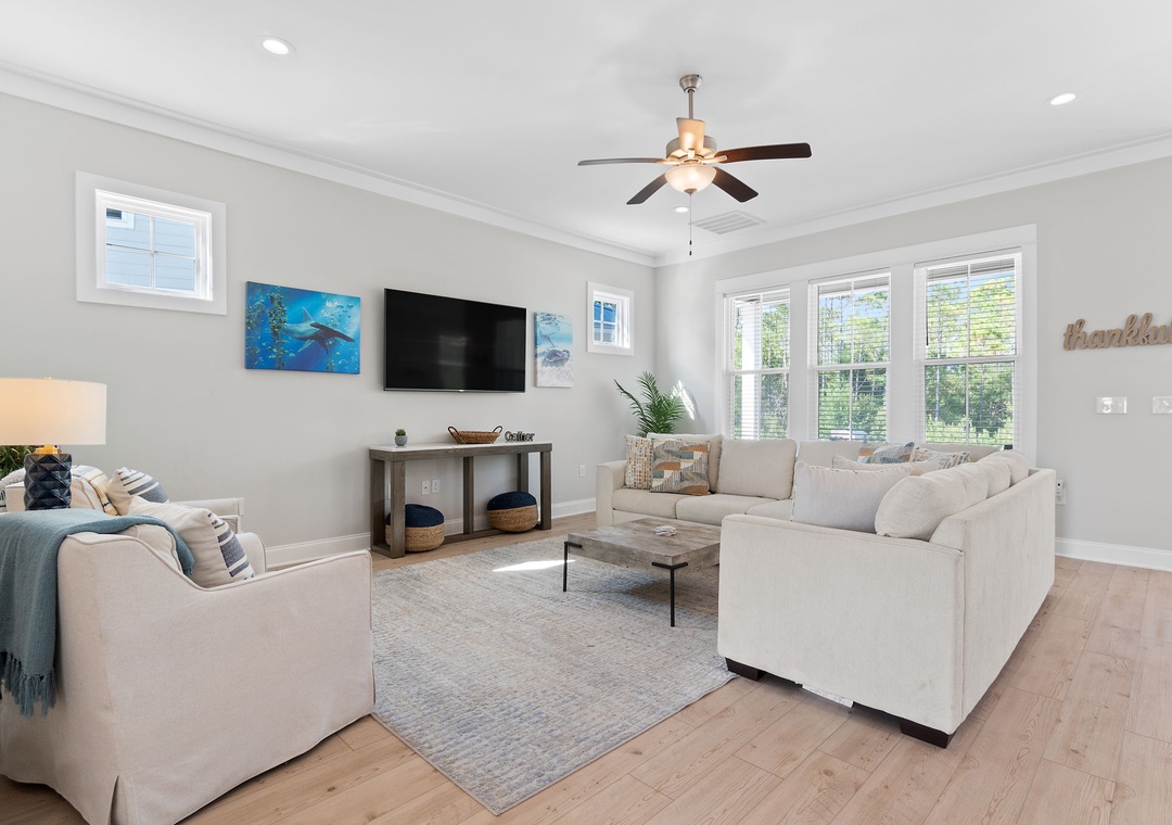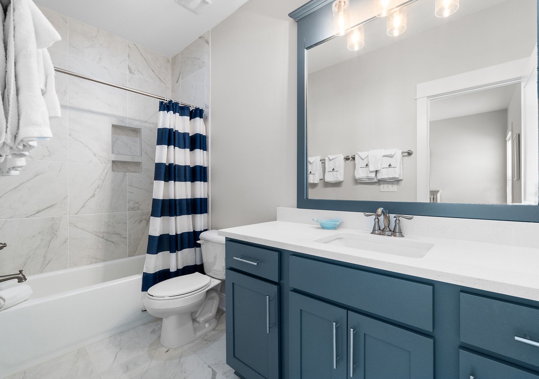 The four fabulously appointed bedrooms are designed with your comfort in mind. The expansive upstairs master retreat features a king-size bed with luxurious linens and a premium mattress, and an attached bathroom. The ensuite bath is a sanctuary with a gorgeous walk-in tiled shower and a soaking tub, perfect for unwinding after a day at the beach. The second and third bedroom each have a queen sized bed and both full bathroom. The fourth bedroom features a twin over full bunk bed, twin over twin bunk bed and full ensuite bathroom.