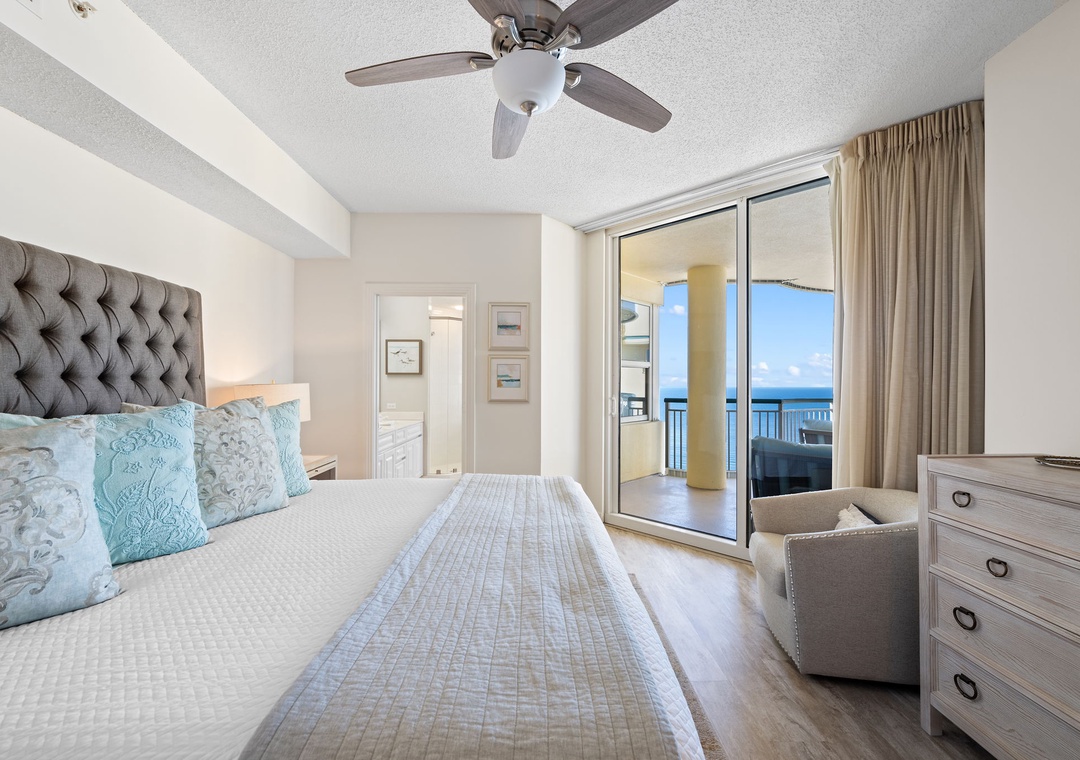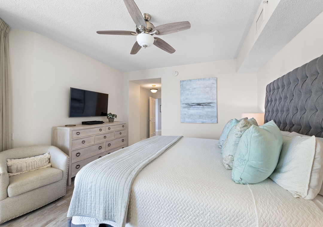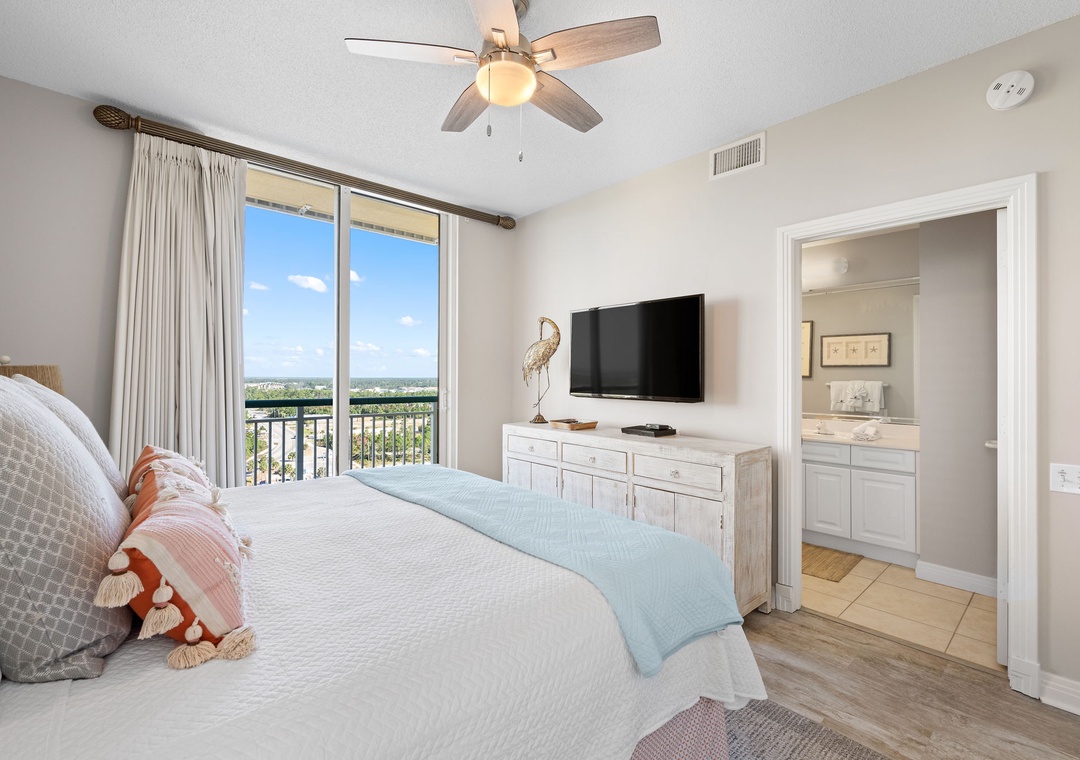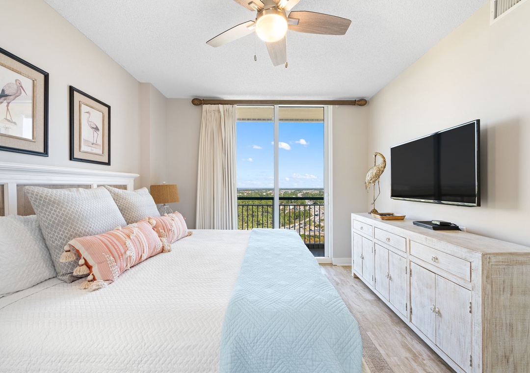 The elegant master suite lives up to its name, hosting a beautiful king bed with luxurious linens and bedding, a large LCD television and beachfront balcony access! You can delight in the breathtaking views without even leaving your cozy bed! The ensuite bath is equally impressive, featuring a 2-person jetted tub overlooking the gulf, a separate glass and tile shower and double vanities. The second bedroom functions as a second master, with a king bed, luxury linens, private bath and north balcony access! The third bedroom features two Queen beds, along with a private bath and north balcony access. The North balconies showcase stunning views of Old River, the Intercoastal Waterway and Perdido Key!