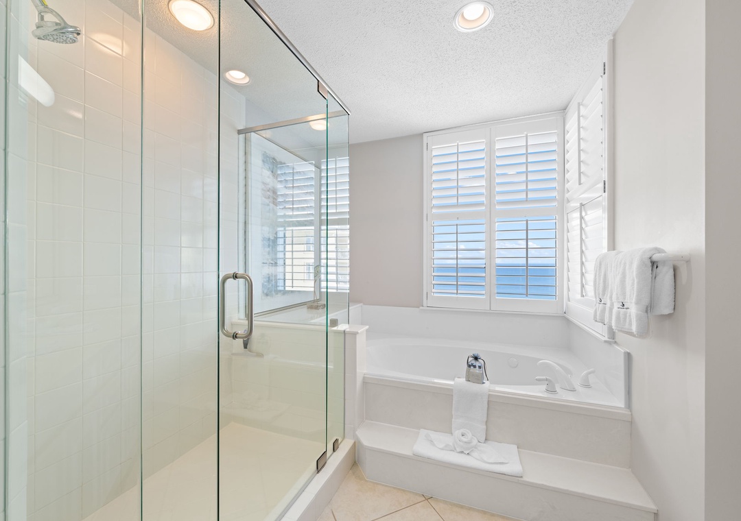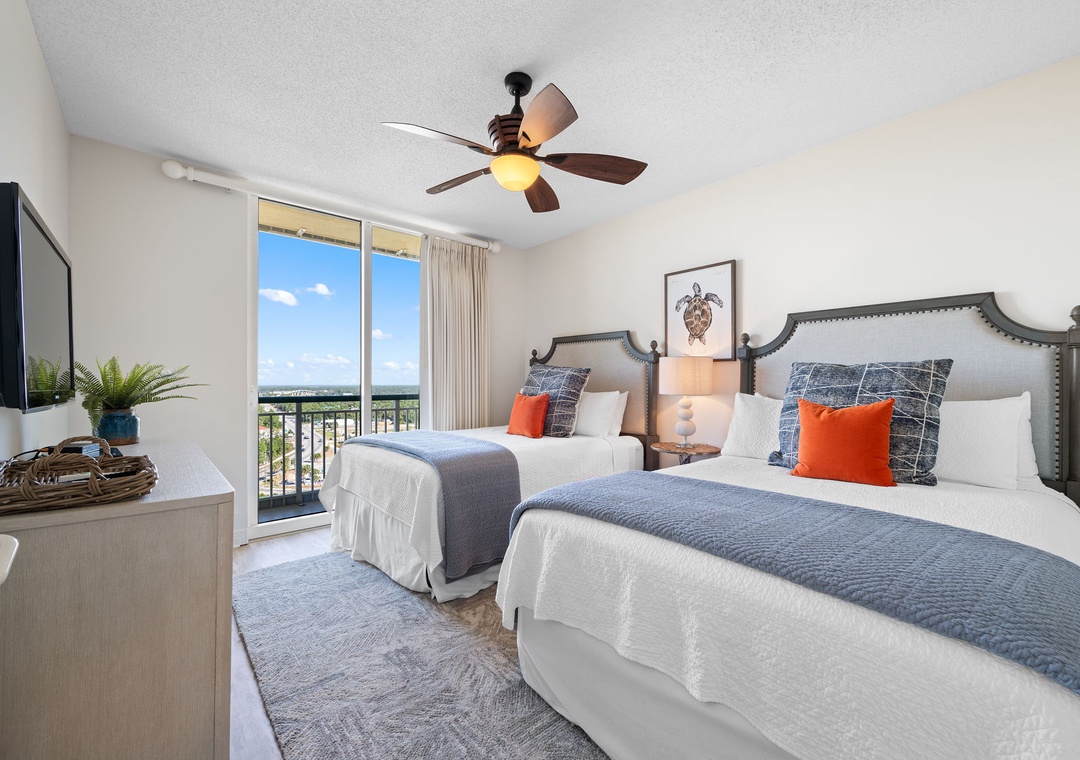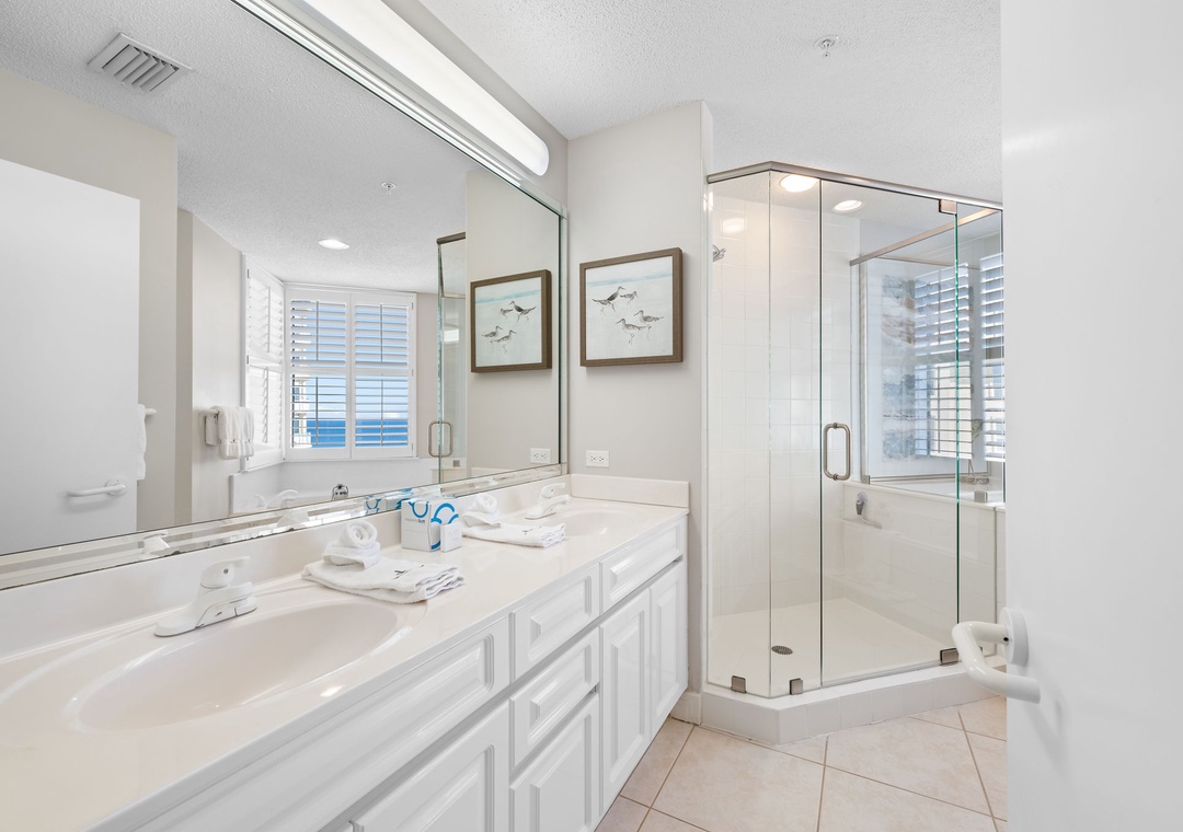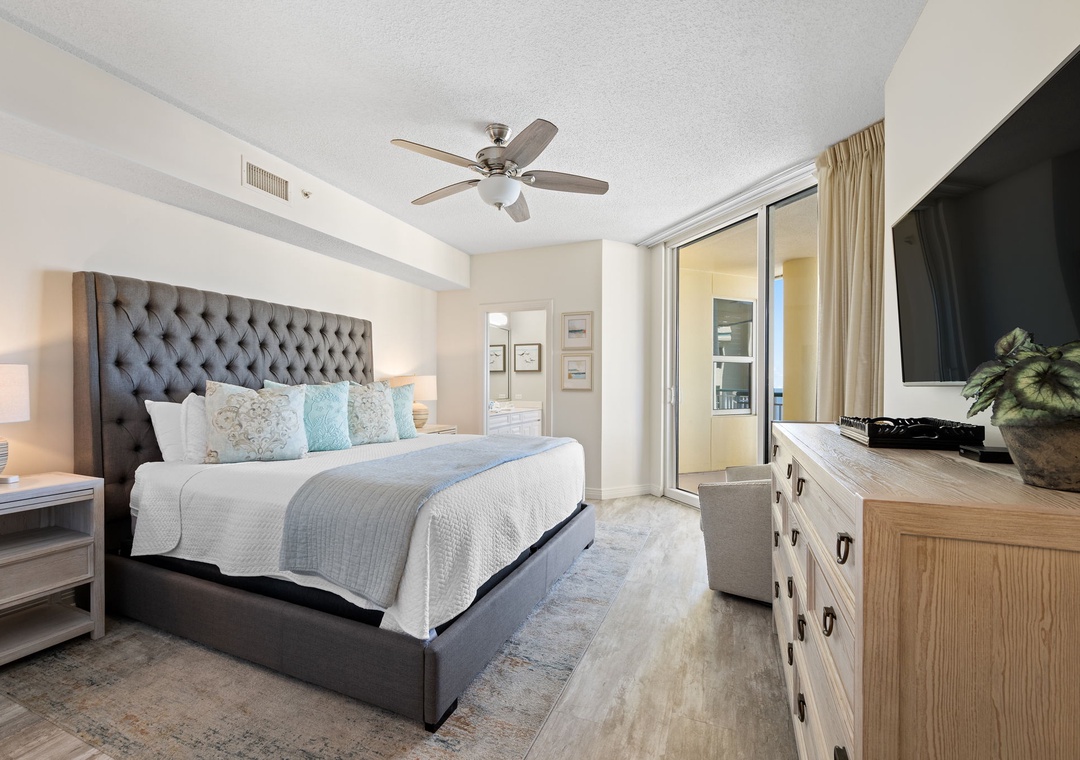 The elegant master suite lives up to its name, hosting a beautiful king bed with luxurious linens and bedding, a large LCD television and beachfront balcony access! You can delight in the breathtaking views without even leaving your cozy bed! The ensuite bath is equally impressive, featuring a 2-person jetted tub overlooking the gulf, a separate glass and tile shower and double vanities. The second bedroom functions as a second master, with a king bed, luxury linens, private bath and north balcony access! The third bedroom features two Queen beds, along with a private bath and north balcony access. The North balconies showcase stunning views of Old River, the Intercoastal Waterway and Perdido Key!