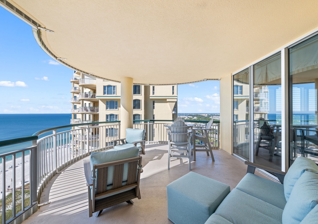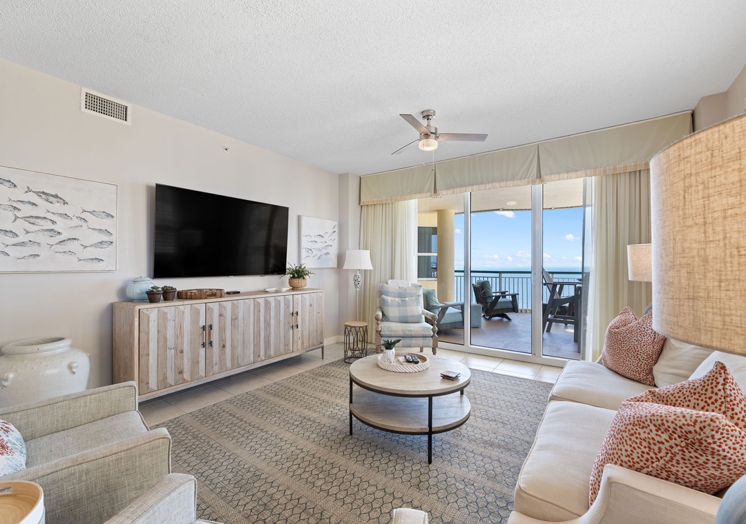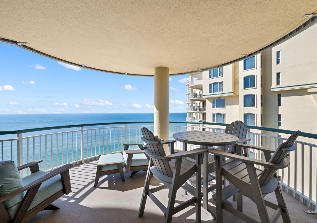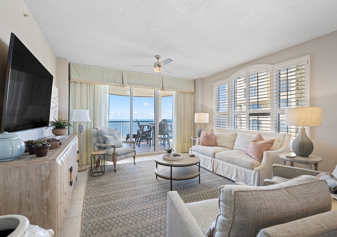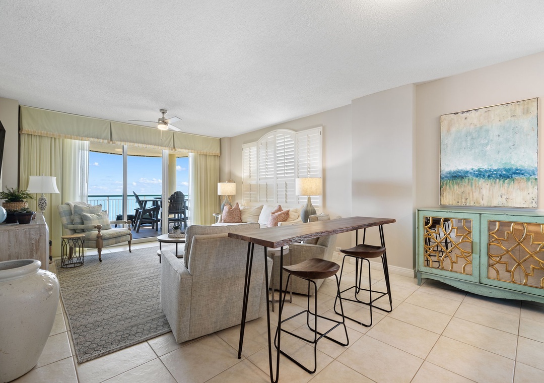 This unit offers close to 2,000 square feet of luxury to enjoy, hosting an open and spacious floor plan, designer furnishings and the most amazing views! Because this is an exclusive corner unit, the western side has additional windows and affords dramatic sunset vistas, which you can enjoy from your oversized balcony! Adorned in a modern beach-chic décor, the living area boasts plush furnishings and a huge LCD television and most importantly, beachfront balcony access! The covered terrace has ample seating.
