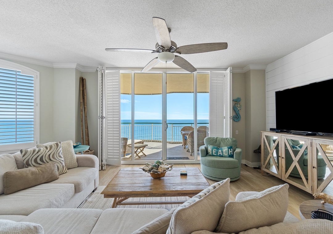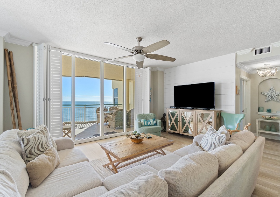 This 15th floor unit is completely remodeled and professionally decorated. The living area hosts a beautiful cream sofa and additional chairs, a huge LCD television and beachfront balcony access! Floor-to-ceiling sliding glass doors open to the oversized covered terrace, and with an outdoor table with seating for four and two chaise loungers.