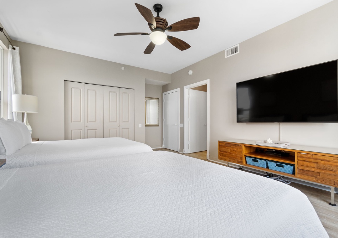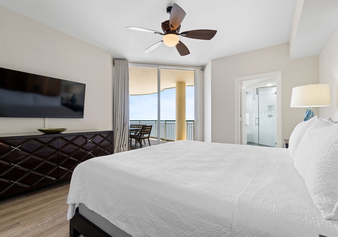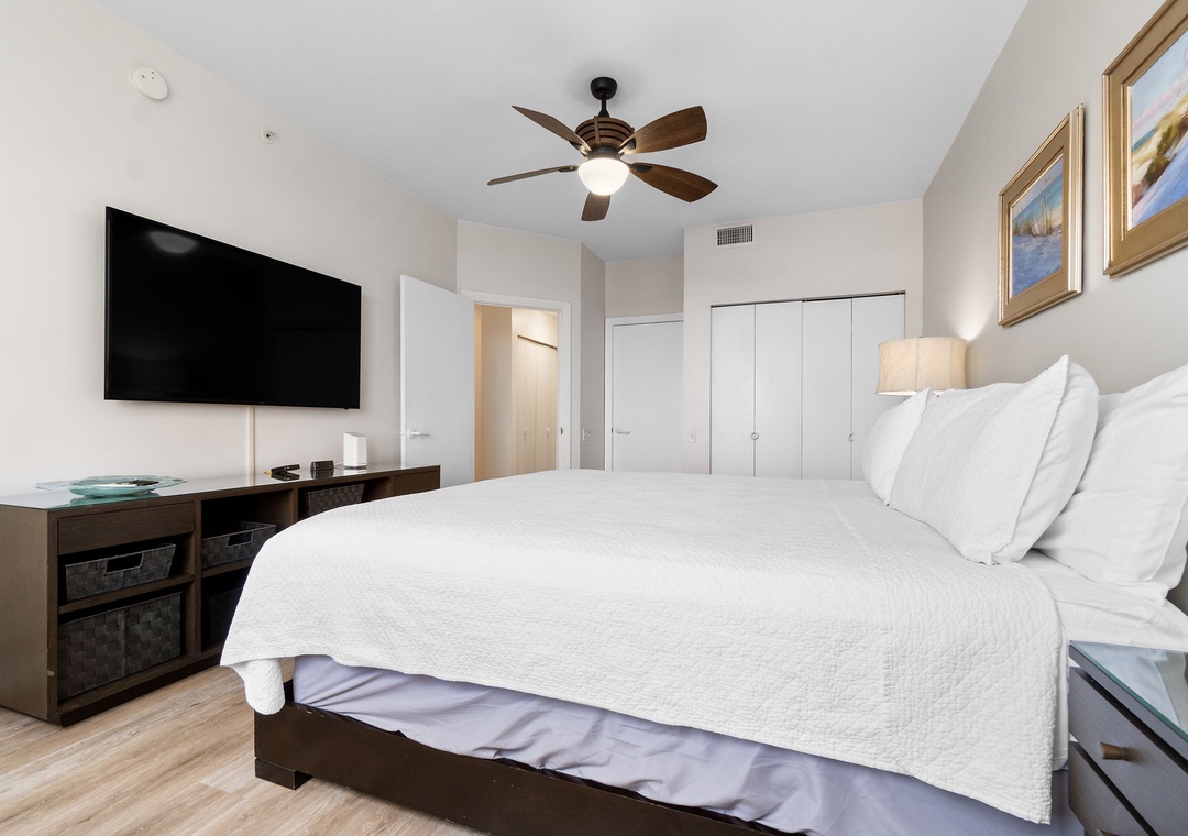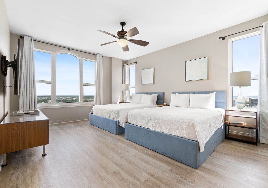 The master suite is a haven of relaxation with a king platform bed, a large walk-in closet, and newly remodeled master bath featuring a walk-in shower and twin vanities. Guest bedrooms are equally luxurious, including a second master suite with a king platform bed, original Gulf Coast paintings, and an en-suite bathroom. The third bedroom, with its two queen beds and sunrise views, offers ample space and comfort. The unit’s sophisticated design and high-end amenities ensure an unforgettable stay in Perdido Key.