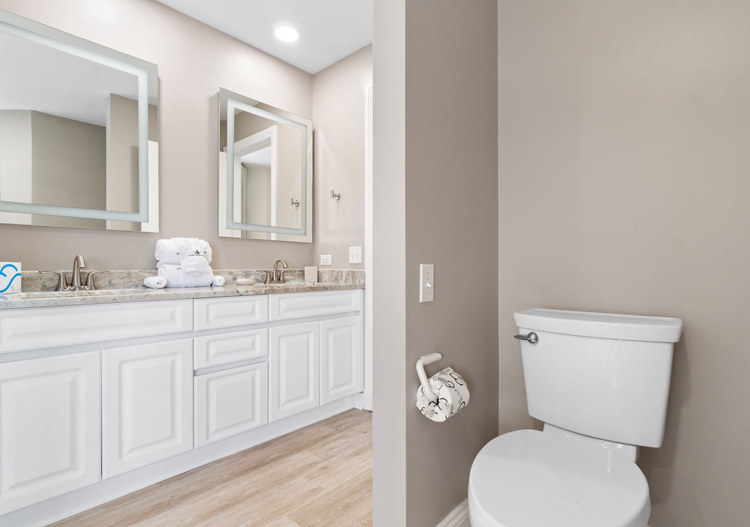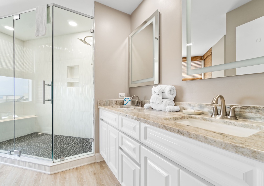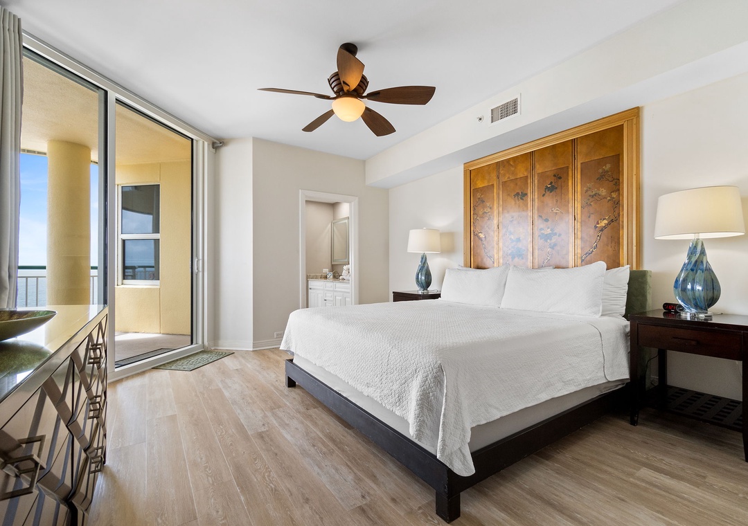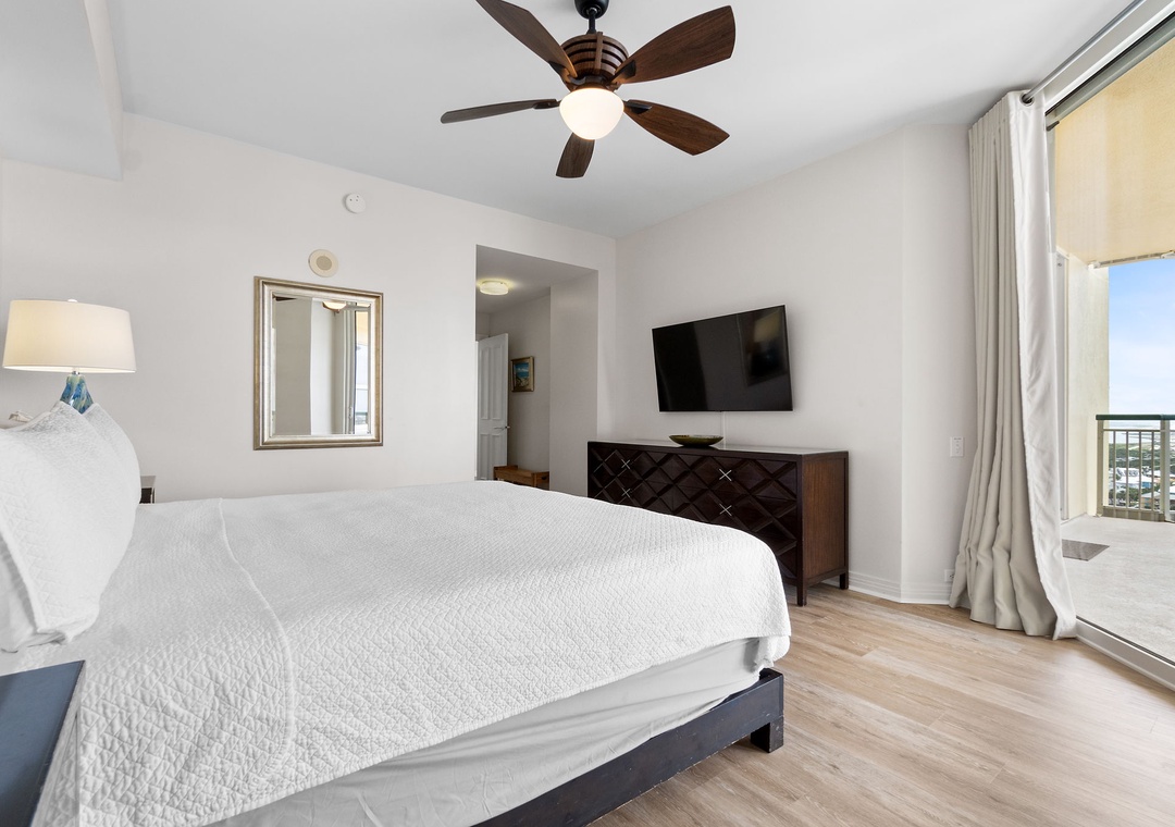 The master suite is a haven of relaxation with a king platform bed, a large walk-in closet, and newly remodeled master bath featuring a walk-in shower and twin vanities. Guest bedrooms are equally luxurious, including a second master suite with a king platform bed, original Gulf Coast paintings, and an en-suite bathroom. The third bedroom, with its two queen beds and sunrise views, offers ample space and comfort. The unit’s sophisticated design and high-end amenities ensure an unforgettable stay in Perdido Key.