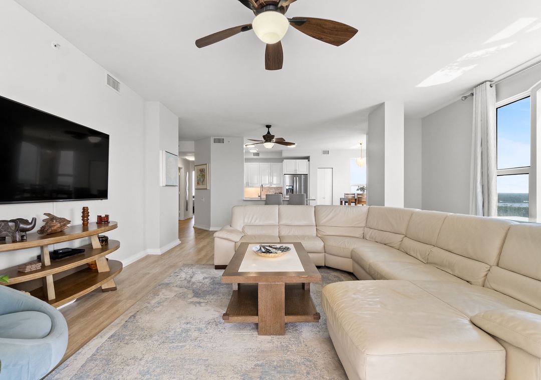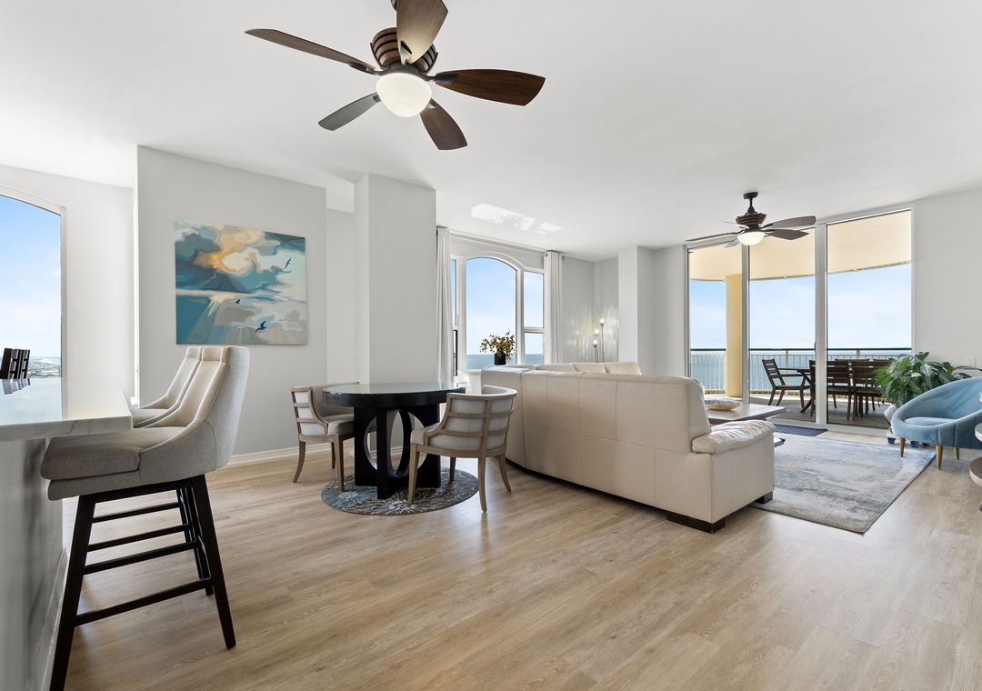 Experience the pinnacle of luxury and breathtaking views from this 16th-floor penthouse at Beach Colony's East Tower in Perdido Key. This contemporary unit offers panoramic vistas of Johnson's Beach and the Gulf of Mexico from floor-to-ceiling glass sliding doors that open to a 300 sq ft balcony. The living area features an Italian leather sectional, a mid-century modern chair, and a 65-inch Smart TV. The gourmet kitchen is equipped with stainless appliances, granite countertops, and a spacious bay window, perfect for intimate dinners and enjoying the stunning beachfront scenery.