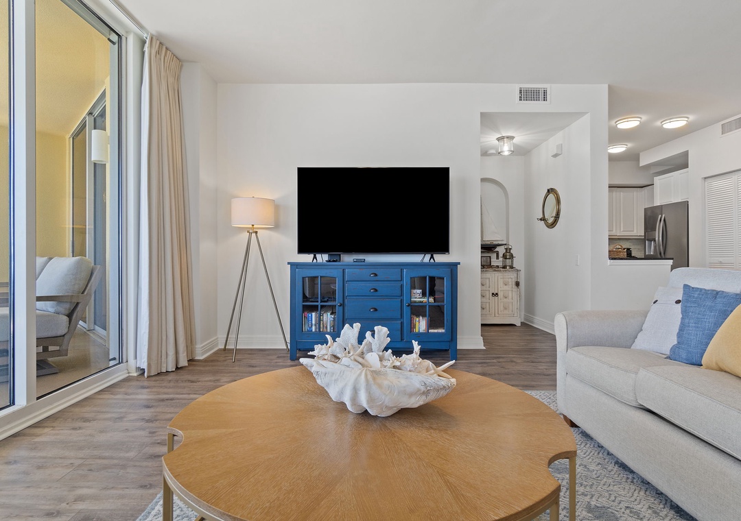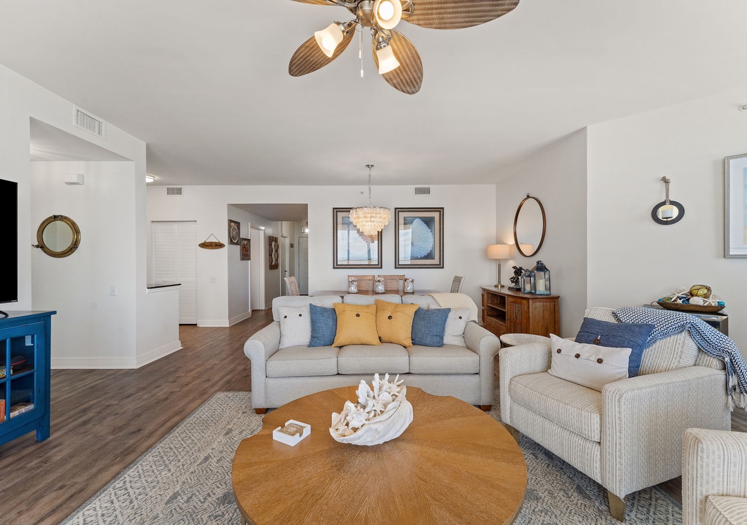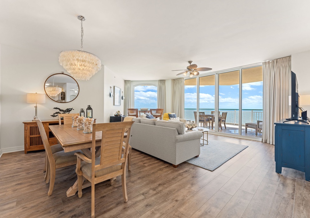 Gorgeous penthouse condo with incredible balcony views. The condo was cleaned very well. Plenty of bath towels. Comfortable beds, quite soft, which I enjoy. Well stocked kitchen. Large fridge with ice maker. Nice big dining room table, great for meals, games and puzzles. Comfortable living room seating for 4, maybe 5. Smart TV in living room had good picture and sound. Nice big pool steps away from the elevators. Beach access was easy. Beach service chairs for rental are small and may not hold overweight folks comfortably, fyi. We loved it here and would stay again!