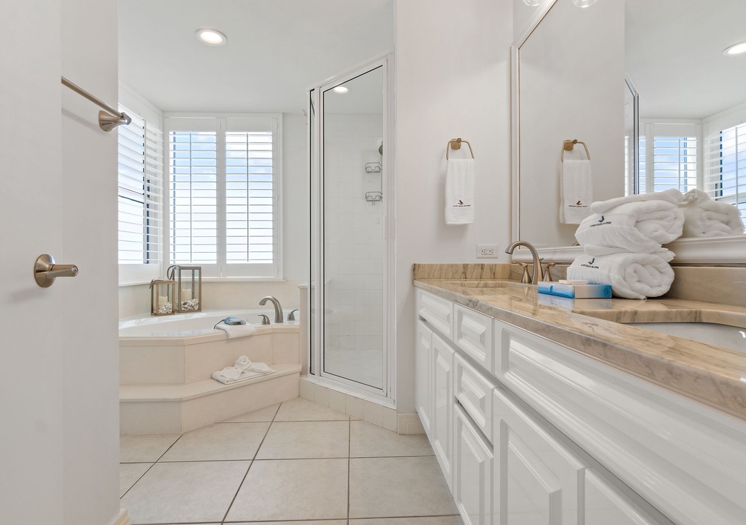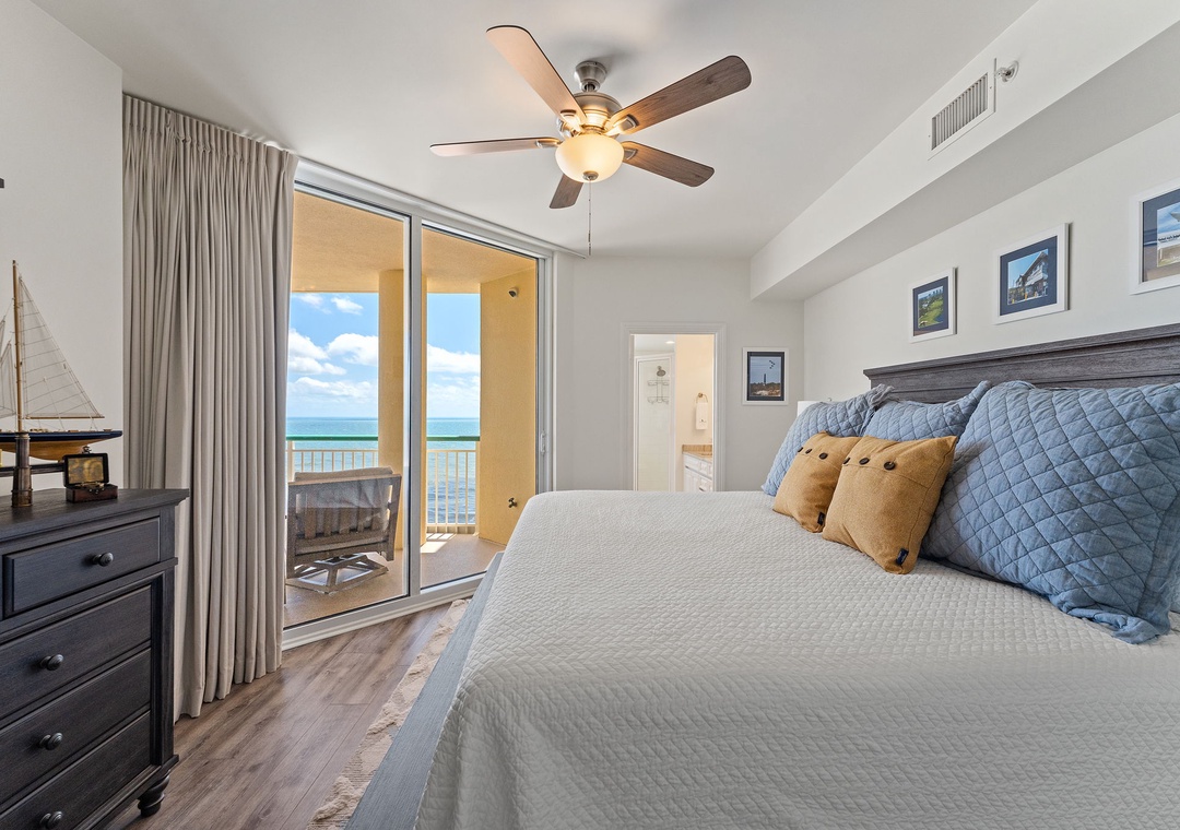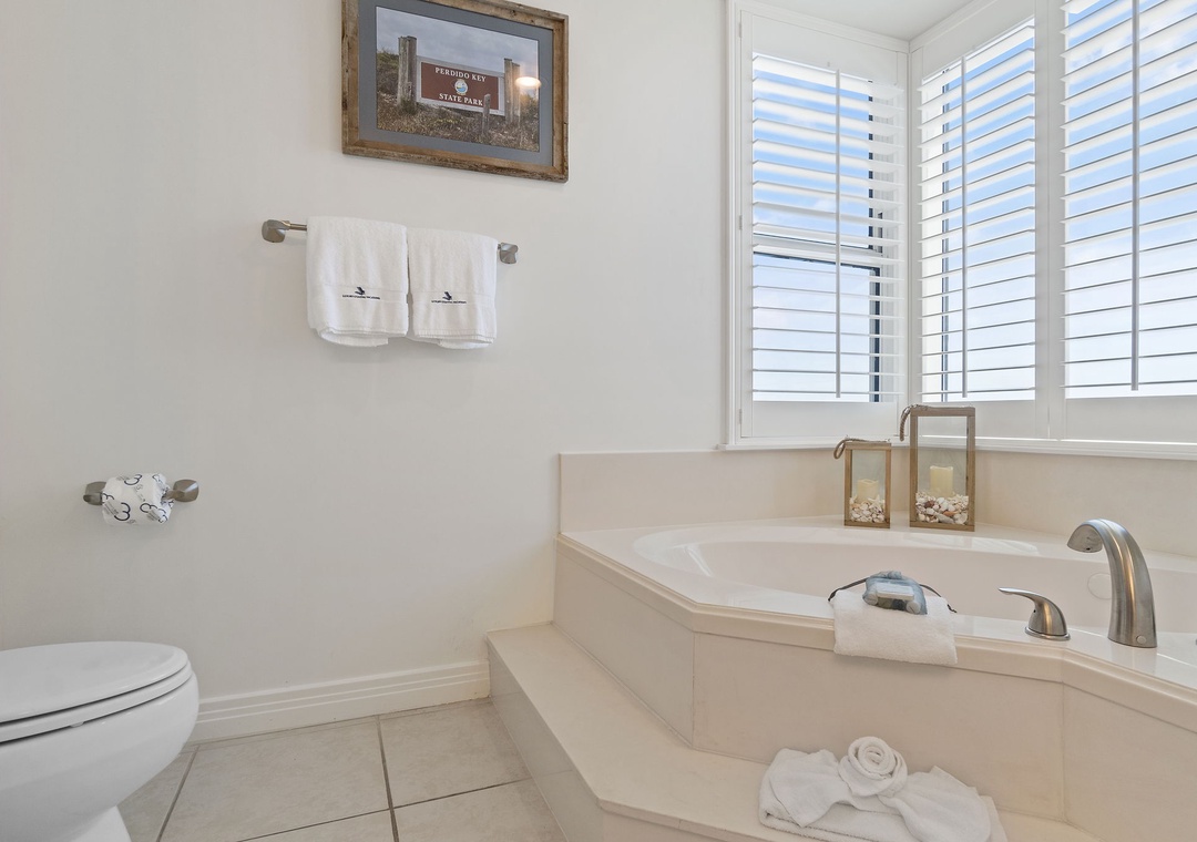 The master suite certainly lives up to its name, offering a quality king mattress and luxurious bedding, a large LCD television and gulf front terrace access! The attached master bath is equally impressive, featuring an oversized jetted tub, separate glass shower and granite countertops. The second bedroom offers a queen bed with deluxe linens, and the third bedroom offers two full size beds! Every bedroom in this upscale unit features spectacular views. Book your stay today!