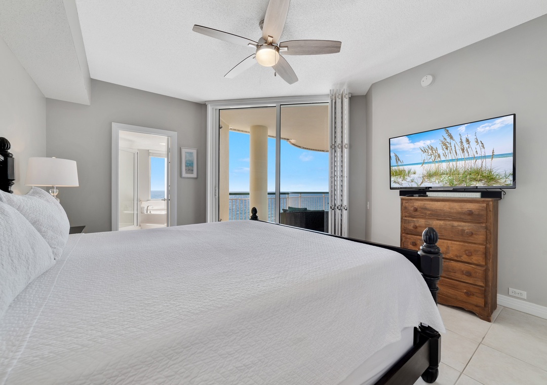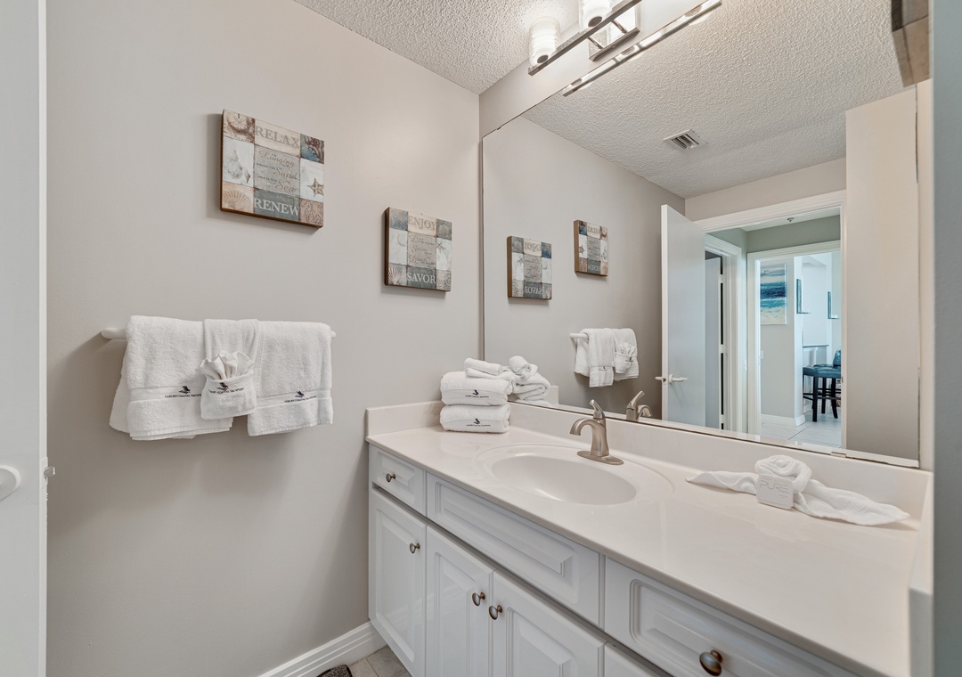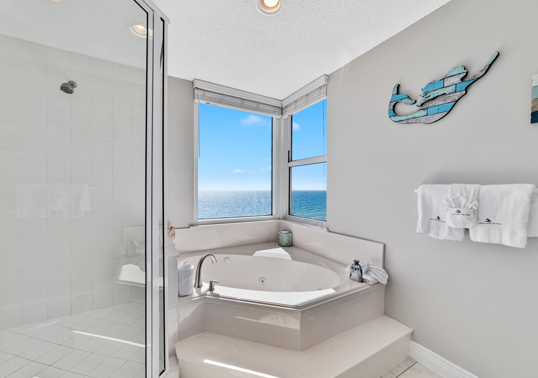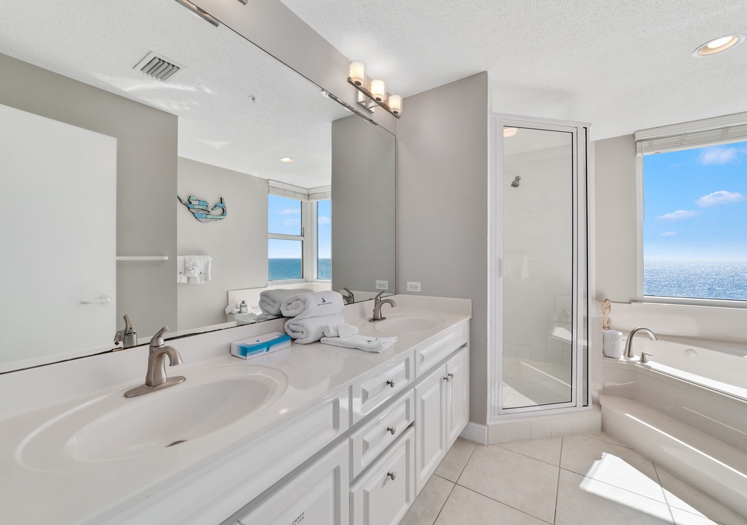 Retire after a long day of recreation to one of 2 luxuriously appointed bedrooms and catch some serious zzz's! With premium mattress sets, high thread-count linens and posh bedding, you're sure to enjoy quality rest and relaxation during your much deserved beach getaway. Pamper yourself after a day on the beach in the master's glamour bath, complete with an elevated Jacuzzi tub, separate glass and tile walk-in shower, his-and-her sinks and a picture window with Gulf views!