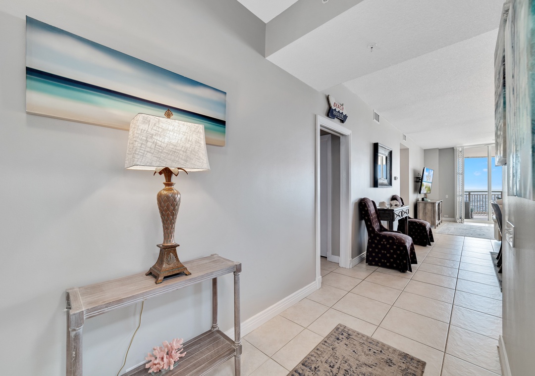 The minute we opened the door , my fiancé and I looked at each other and said WOW!! The condo was immaculate , really nice furniture and decor. You could see the balcony and view as soon as you walk through the door. The huge balcony had very nice comfy furniture and the view of the ocean from the 8th floor was incredible! We enjoyed coffee in the morning and wine at night on the balcony. The kitchen was stocked complete with everything you could think of, all we had to do was buy food. The beds were very comfortable and big TVs in every room. We will definitely recommend to family and friends. and we will stay here again.