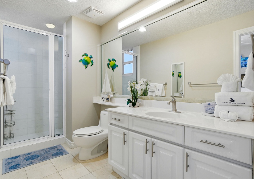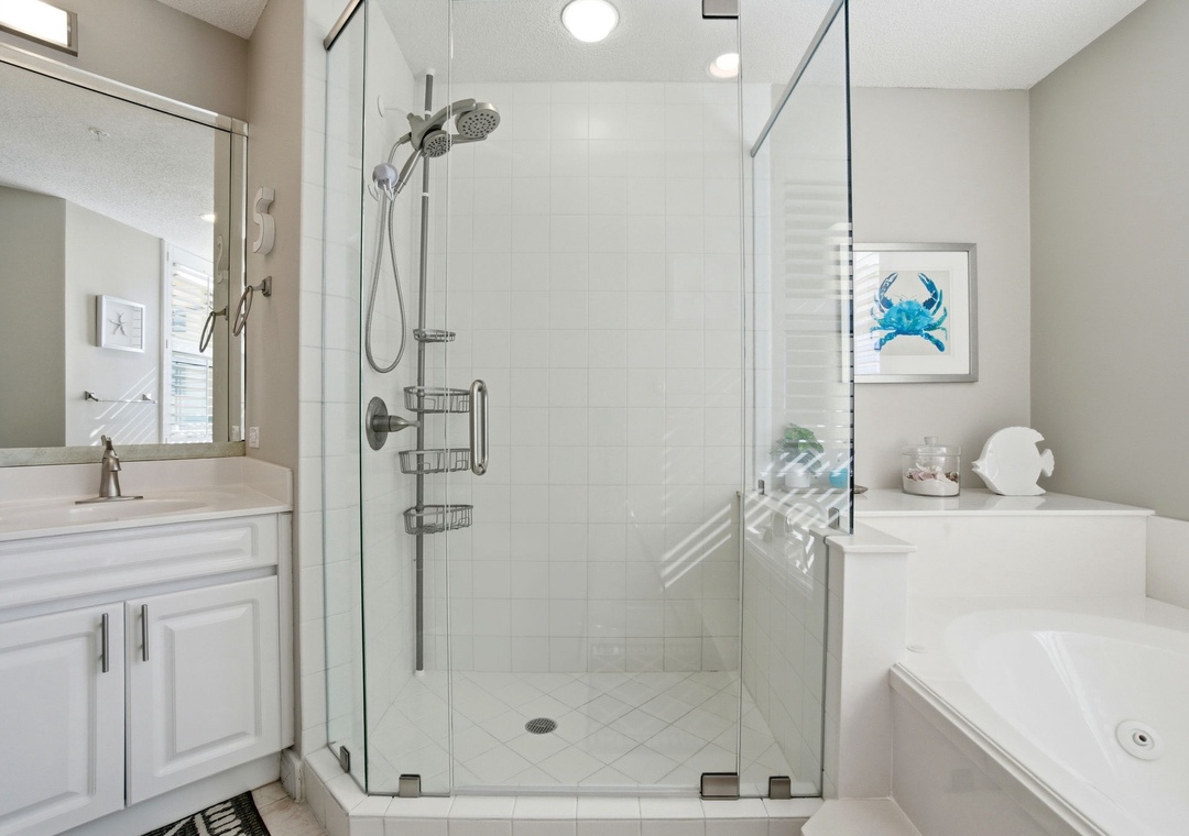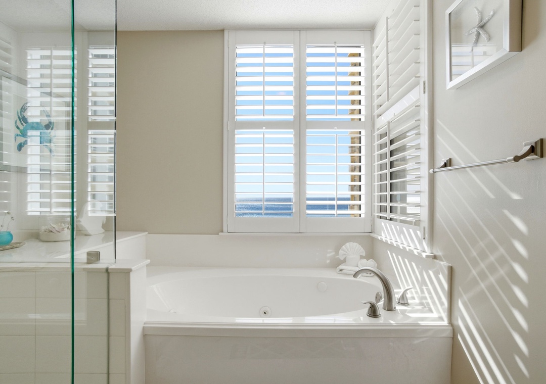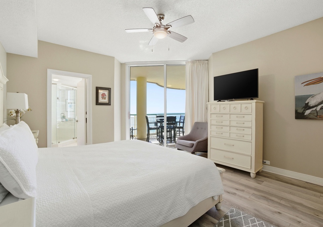 The master bedroom includes a plush king bed, a TV with expanded cable, a walk-in closet, and a private en-suite bathroom featuring a jetted tub with a scenic beach view. The first guest bedroom offers a king bed, a TV with expanded cable, and a private bathroom. The second guest bedroom is furnished with a queen bed, a TV with expanded cable, and convenient bathroom access.