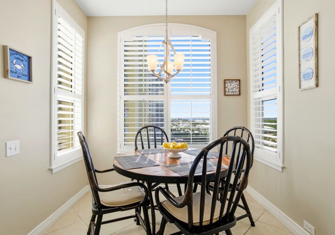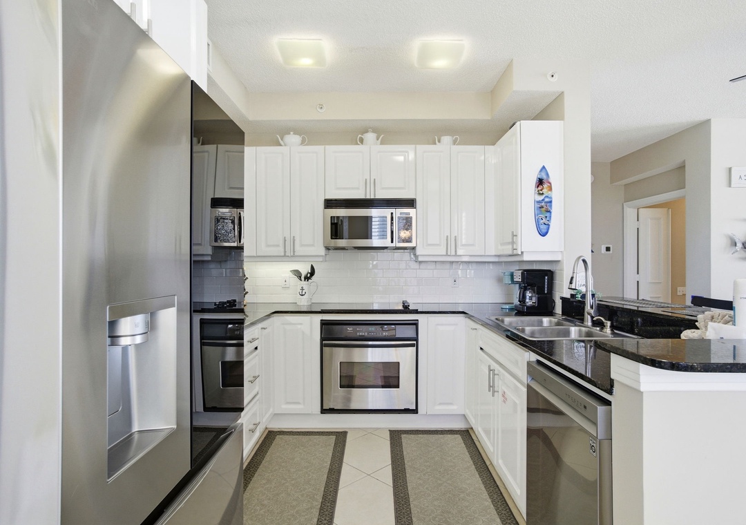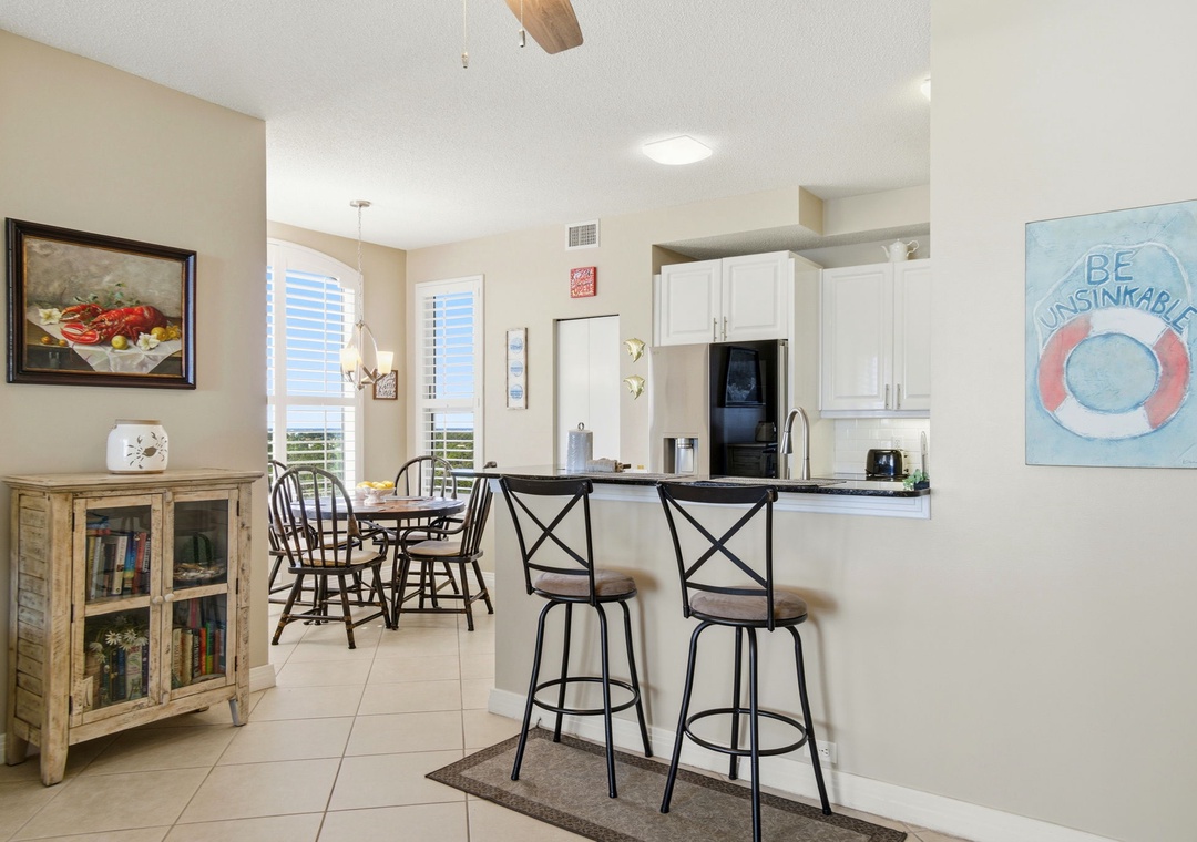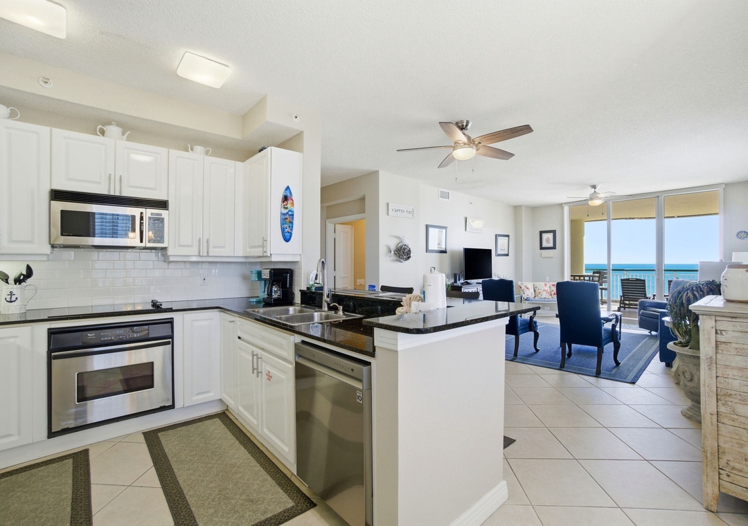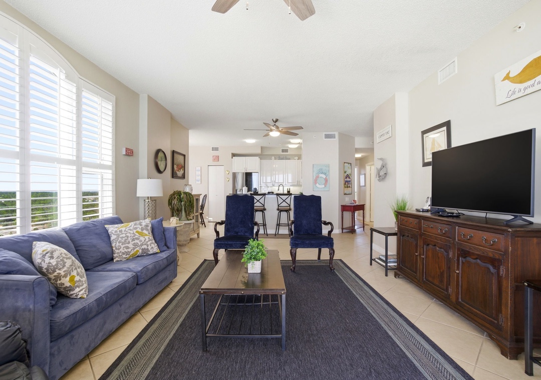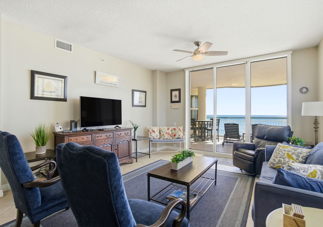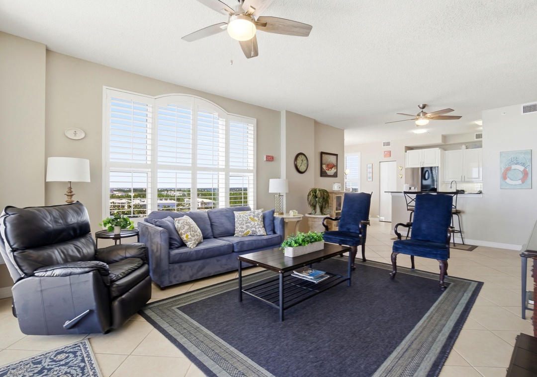 The interior is beautifully appointed and tastefully decorated throughout. Enjoy the company of friends and family in the living area, offering a sofa, two sitting chairs and a recliner. The sofa converts to a queen sleeper, allowing for up to 8 guests. A large balcony off the living room offers sweeping views and the perfect setting for rest and relaxation. The balcony also features a comfortable sitting area, ideal for enjoying morning coffee or unwinding in the afternoon.