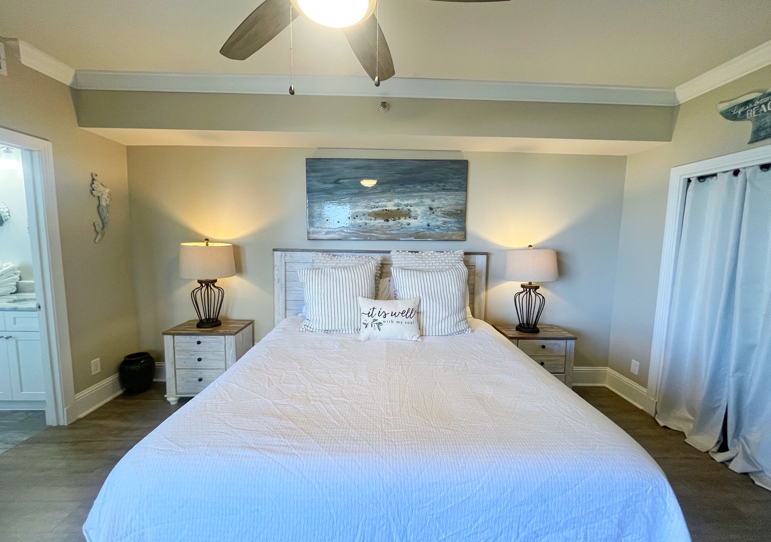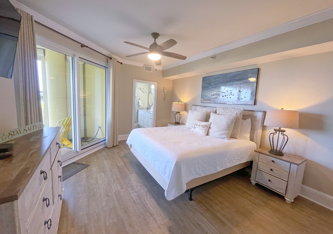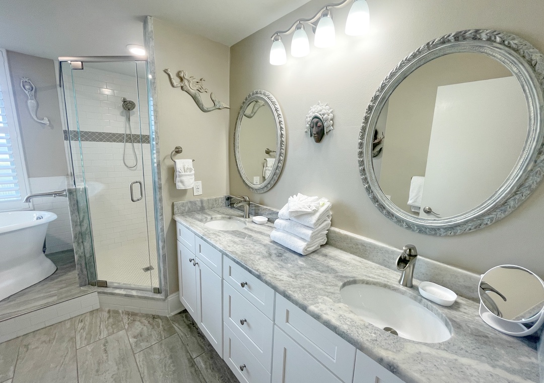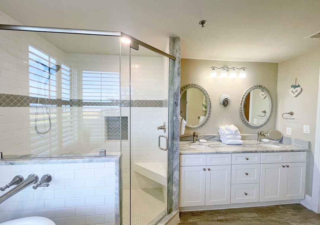 Rest and relaxation are guaranteed in the two luxuriously appointed bedrooms. The primary bedroom features premium king mattress, posh bedding, high-thread-count linens, and a flat-screen TV. Enjoy direct balcony access and a newly renovated ensuite with a large soaking tub, a separate walk-in shower, dual vanities, and plush 100% cotton bath towels. The guest bedroom offers two queen beds.