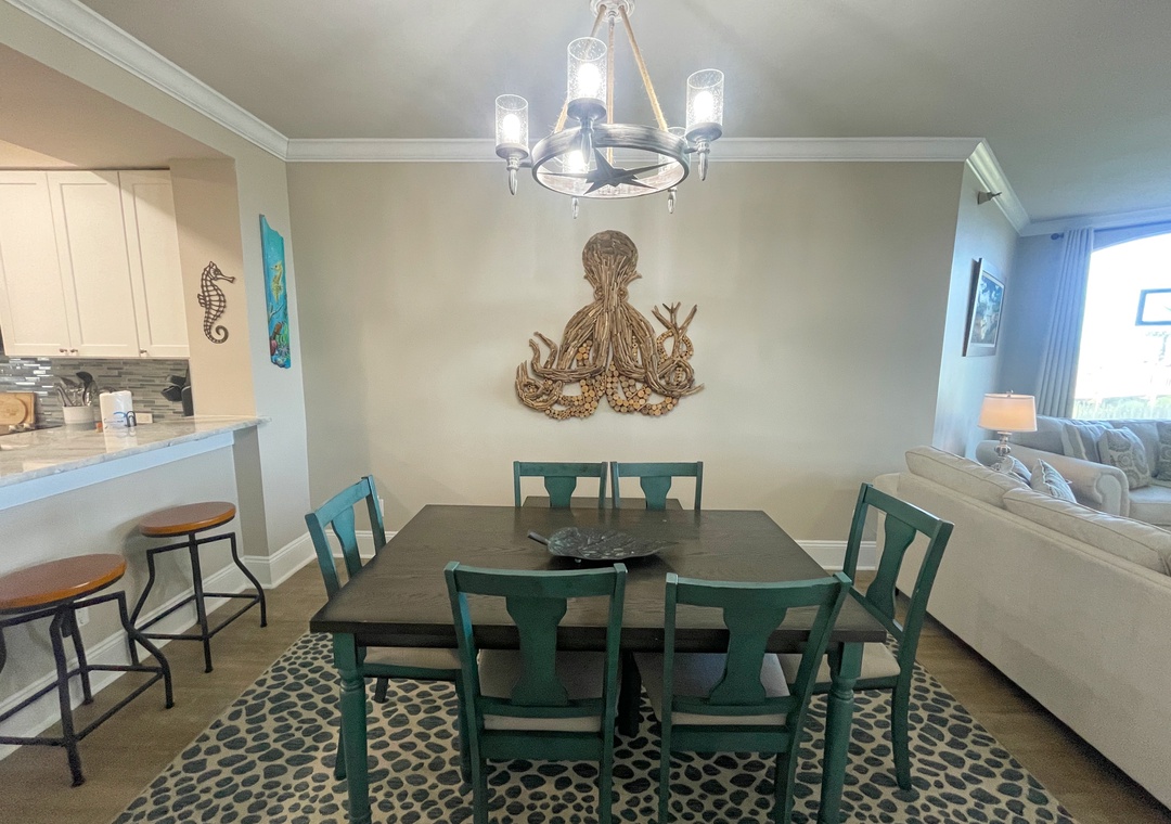 The gourmet kitchen is a chef's dream, equipped with top-of-the-line appliances, granite countertops, and all the dishware, cookware, and utensils you need to create your favorite meals. The living area is perfect for family movie nights, offering a comfortable sofa, loveseat and recliner. The sofa converts to a queen sleeper, accommodating a maximum of 8 guests.