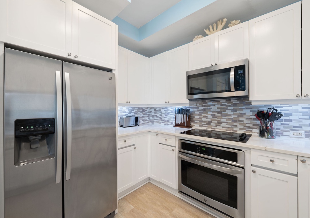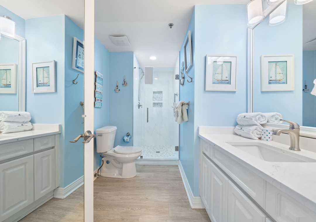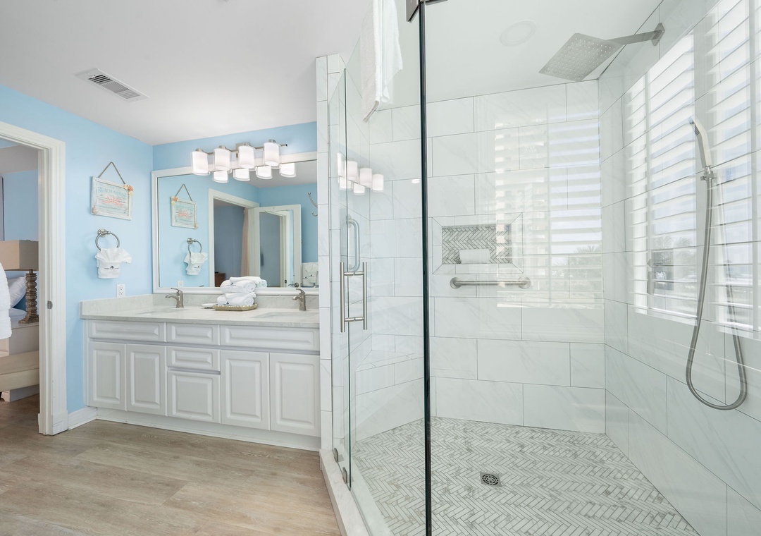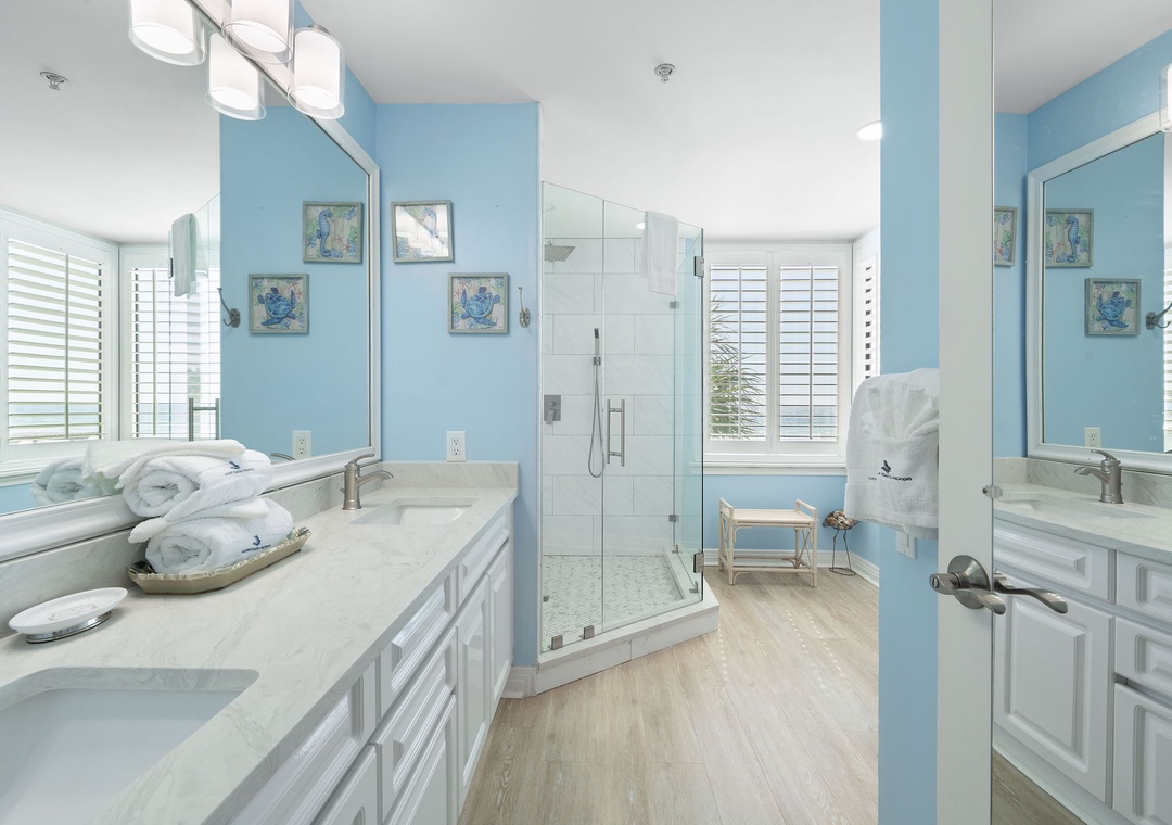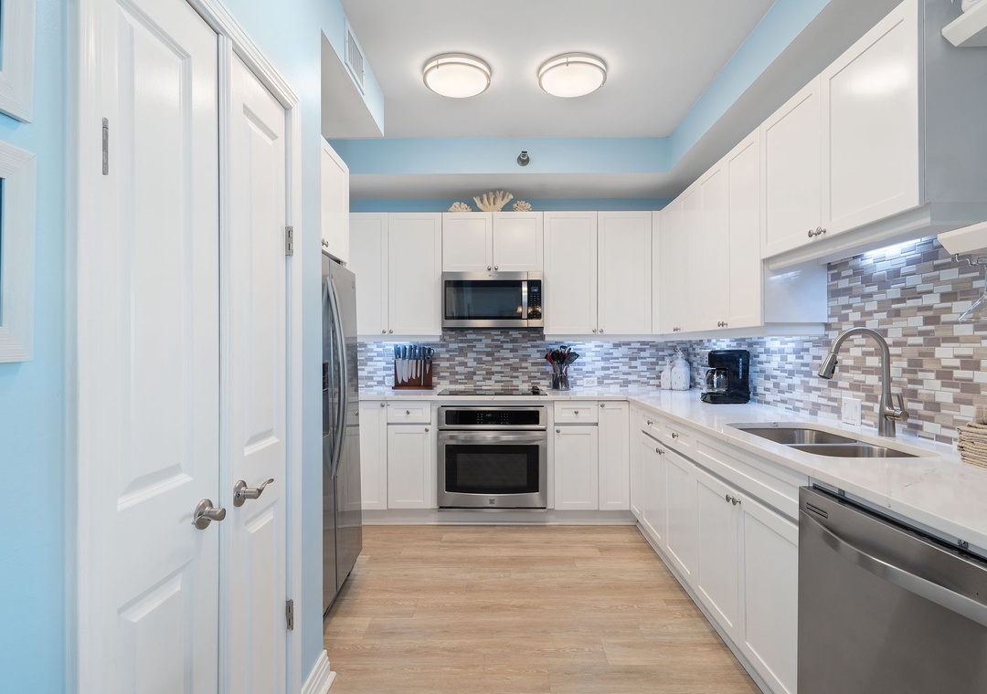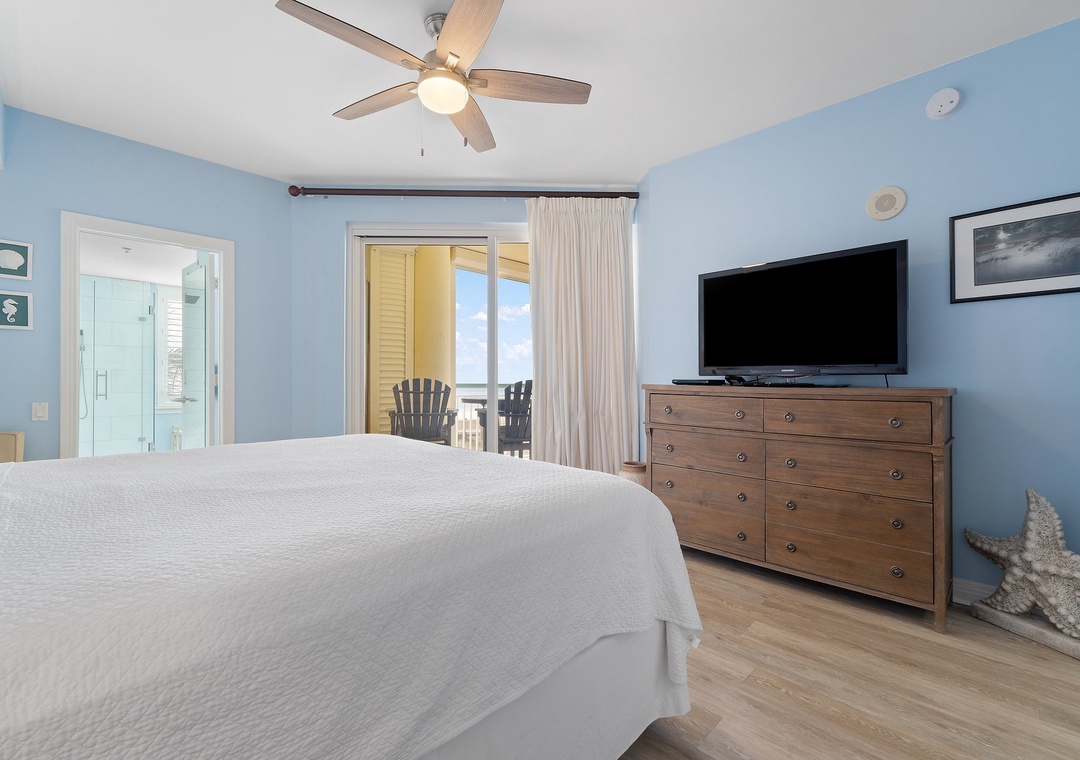 The fully equipped kitchen offers everything you’ll need to prepare a five-star meal, including granite countertops, side by side refrigerator with water/ice dispenser, smooth top cooktop, and more! The dining area features seating for 8-10, with an elegant table fit for a feast! You will love waking up to the magnificent view from the elegantly furnished master suite, which boasts a king bed with luxurious linens and bedding, a premium mattress, a brand-new LED television and its own access to the beachfront balcony! The ensuite bath features a gulf front elevated 2-person jetted tub, a separate glass and tile shower and double vanities. The additional bedrooms are equally sophisticated, with king bed and luxury accents in the second bedroom and one queen and twin bunk beds in the third bedroom. Each bedroom offers an attached bath, and deluxe bedding and mattresses.