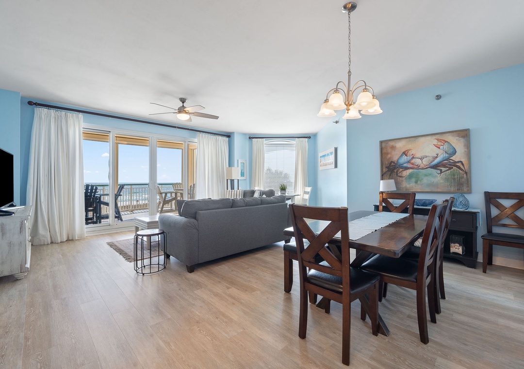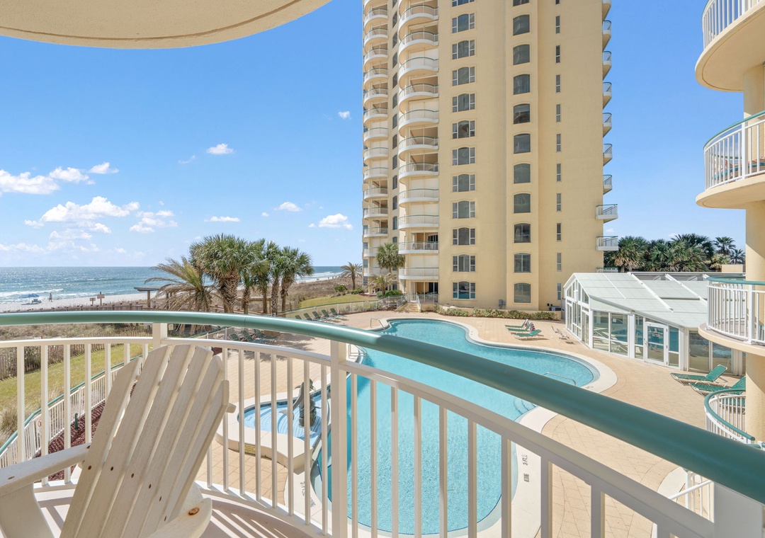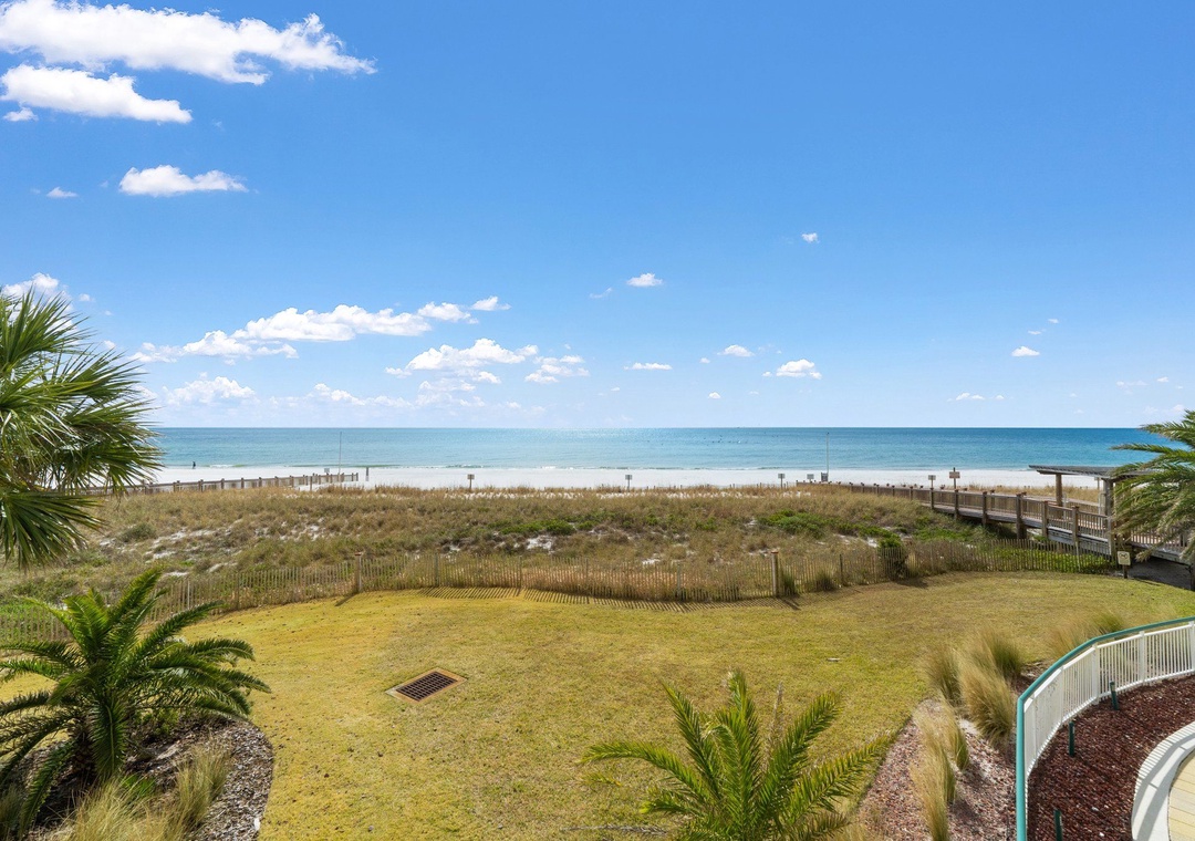 This exquisitely decorated 2nd floor unit is adorned in a modern beach-chic décor, featuring designer furnishings, brand new flat screen TVs, and luxury touches throughout. The living area hosts hardwood flooring, a plush sofa plus additional chairs, a large LCD television, and beachfront balcony access! Floor-to-ceiling sliding glass doors open to the oversized covered terrace, and with an outdoor table with seating for ten, you can wake up with your morning coffee, savor a glass of vintage vino, and even delight in fresh Gulf fare, all while the serenity and beauty of the sand and sea soothe you into serenity.