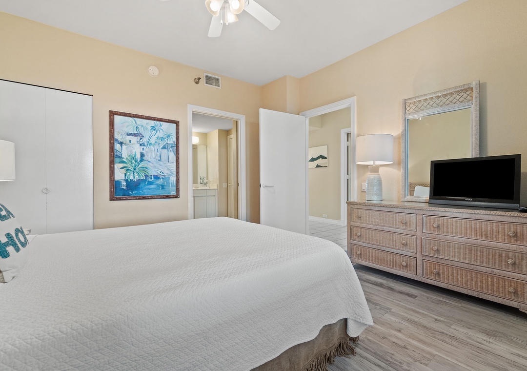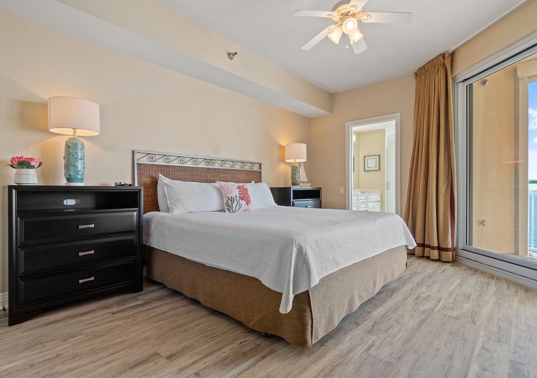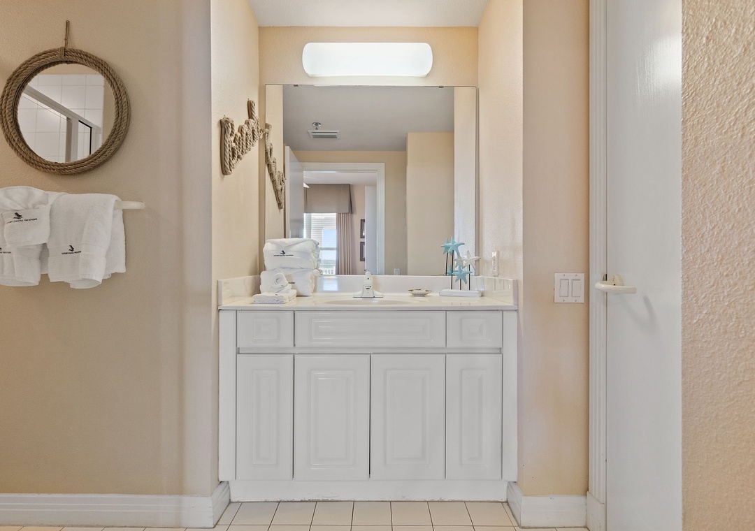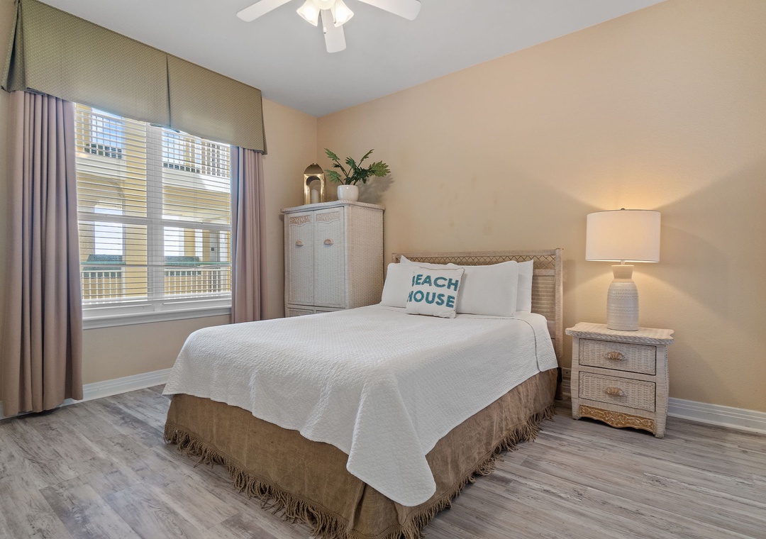 The master suite is a serene retreat, boasting a premium king-size bed and direct access to the beachfront balcony. The attached master bath is equally impressive, featuring a jetted tub, a separate walk-in shower, and dual vanities. The second bedroom offers an ultra-comfortable queen-size bed, while the third bedroom features a full-over-full bunk bed with a twin trundle. There's also a queen sleeper sofa for additional guests.