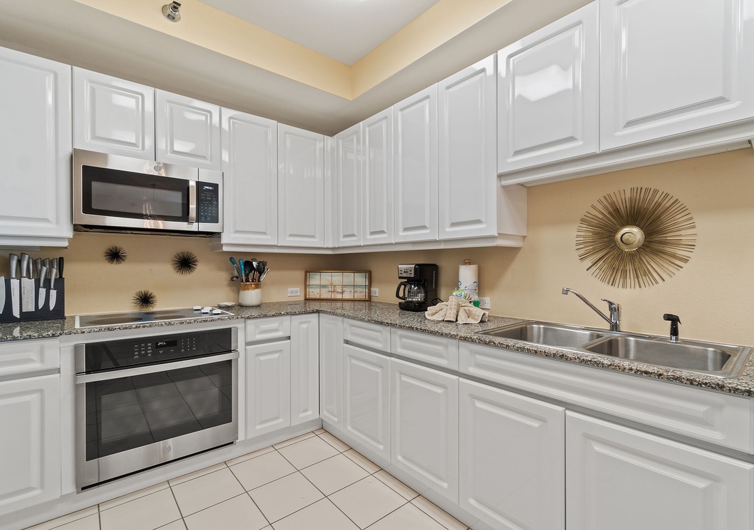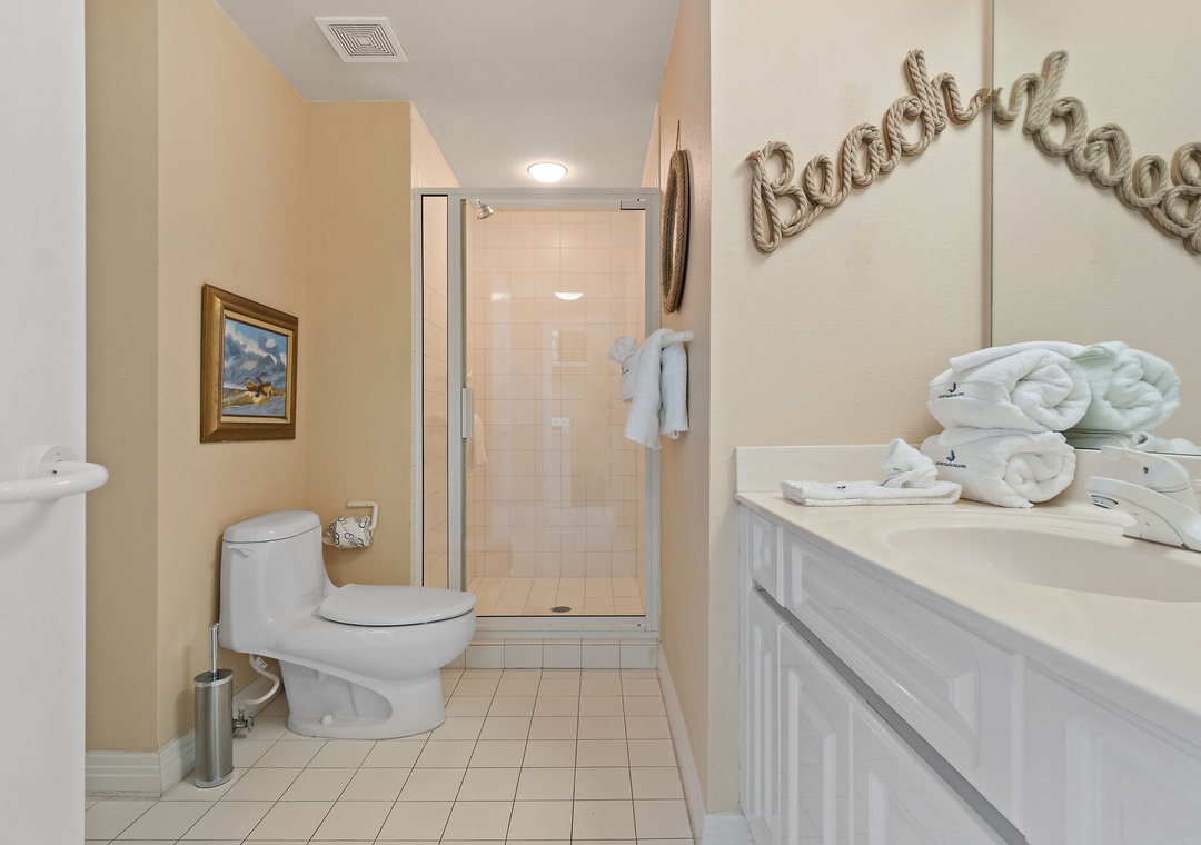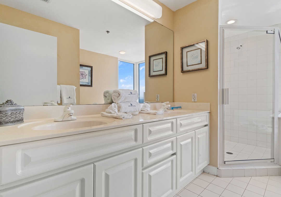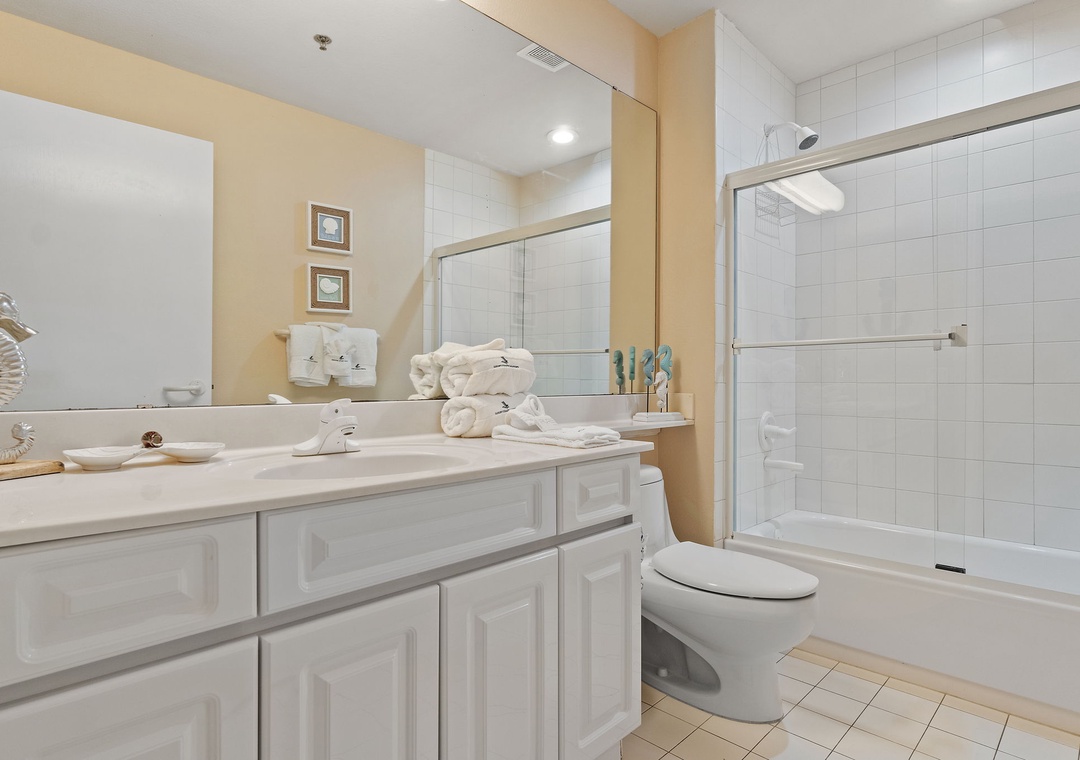 The master suite is a serene retreat, boasting a premium king-size bed and direct access to the beachfront balcony. The attached master bath is equally impressive, featuring a jetted tub, a separate walk-in shower, and dual vanities. The second bedroom offers an ultra-comfortable queen-size bed, while the third bedroom features a full-over-full bunk bed with a twin trundle. There's also a queen sleeper sofa for additional guests.