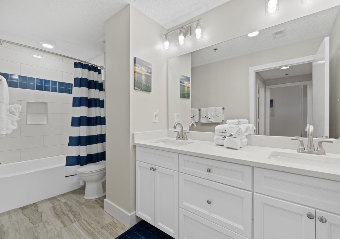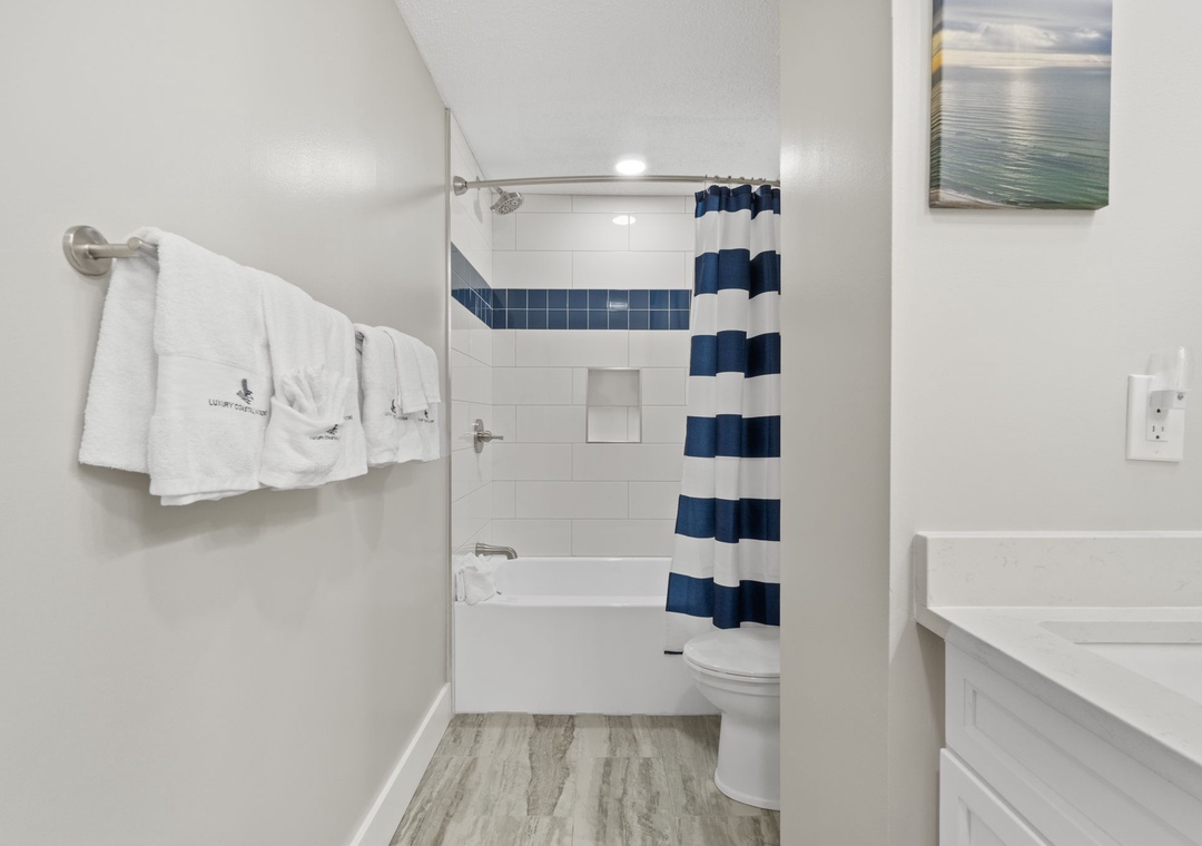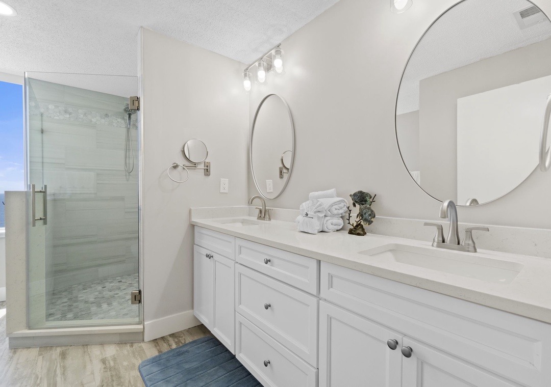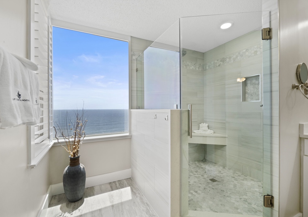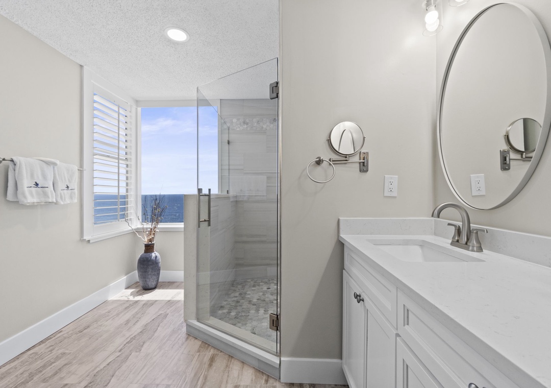 Both bedrooms are designed for ultimate comfort, featuring premium mattresses, posh bedding, high-thread-count linens, and flat-screen TVs. The master bedroom also includes balcony access and a large walk-in closet. Newly renovated bathrooms include double vanities and luxurious 100% cotton bath towels in both, a bathtub with shower in the secondary, and a large walk-in spa shower with ocean views in the primary.