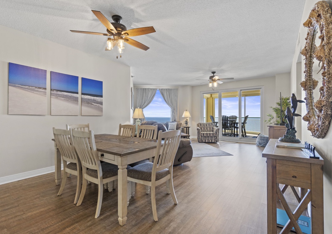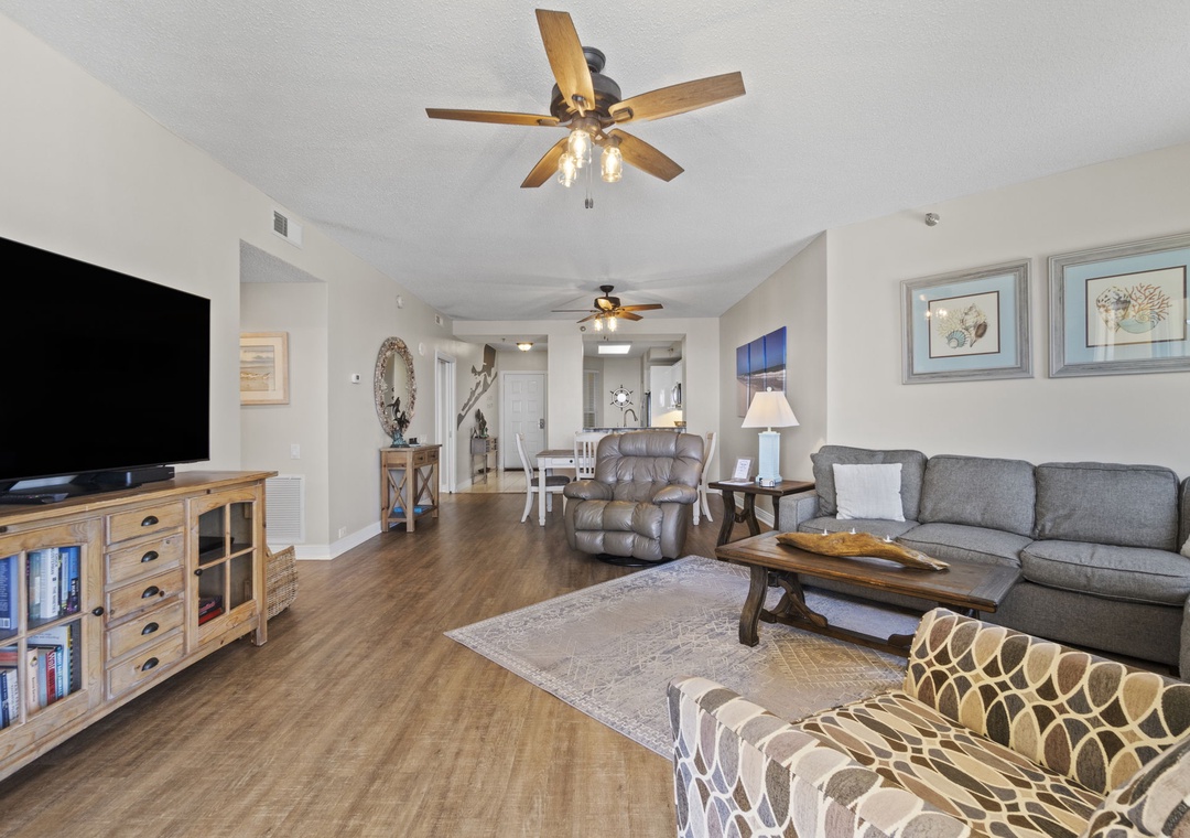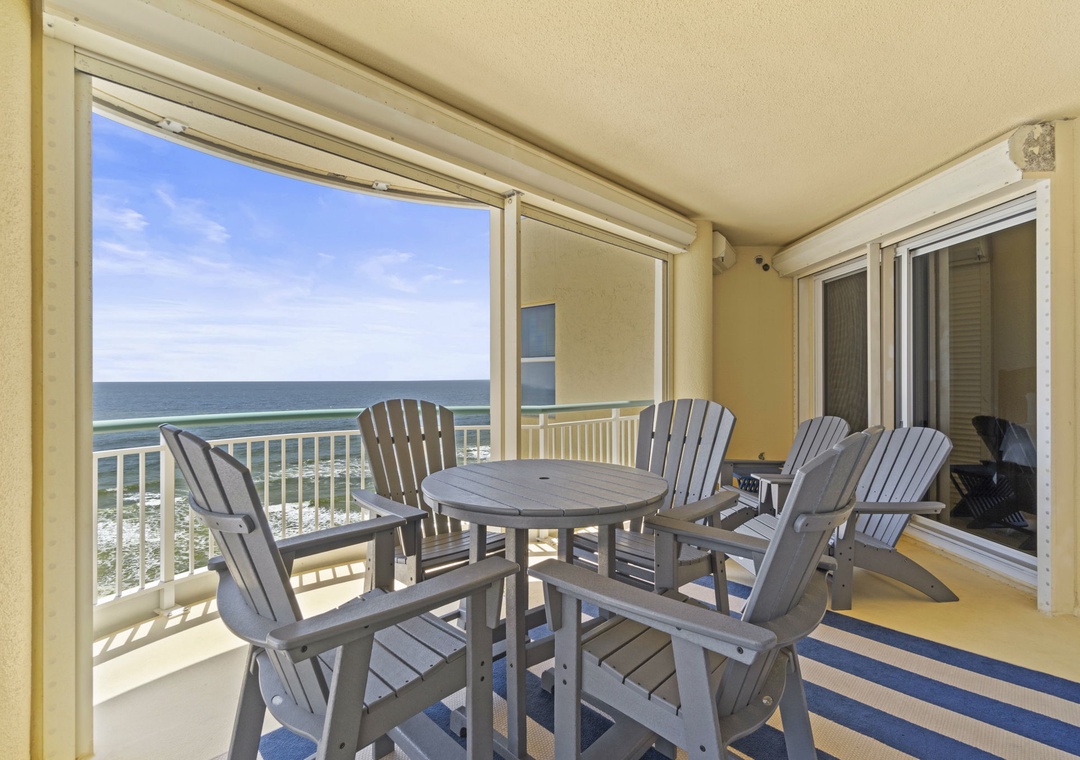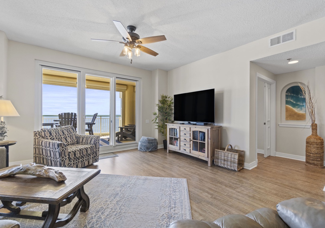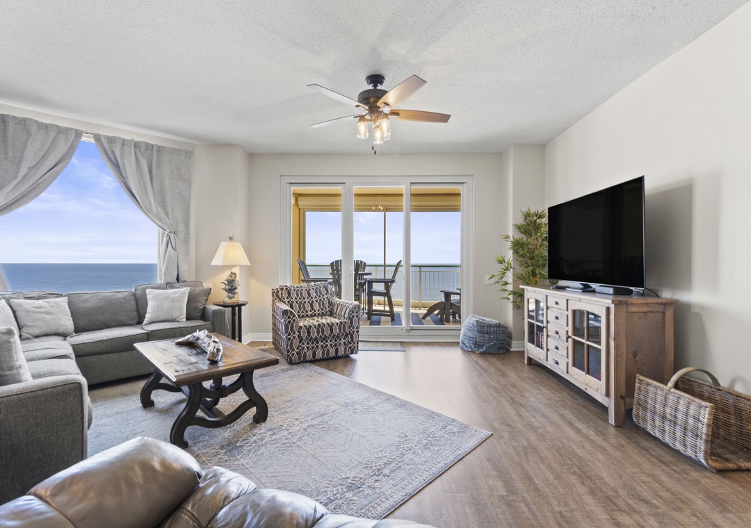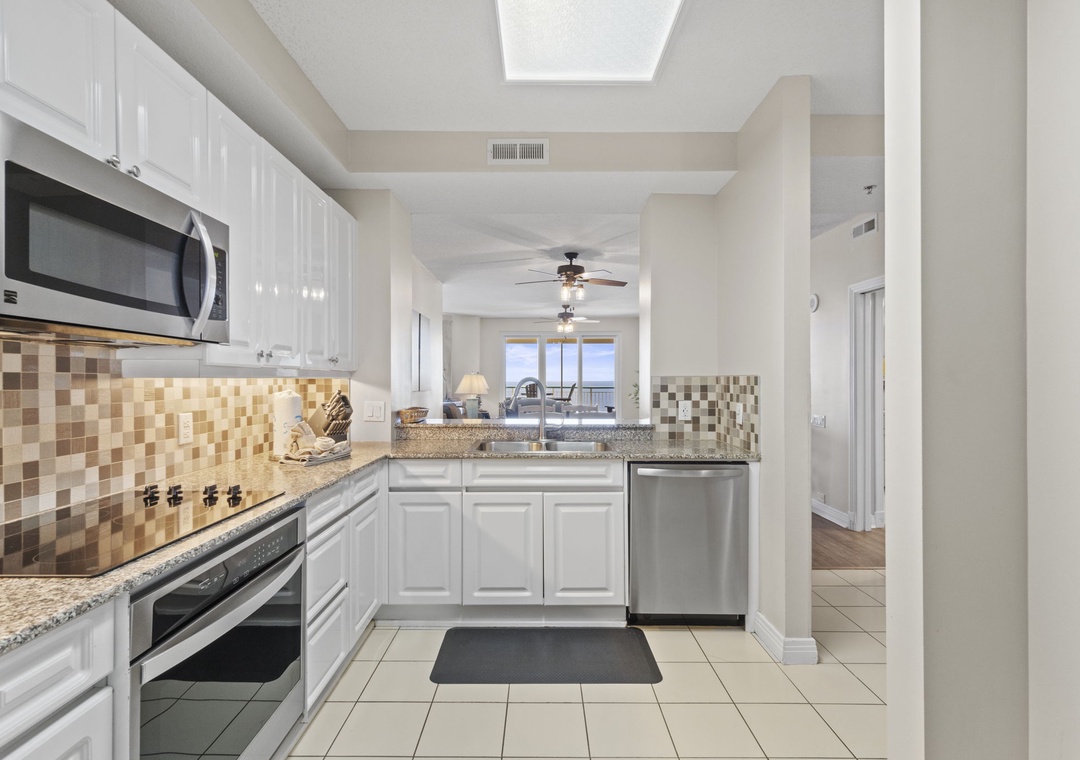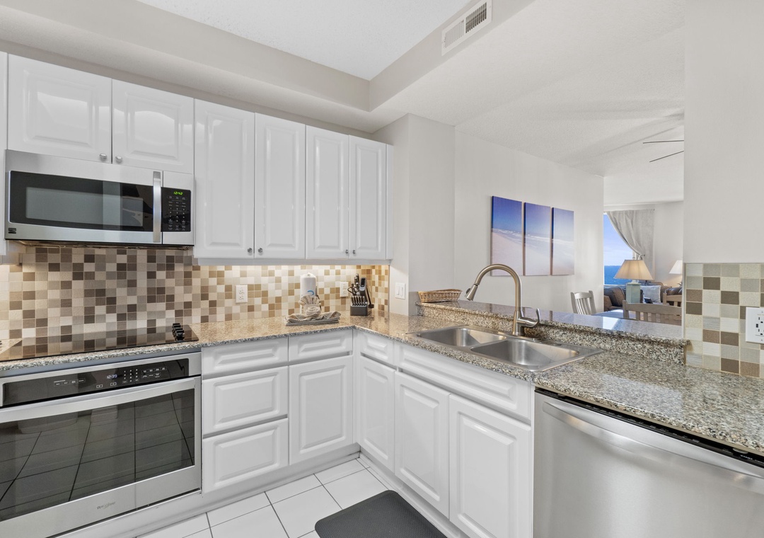 The open and spacious floor plan is enhanced by premium designer furnishings and breathtaking views of the Gulf of Mexico. Step out onto the expansive beachfront balcony, where panoramic vistas and the soothing sounds of the waves will melt away your stress. The gourmet kitchen is a chef's dream, featuring top-of-the-line appliances, granite countertops, and all the dishware, cookware, and utensils you need to create culinary masterpieces. The living area is the ideal spot for family movie nights, with a plush L-shaped sectional, a cushioned chair, and a large flat-screen HDTV.