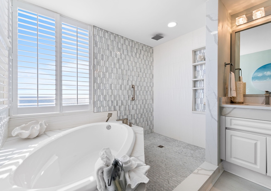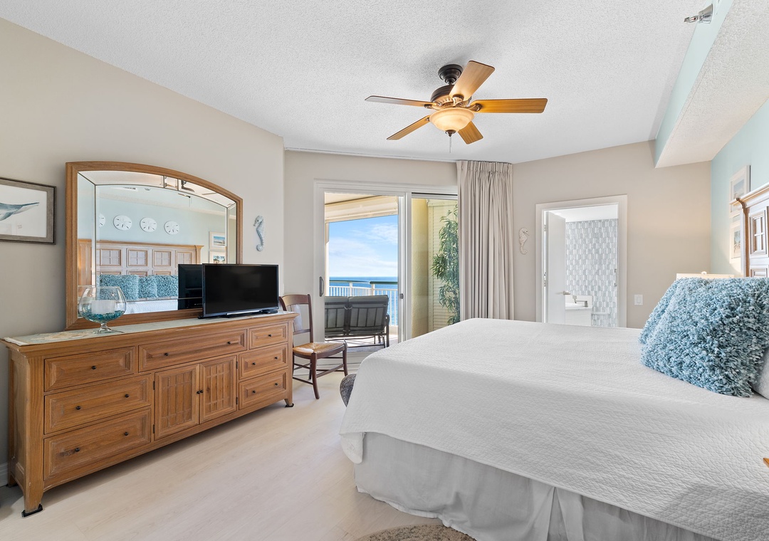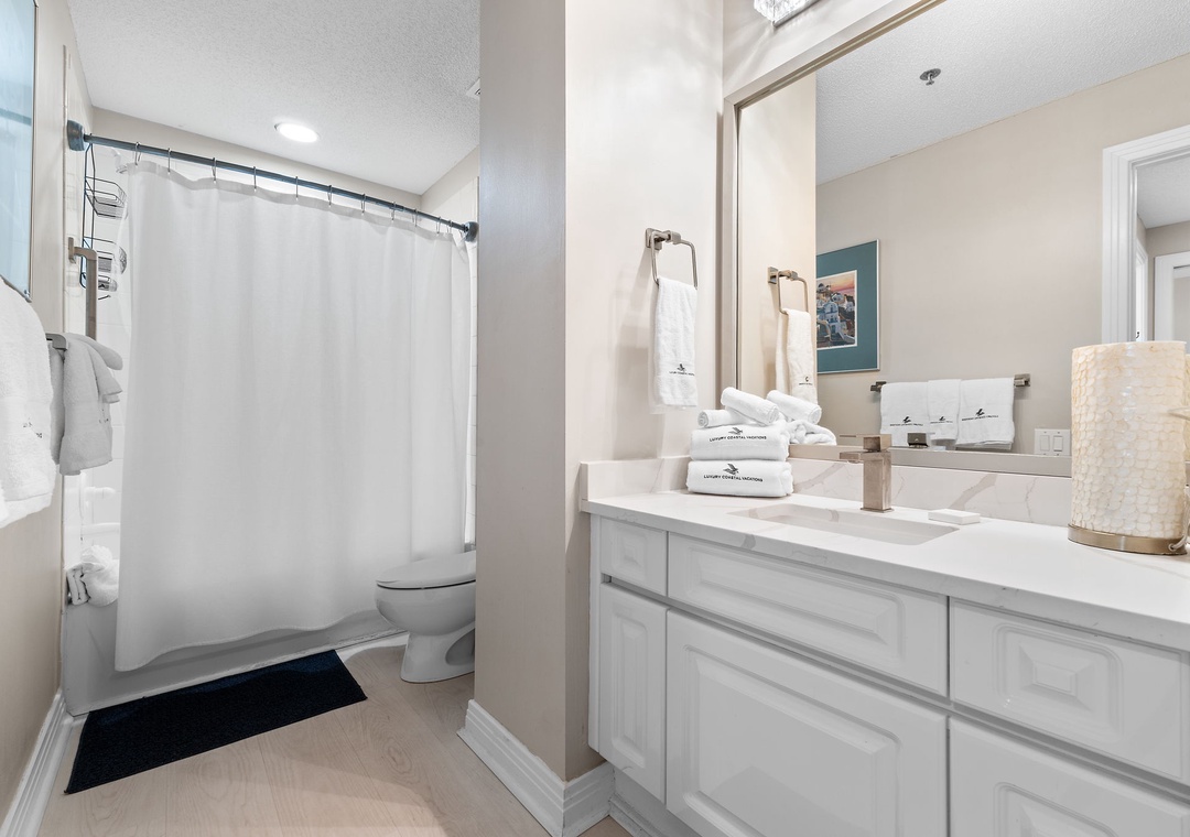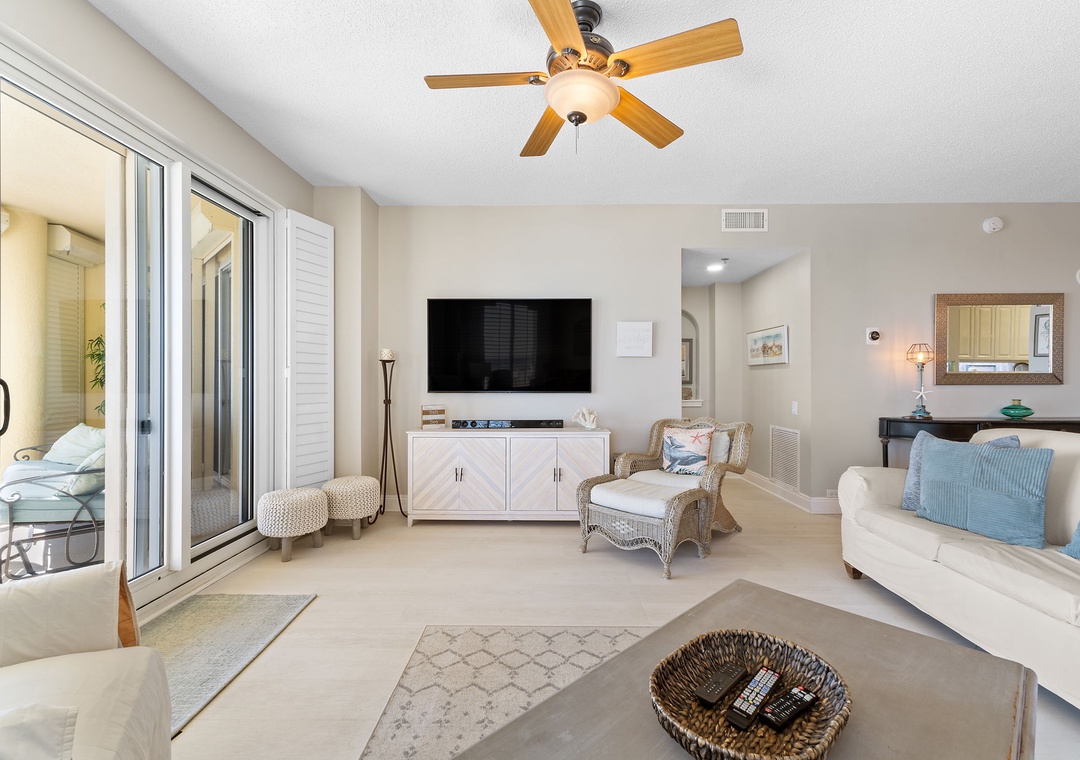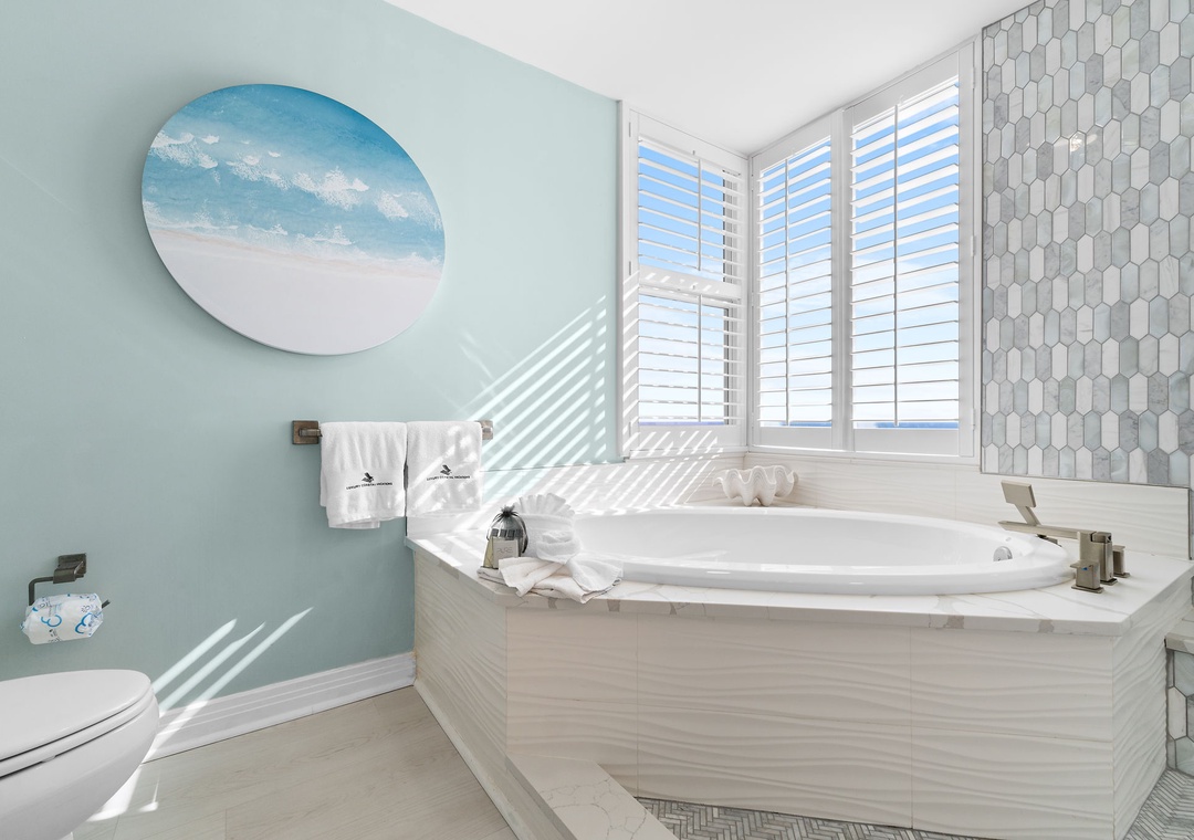 Rest and relaxation are guaranteed in the two luxuriously appointed bedrooms, each featuring premium king mattresses, posh bedding, high-thread-count linens, and flat-screen TVs. The master bedroom offers direct balcony access and an ensuite glamour bath with a large jetted tub, a separate walk-in shower, dual vanities, and plush 100% cotton bath towels. For extra guests, the living room sofa converts into a queen sleeper, comfortably accommodating up to six guests.
